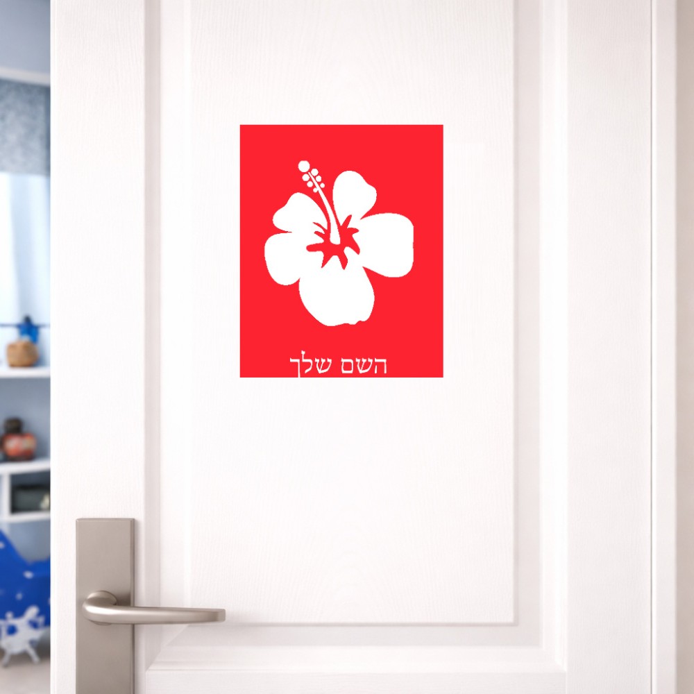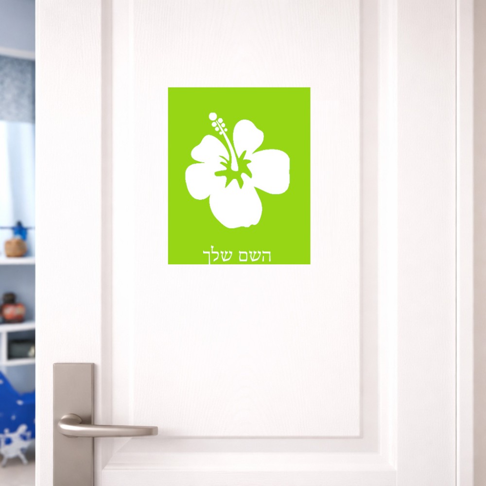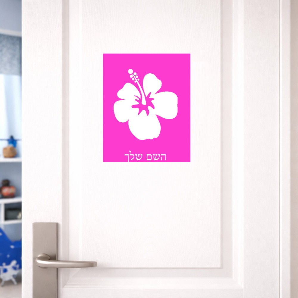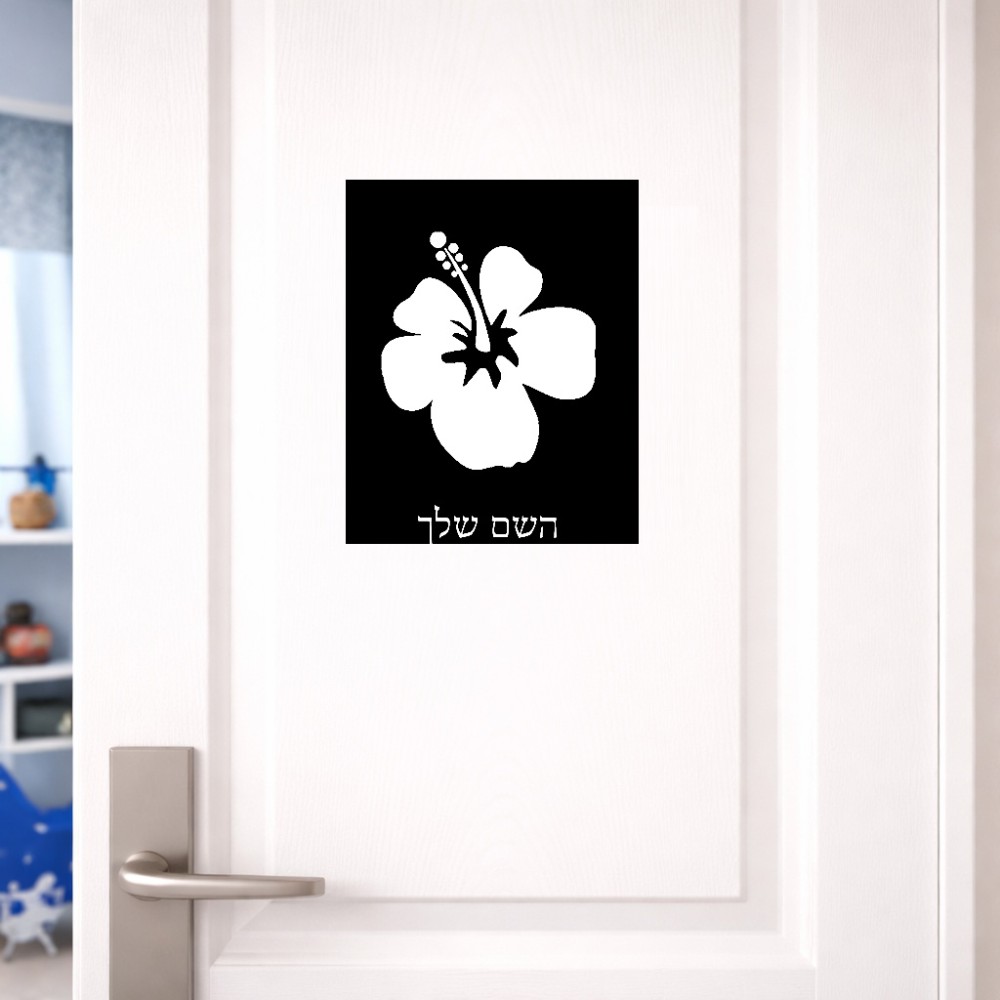 שלט אלומיניום גדול לחדר בעיצוב אישי עם השם שלך בעיצוב פרח היביסקוס גודל השלט 20 × 25 ס"מ. את השם המבוקש ניתן לציין בהזמנה, אם לא צויין אנחנו ניצור קשר לבירור.