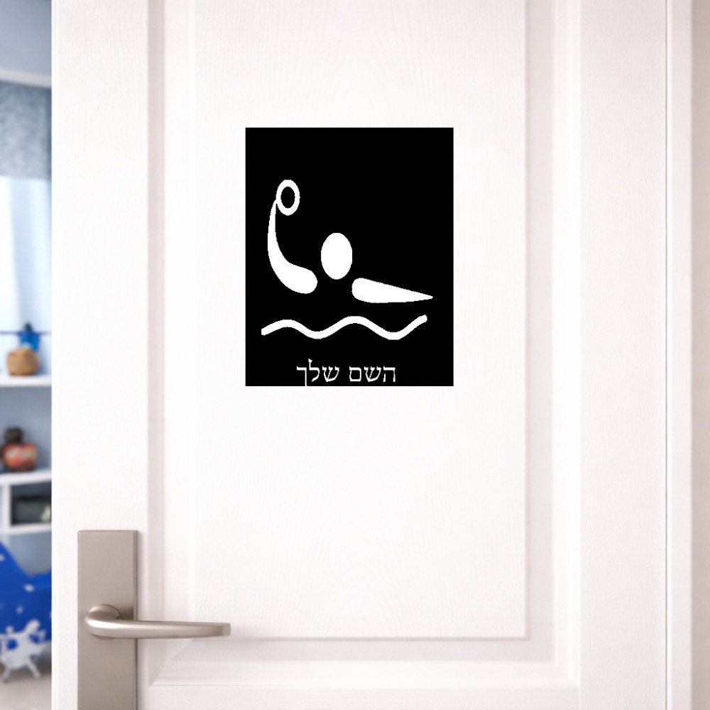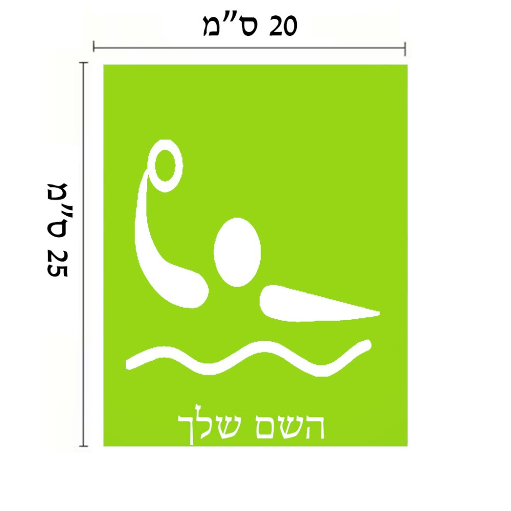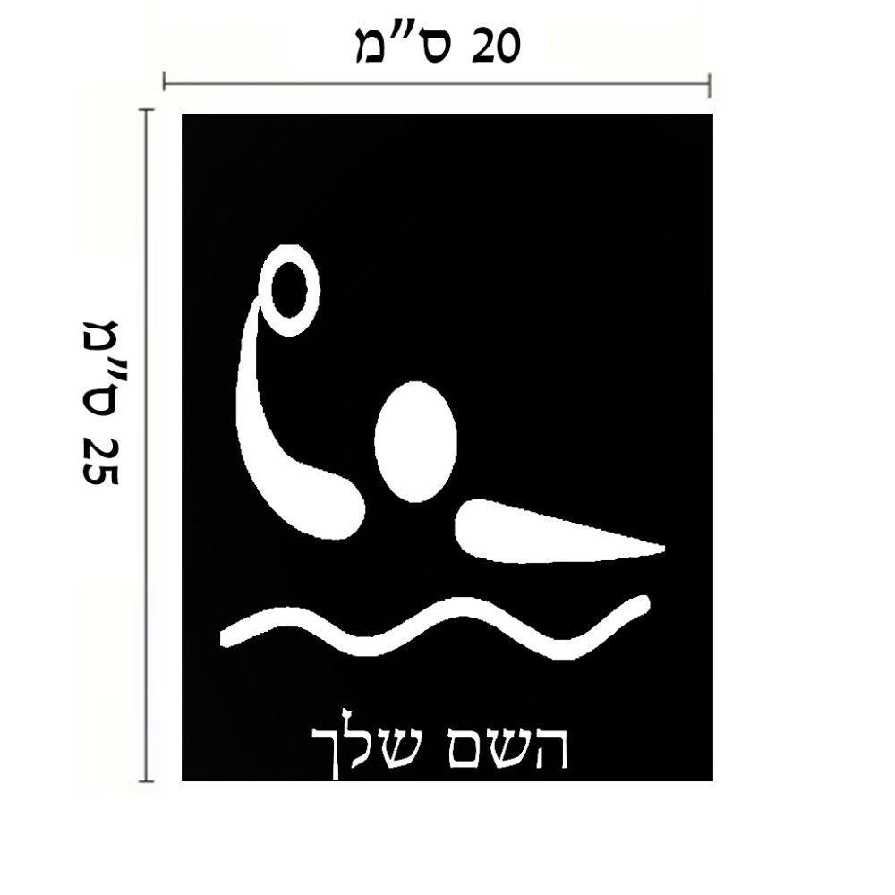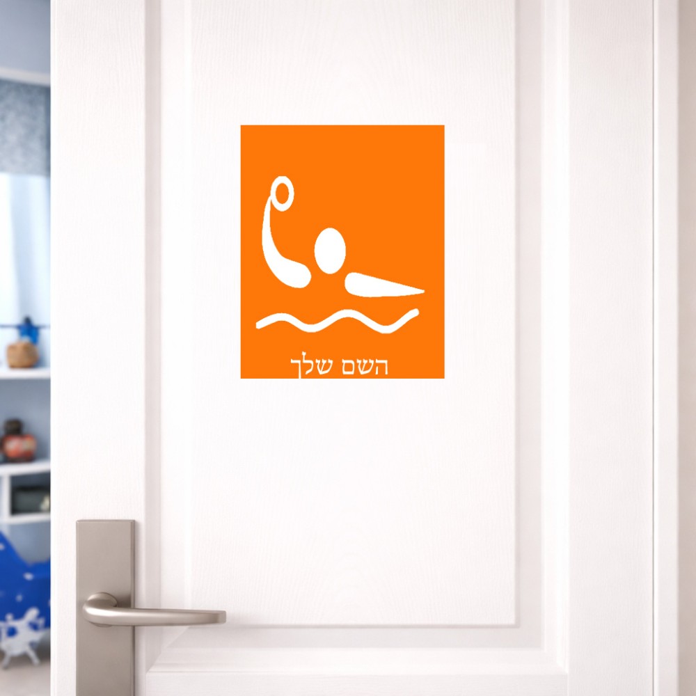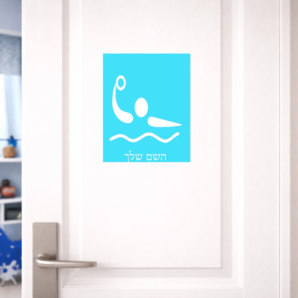 שלט אלומיניום גדול לחדר בעיצוב אישי עם השם שלך בעיצוב כדור מים אולימפי גודל השלט 20 × 25 ס"מ. את השם המבוקש ניתן לציין בהזמנה, אם לא צויין אנחנו ניצור קשר לבירור.