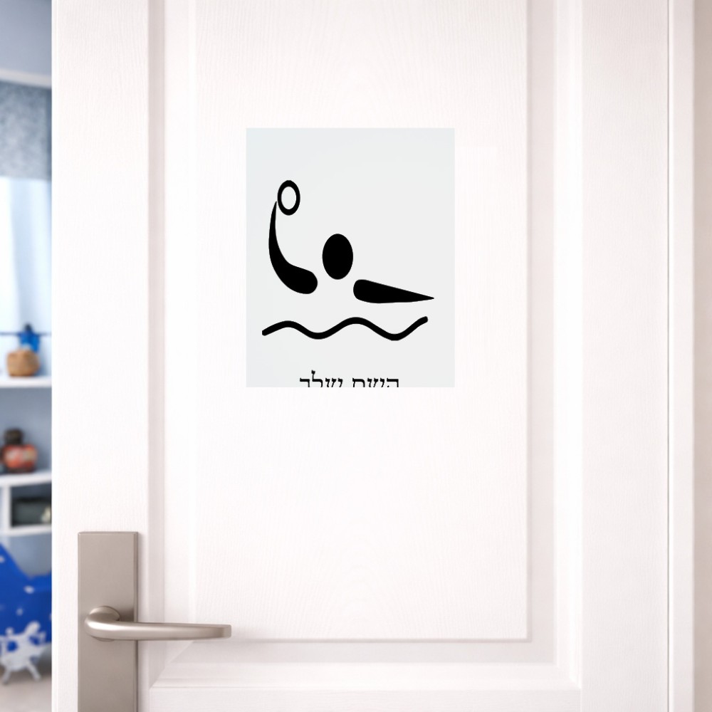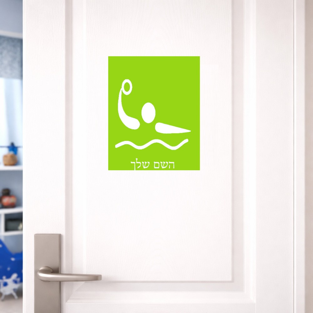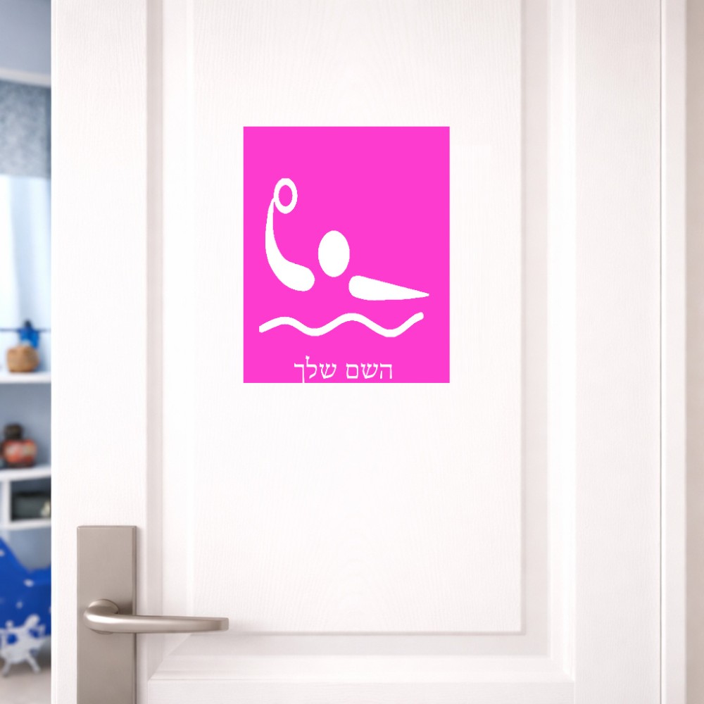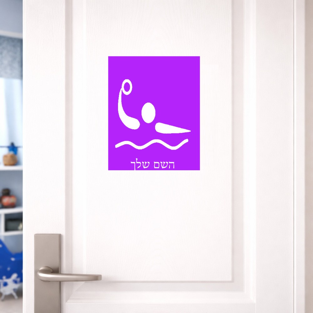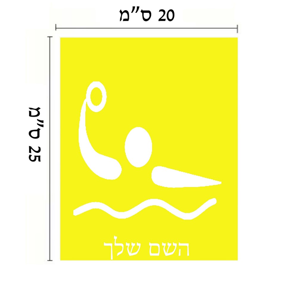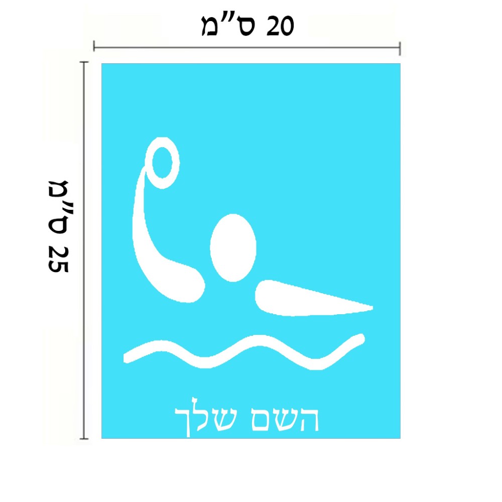 שלט אלומיניום גדול לחדר בעיצוב אישי עם השם שלך בעיצוב כדור מים אולימפי גודל השלט 20 × 25 ס"מ. את השם המבוקש ניתן לציין בהזמנה, אם לא צויין אנחנו ניצור קשר לבירור.