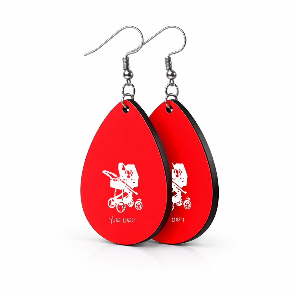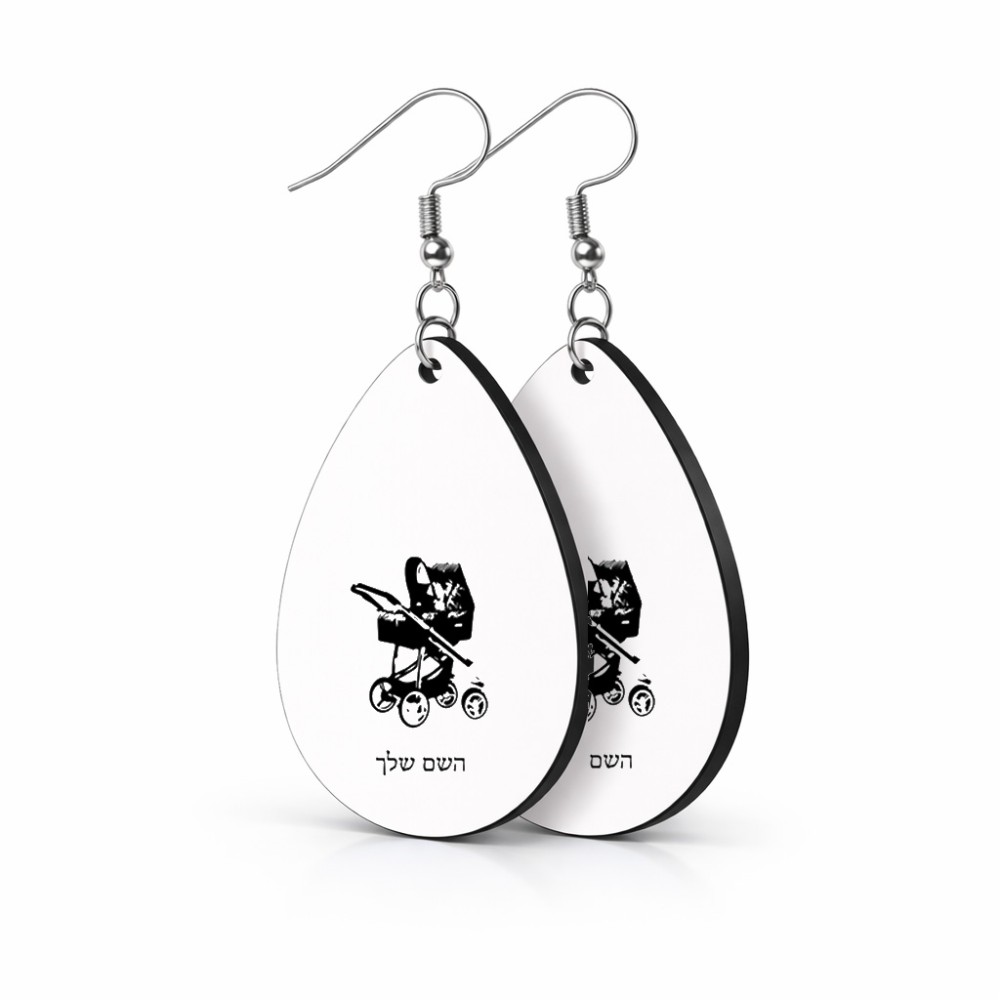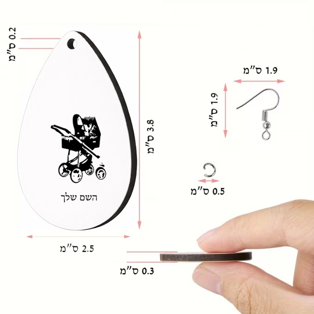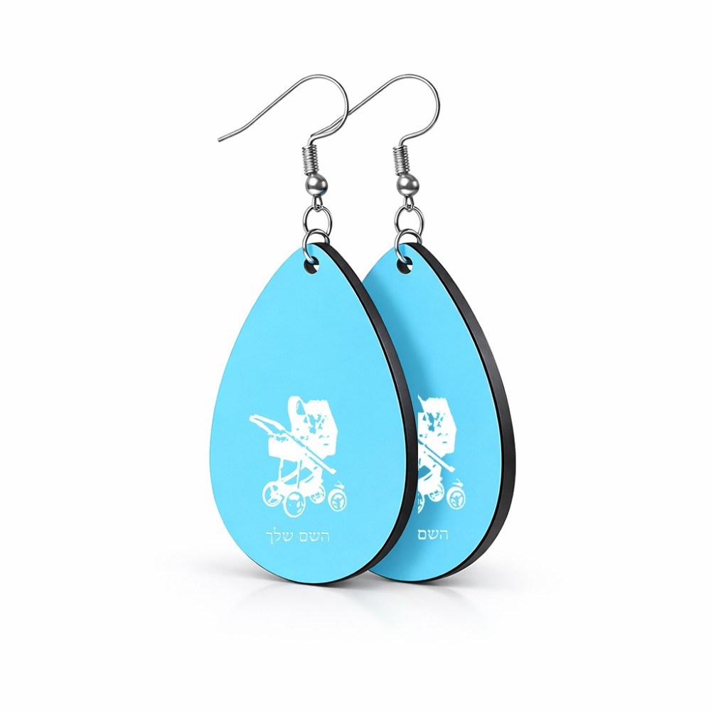 זוג עגילים בצורת טיפה בעיצוב אישי עם השם שלך בעיצוב עגלת תינוק גודל העגילים 2.5 × 3.8 ס"מ. את השם המבוקש ניתן לציין בהזמנה, אם לא צויין אנחנו ניצור קשר לבירור.