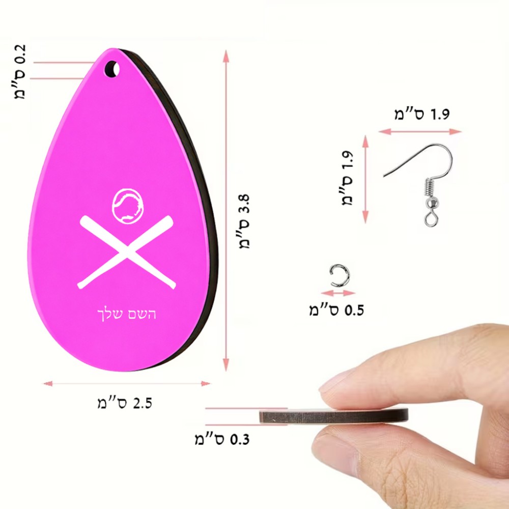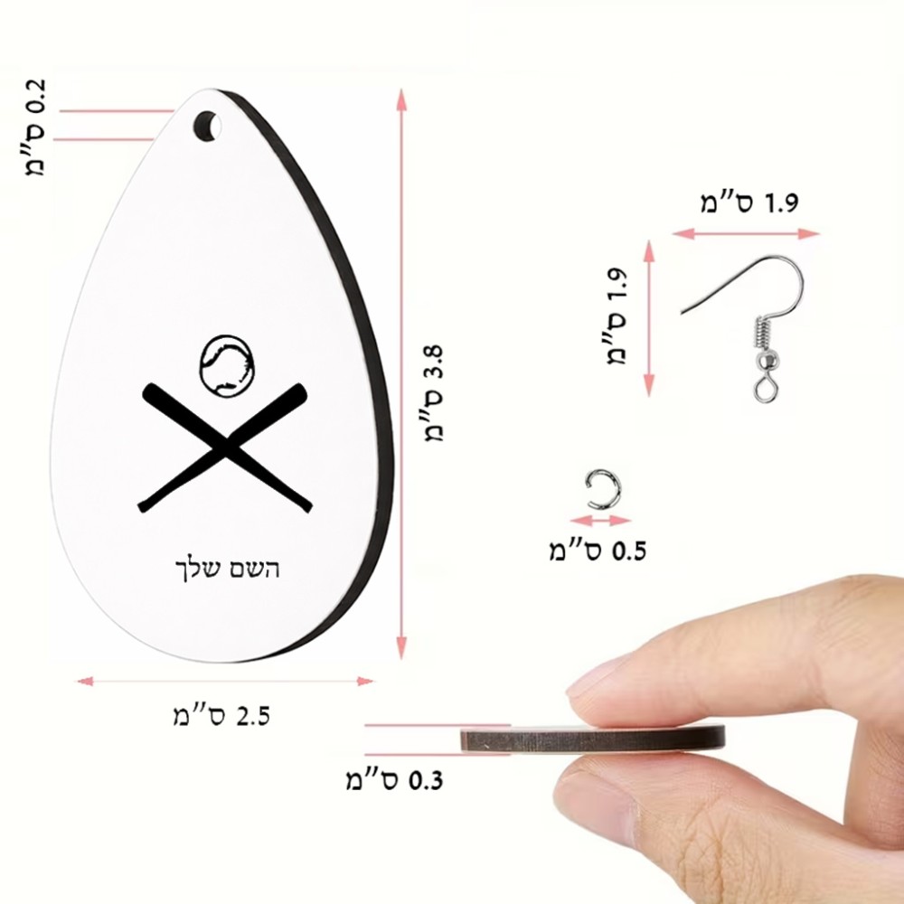 זוג עגילים בצורת טיפה בעיצוב אישי עם השם שלך בעיצוב כדור בסיס גודל העגילים 2.5 × 3.8 ס"מ. את השם המבוקש ניתן לציין בהזמנה, אם לא צויין אנחנו ניצור קשר לבירור.