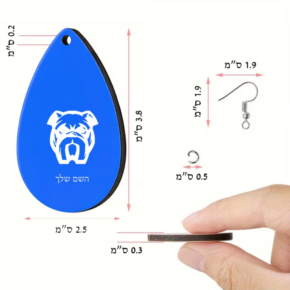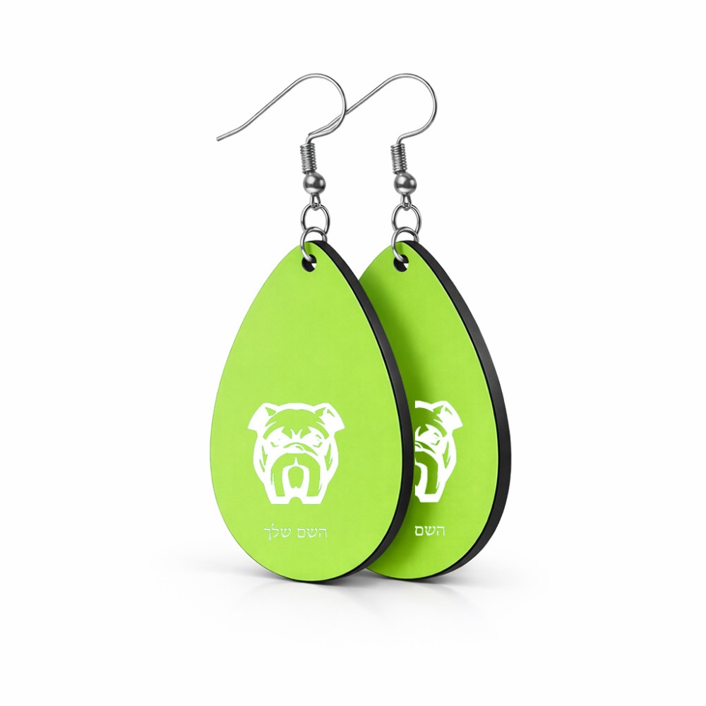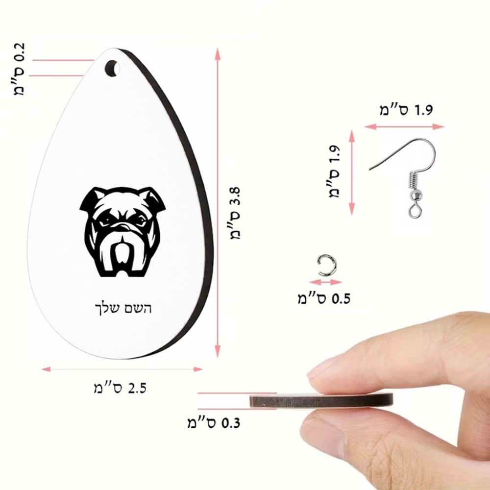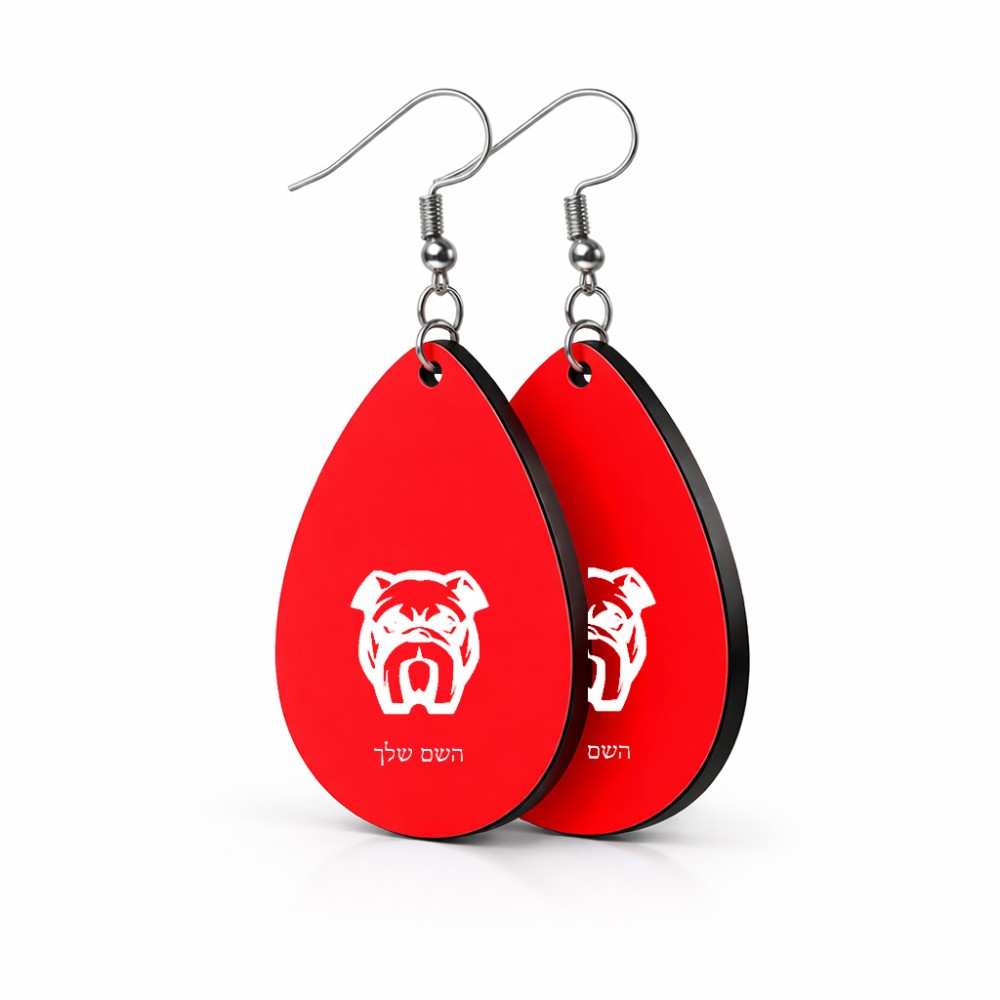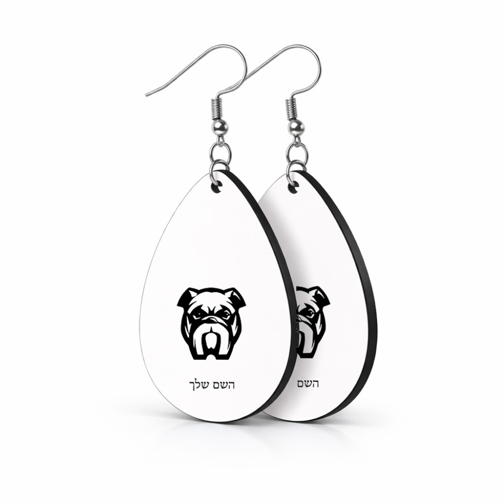 זוג עגילים בצורת טיפה בעיצוב אישי עם השם שלך בעיצוב פרצוף בולדוג גודל העגילים 2.5 × 3.8 ס"מ. את השם המבוקש ניתן לציין בהזמנה, אם לא צויין אנחנו ניצור קשר לבירור.