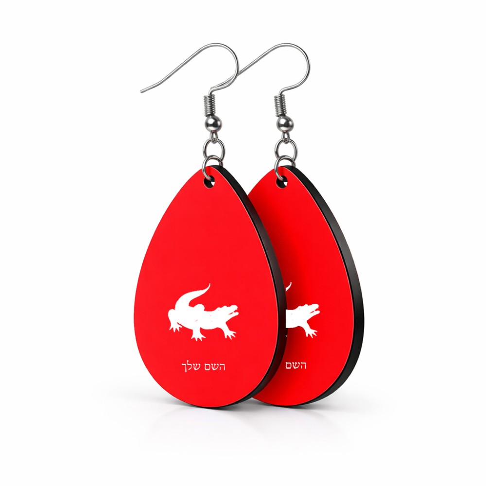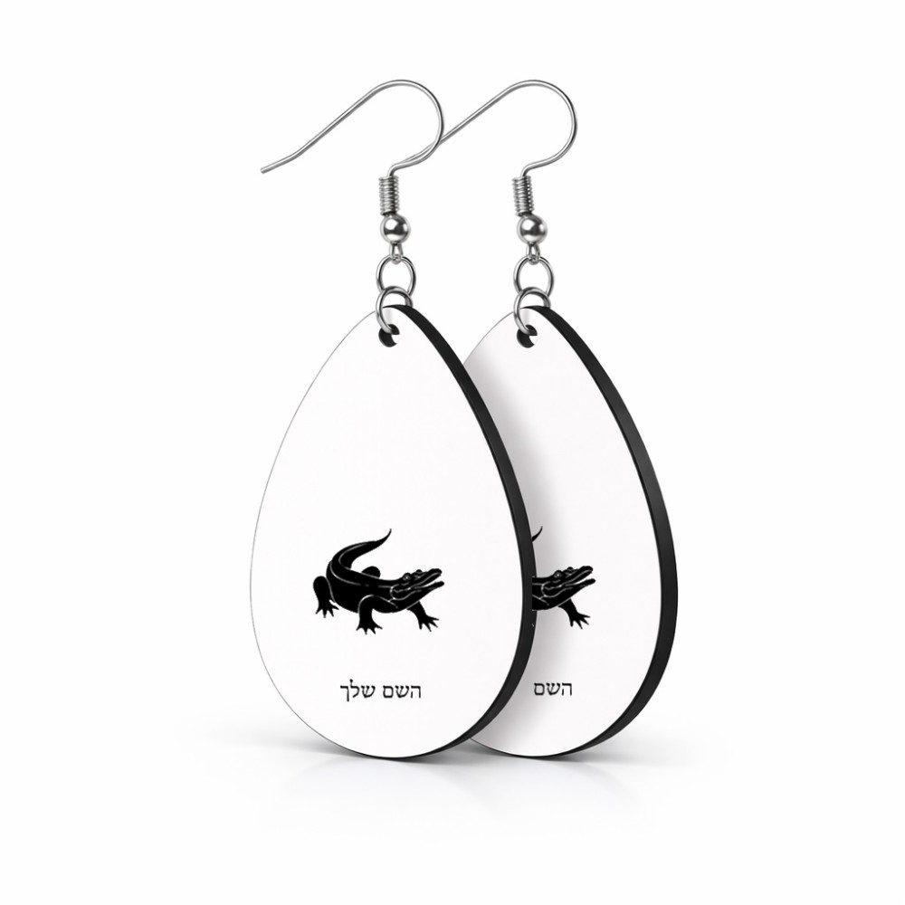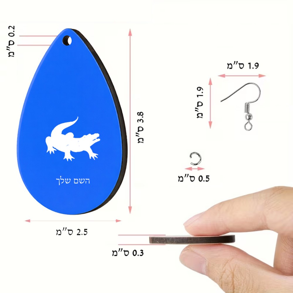 זוג עגילים בצורת טיפה בעיצוב אישי עם השם שלך בעיצוב תנין גודל העגילים 2.5 × 3.8 ס"מ. את השם המבוקש ניתן לציין בהזמנה, אם לא צויין אנחנו ניצור קשר לבירור.