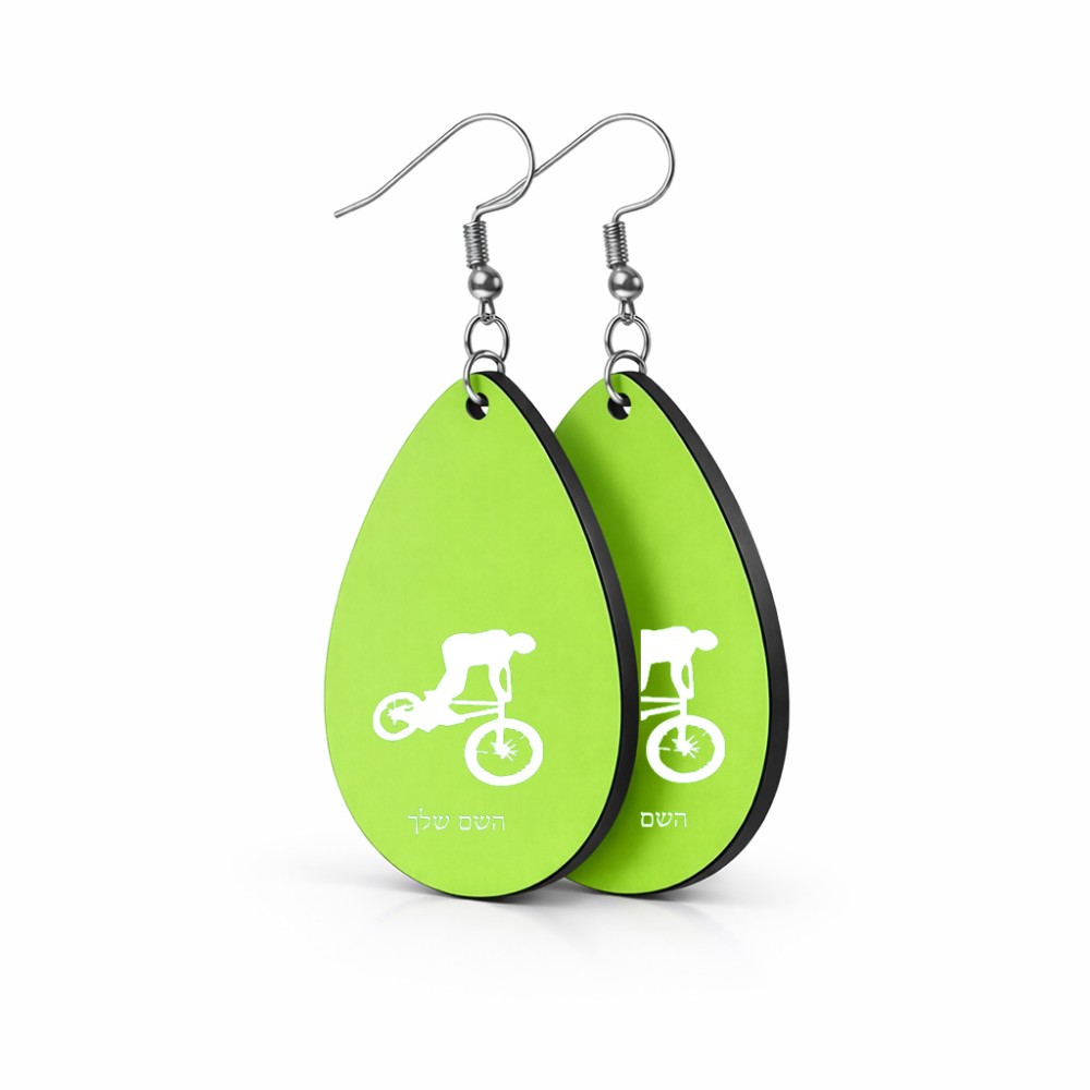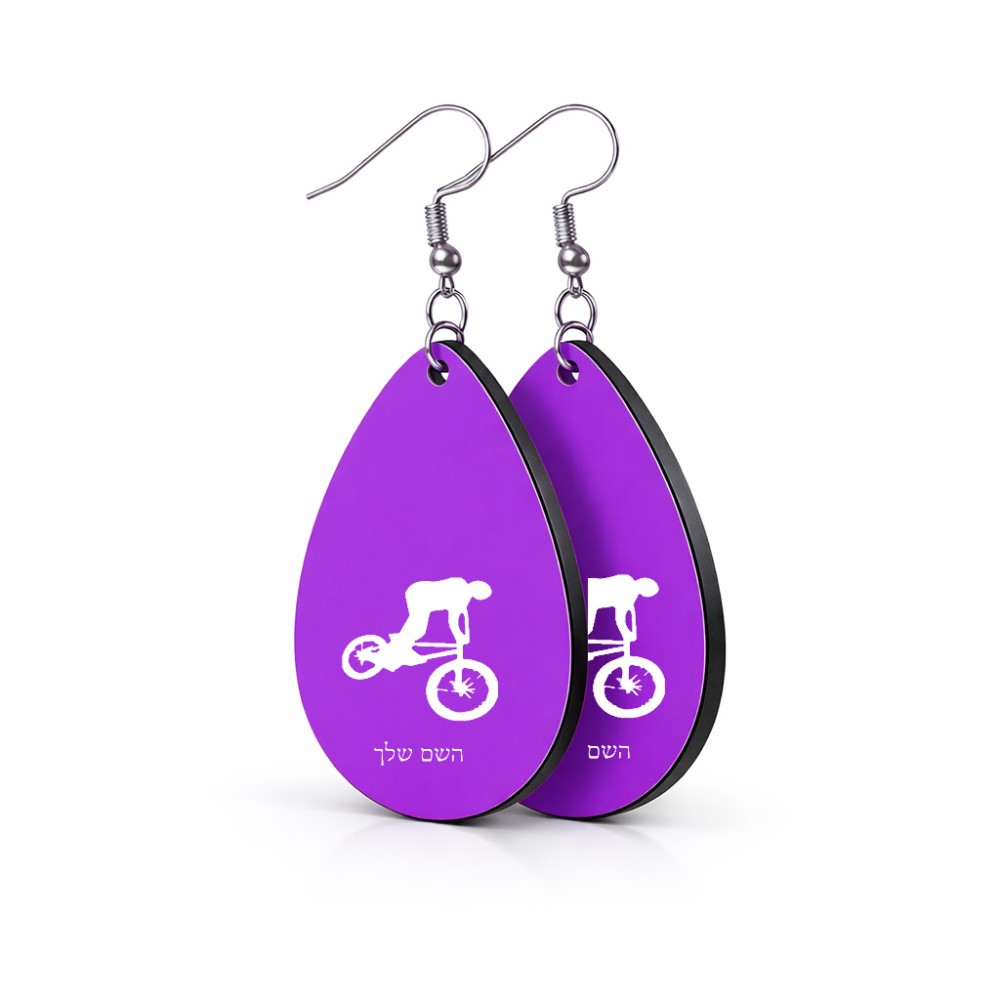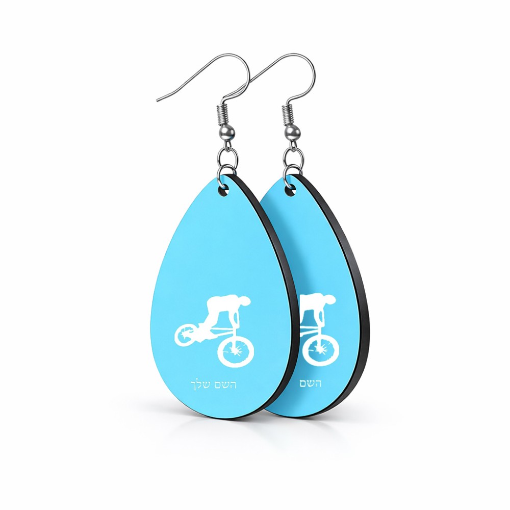 זוג עגילים בצורת טיפה בעיצוב אישי עם השם שלך בעיצוב רוכב אופניים גודל העגילים 2.5 × 3.8 ס"מ. את השם המבוקש ניתן לציין בהזמנה, אם לא צויין אנחנו ניצור קשר לבירור.
