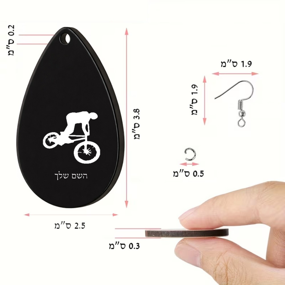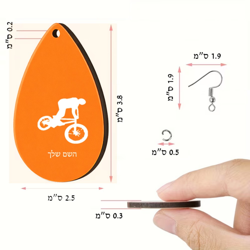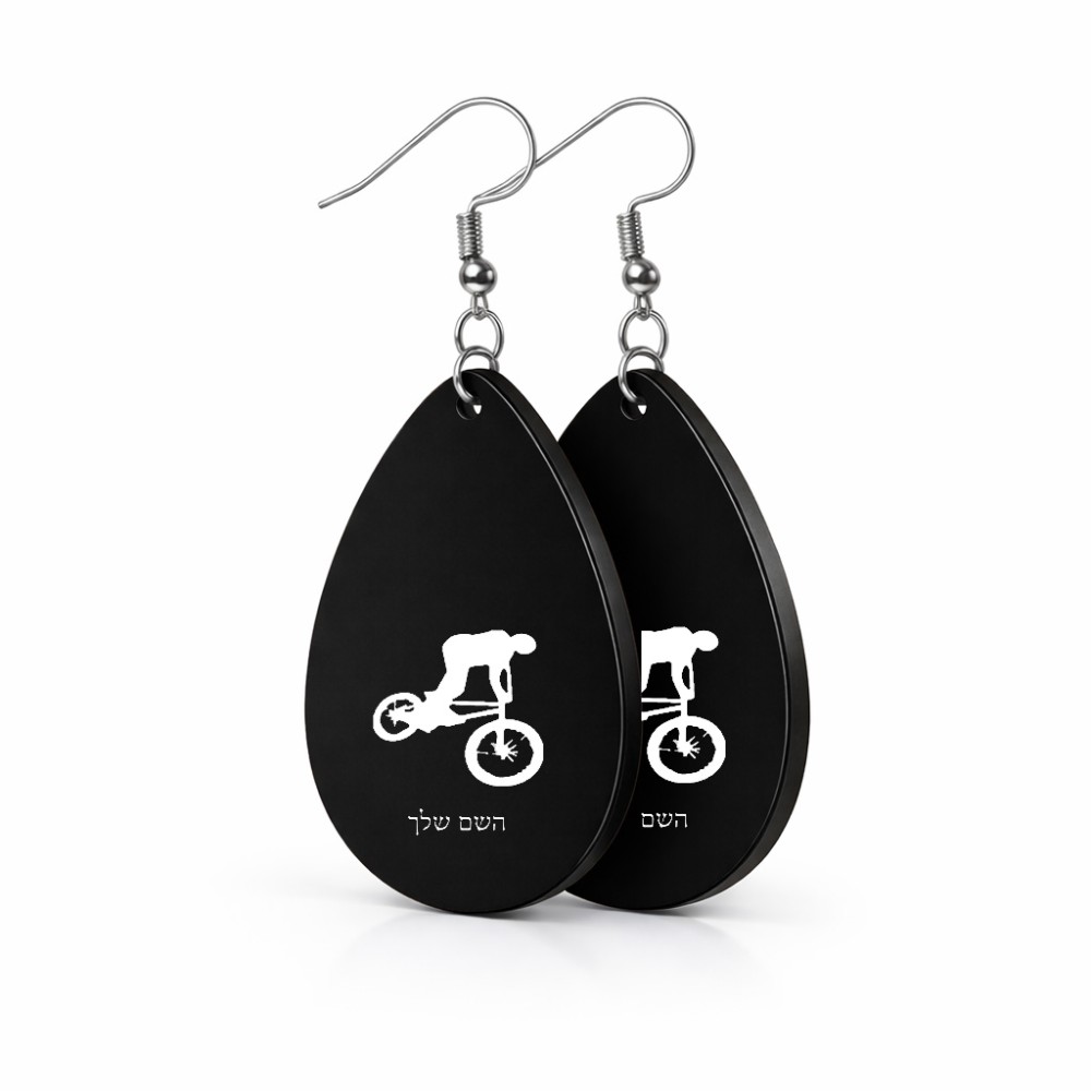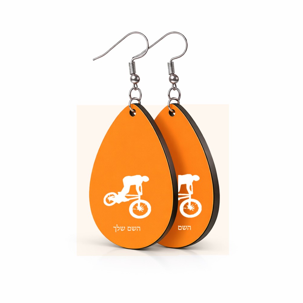 זוג עגילים בצורת טיפה בעיצוב אישי עם השם שלך בעיצוב רוכב אופניים גודל העגילים 2.5 × 3.8 ס"מ. את השם המבוקש ניתן לציין בהזמנה, אם לא צויין אנחנו ניצור קשר לבירור.