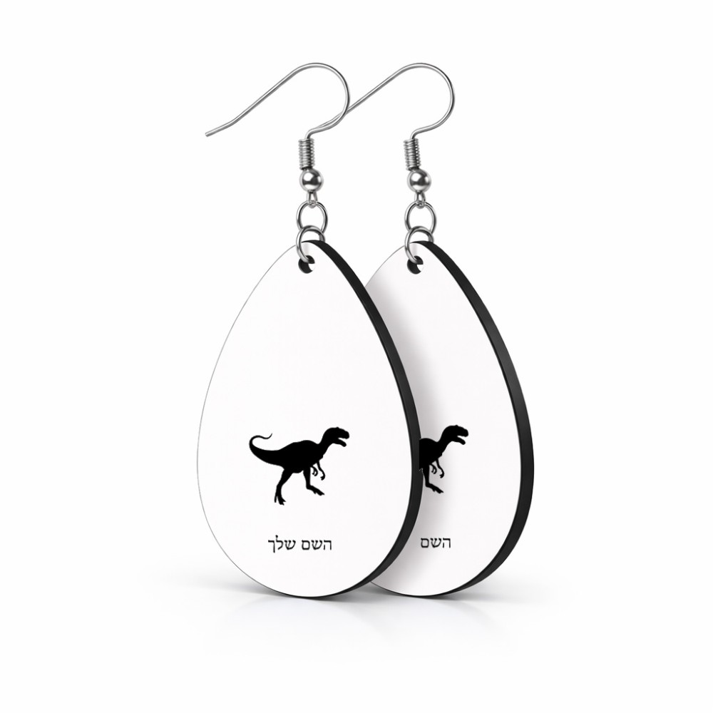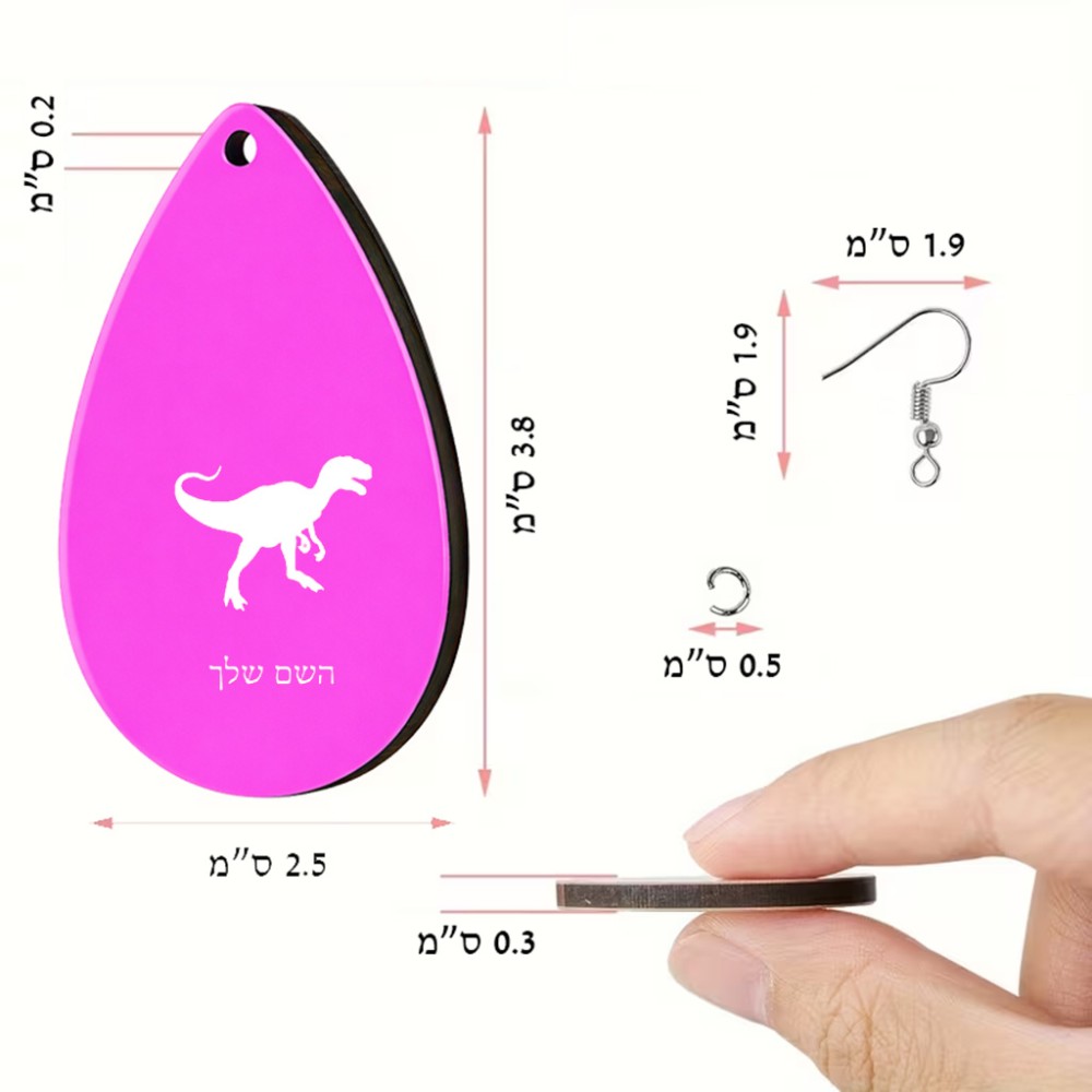 זוג עגילים בצורת טיפה בעיצוב אישי עם השם שלך בעיצוב דינוזאור גודל העגילים 2.5 × 3.8 ס"מ. את השם המבוקש ניתן לציין בהזמנה, אם לא צויין אנחנו ניצור קשר לבירור.