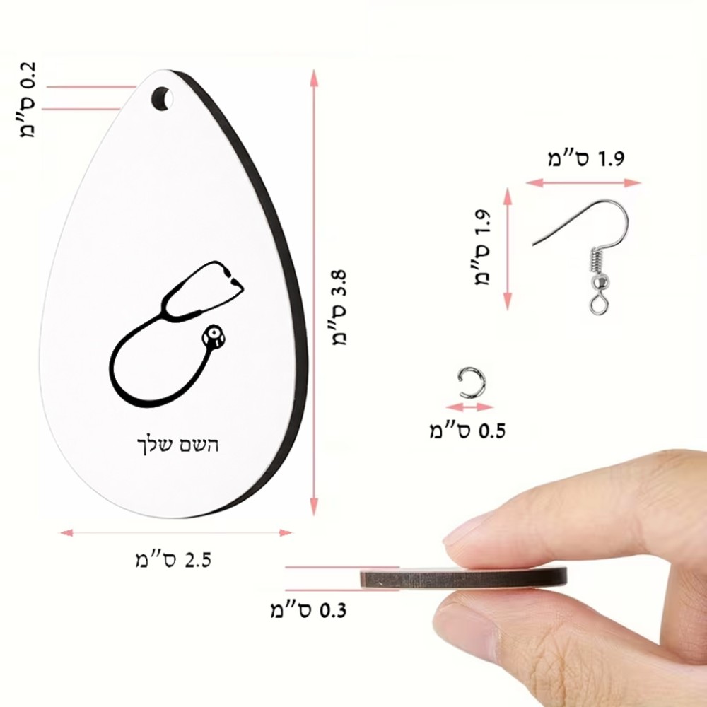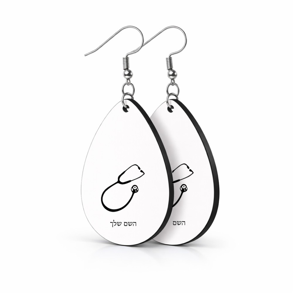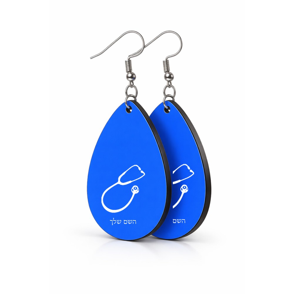 זוג עגילים בצורת טיפה בעיצוב אישי עם השם שלך בעיצוב סטטוסקופ רופא גודל העגילים 2.5 × 3.8 ס"מ. את השם המבוקש ניתן לציין בהזמנה, אם לא צויין אנחנו ניצור קשר לבירור.