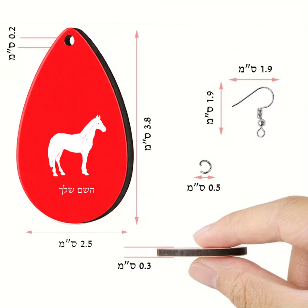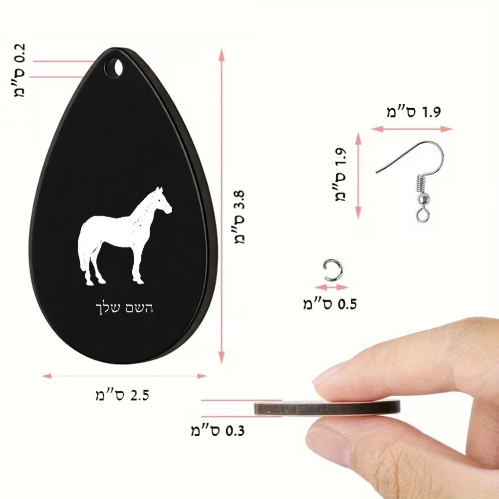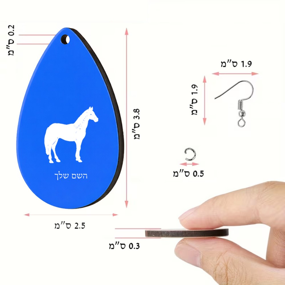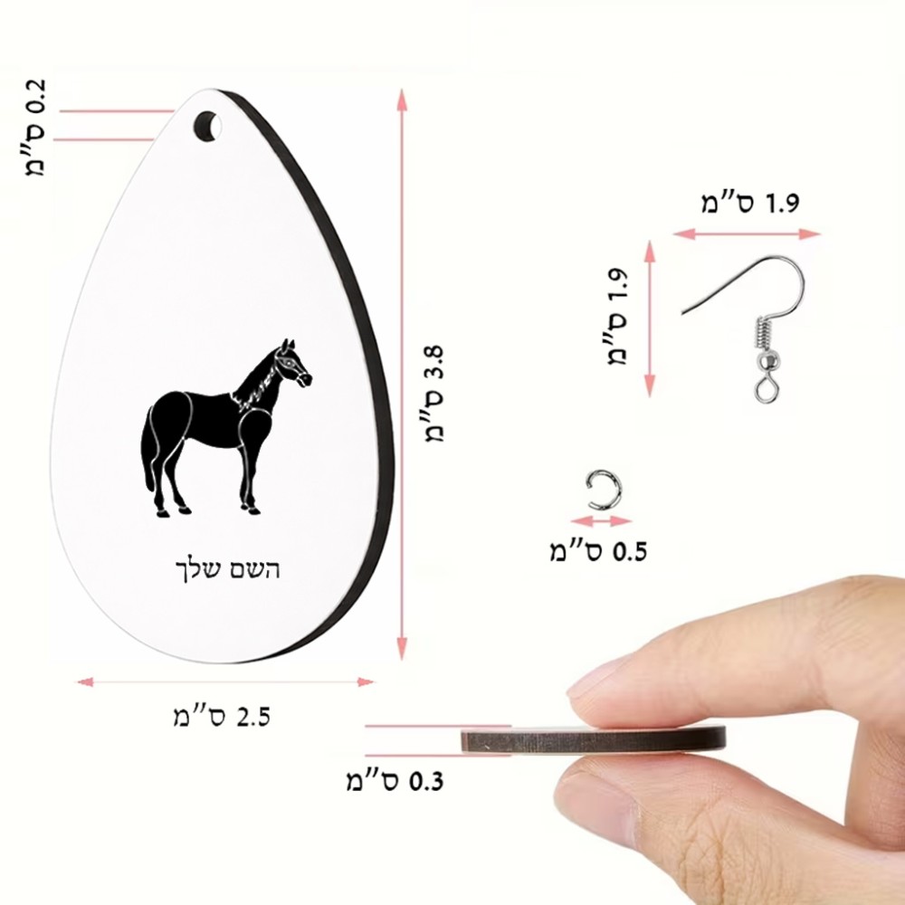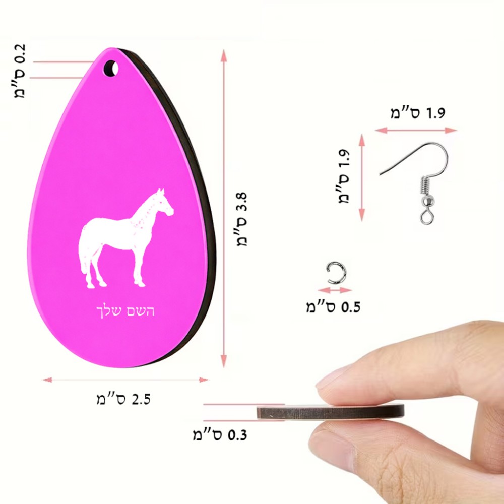 זוג עגילים בצורת טיפה בעיצוב אישי עם השם שלך בעיצוב סוס גודל העגילים 2.5 × 3.8 ס"מ. את השם המבוקש ניתן לציין בהזמנה, אם לא צויין אנחנו ניצור קשר לבירור.