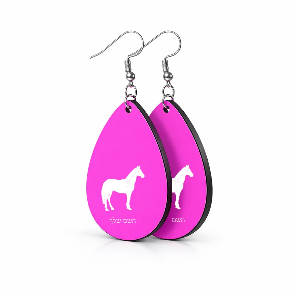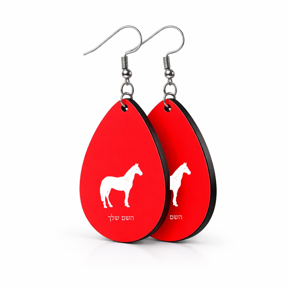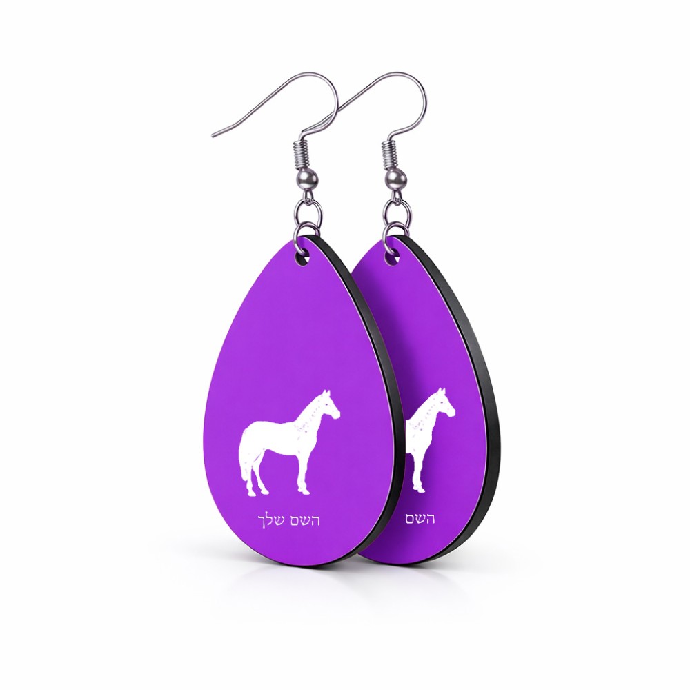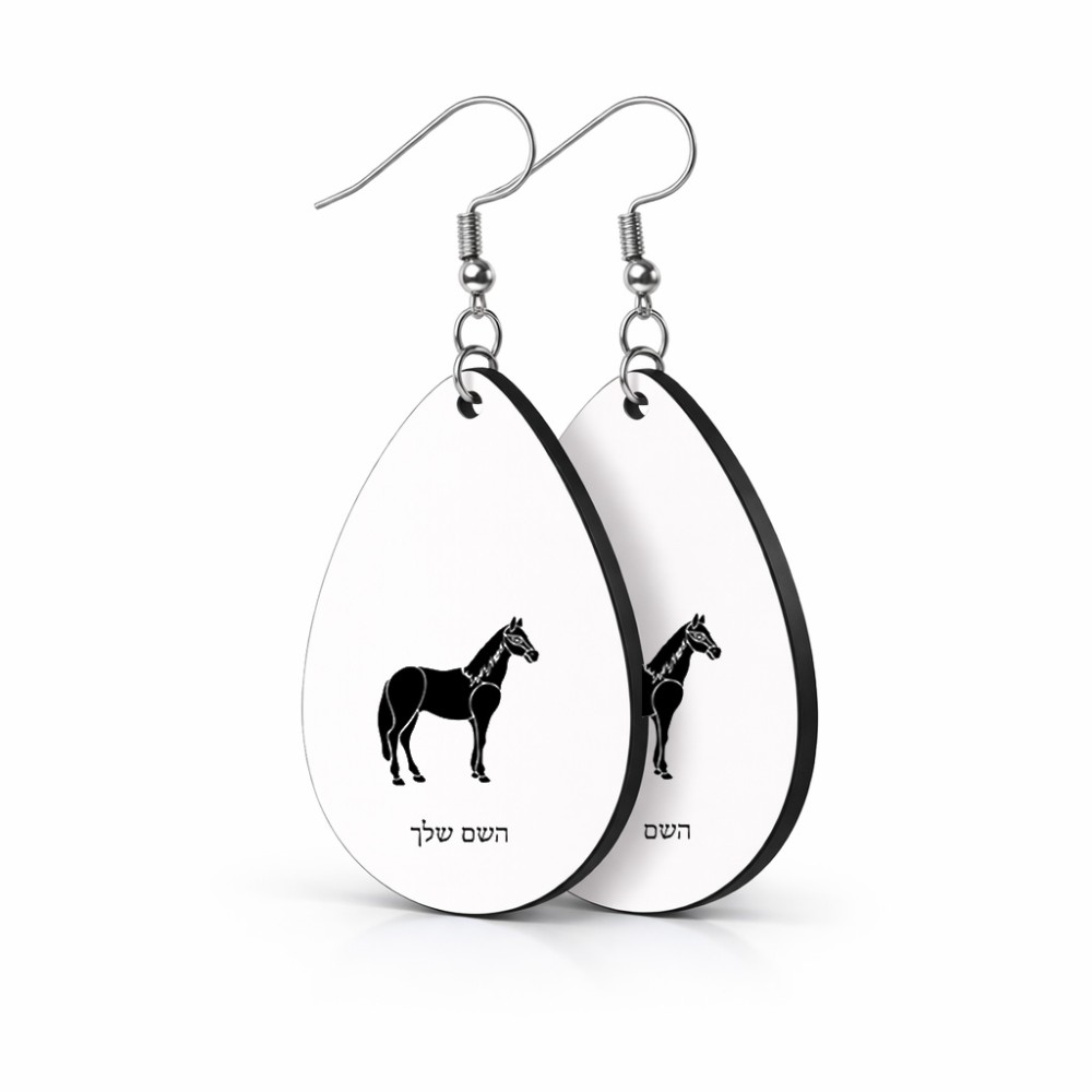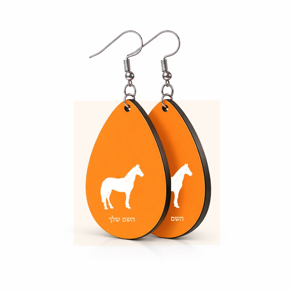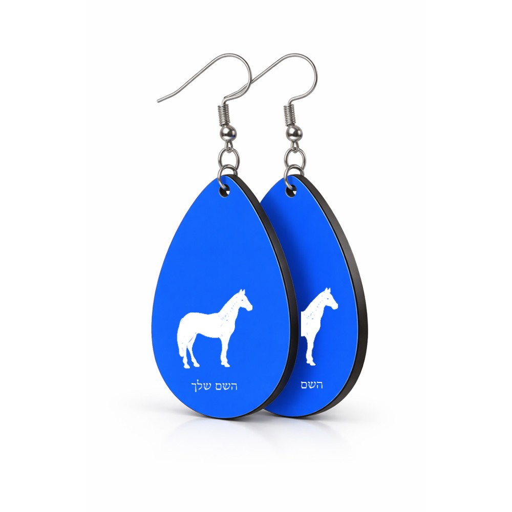 זוג עגילים בצורת טיפה בעיצוב אישי עם השם שלך בעיצוב סוס גודל העגילים 2.5 × 3.8 ס"מ. את השם המבוקש ניתן לציין בהזמנה, אם לא צויין אנחנו ניצור קשר לבירור.