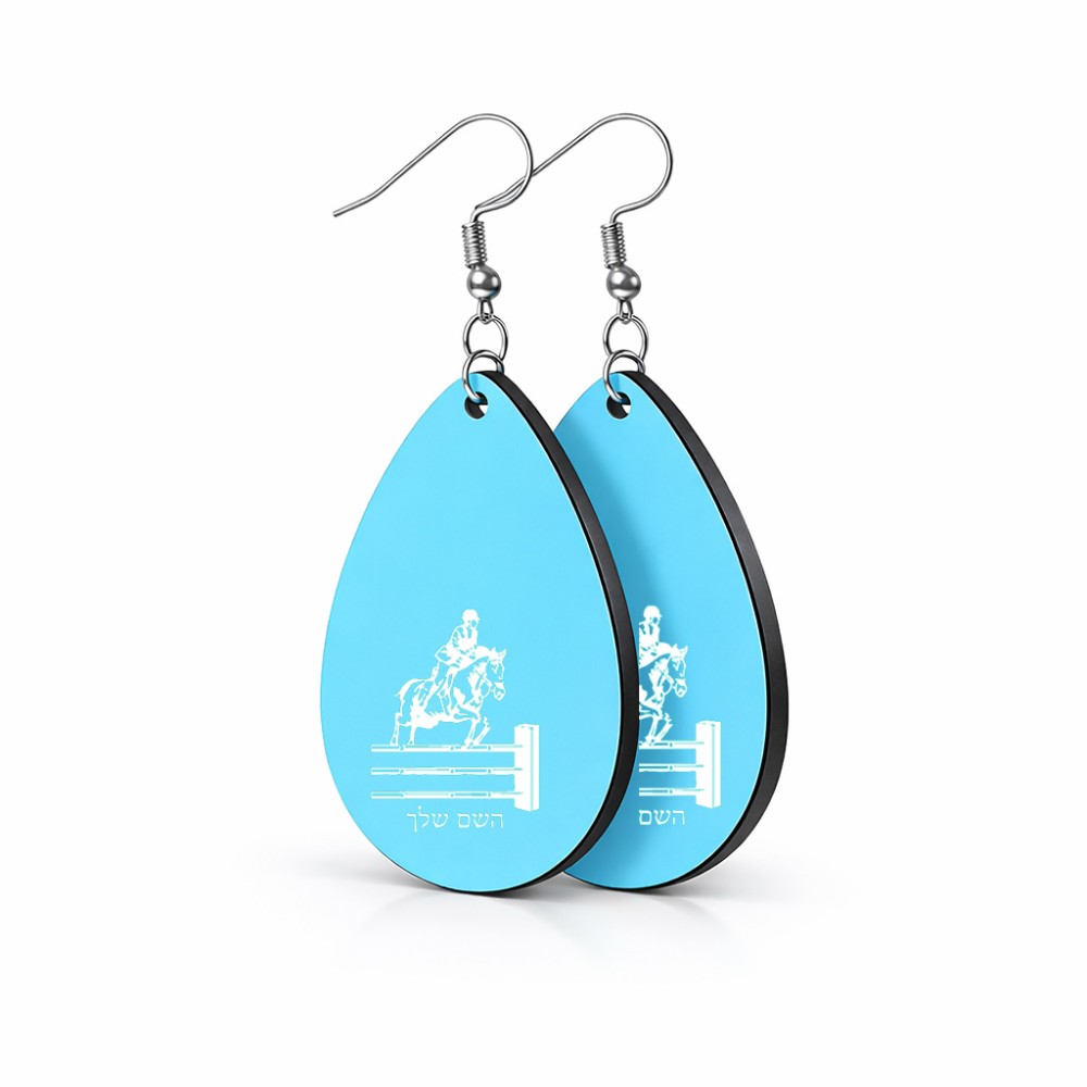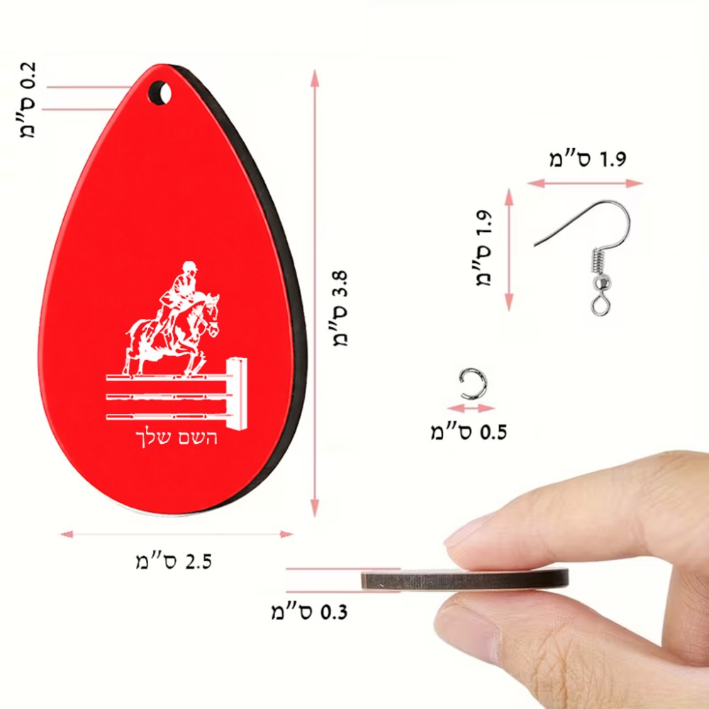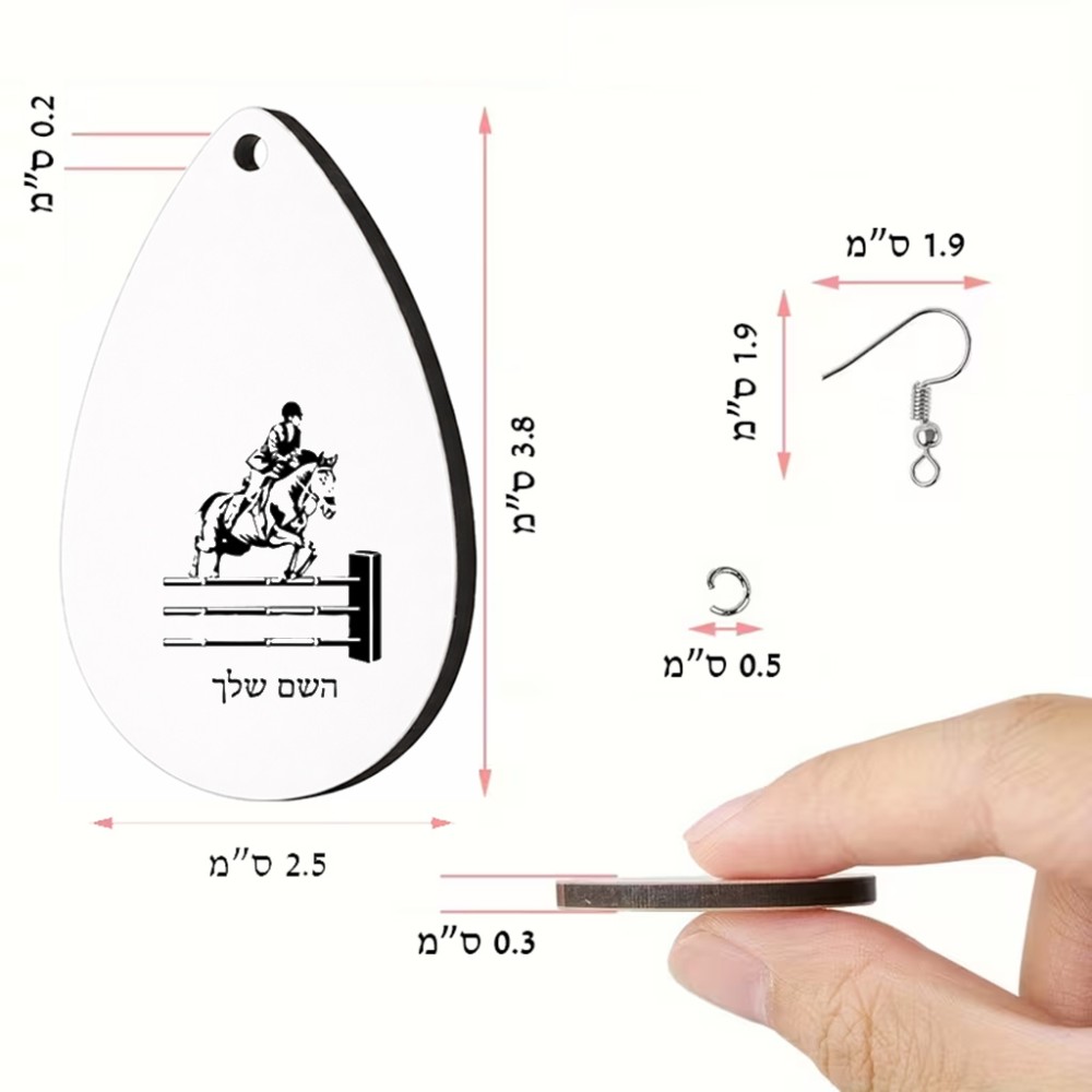 זוג עגילים בצורת טיפה בעיצוב אישי עם השם שלך בעיצוב רוכב סוסים גודל העגילים 2.5 × 3.8 ס"מ. את השם המבוקש ניתן לציין בהזמנה, אם לא צויין אנחנו ניצור קשר לבירור.