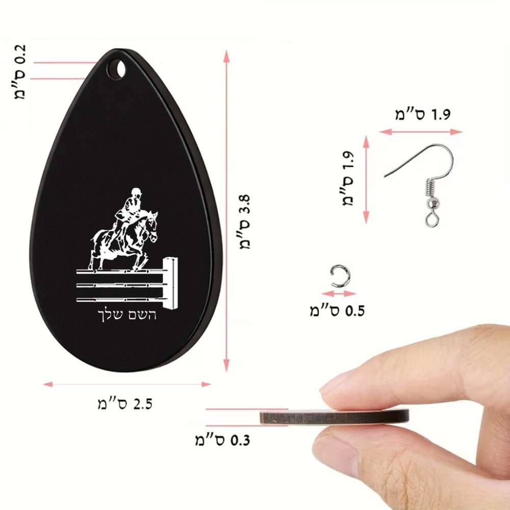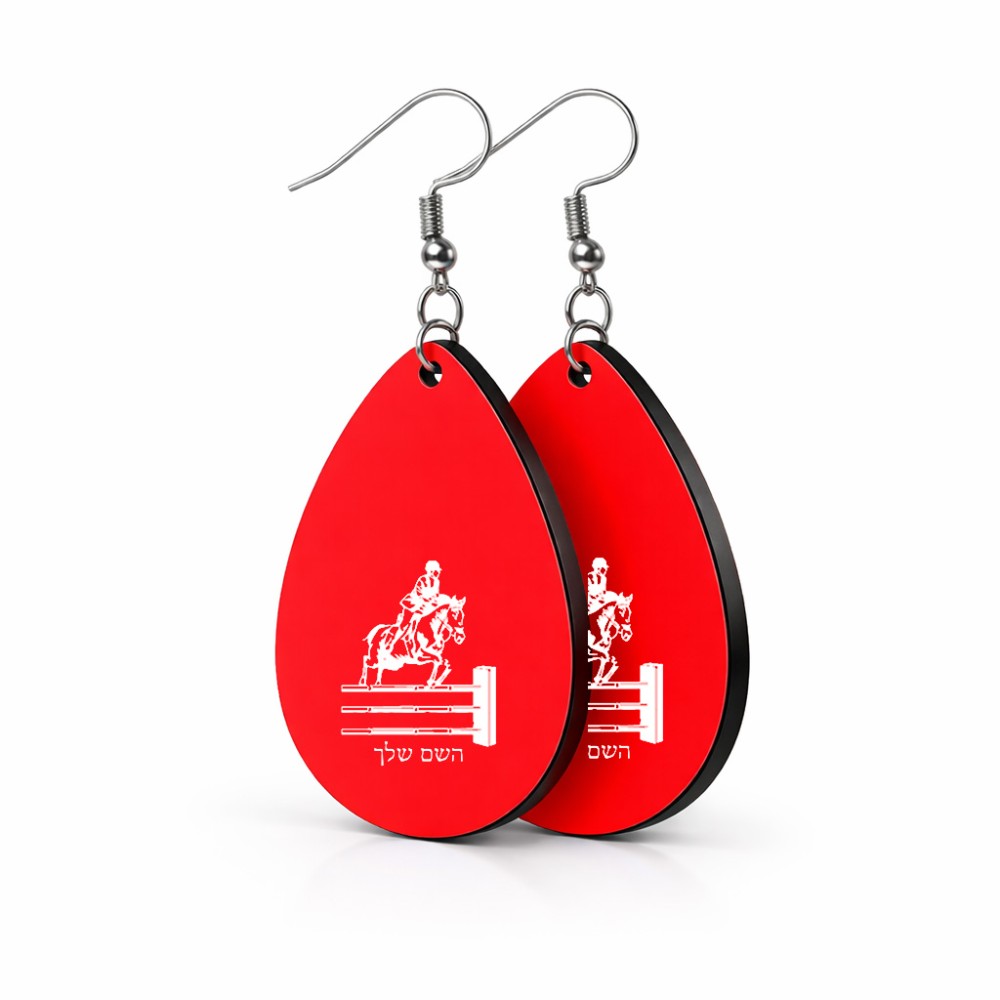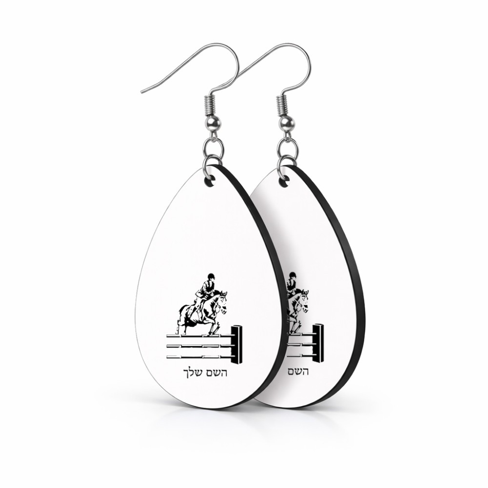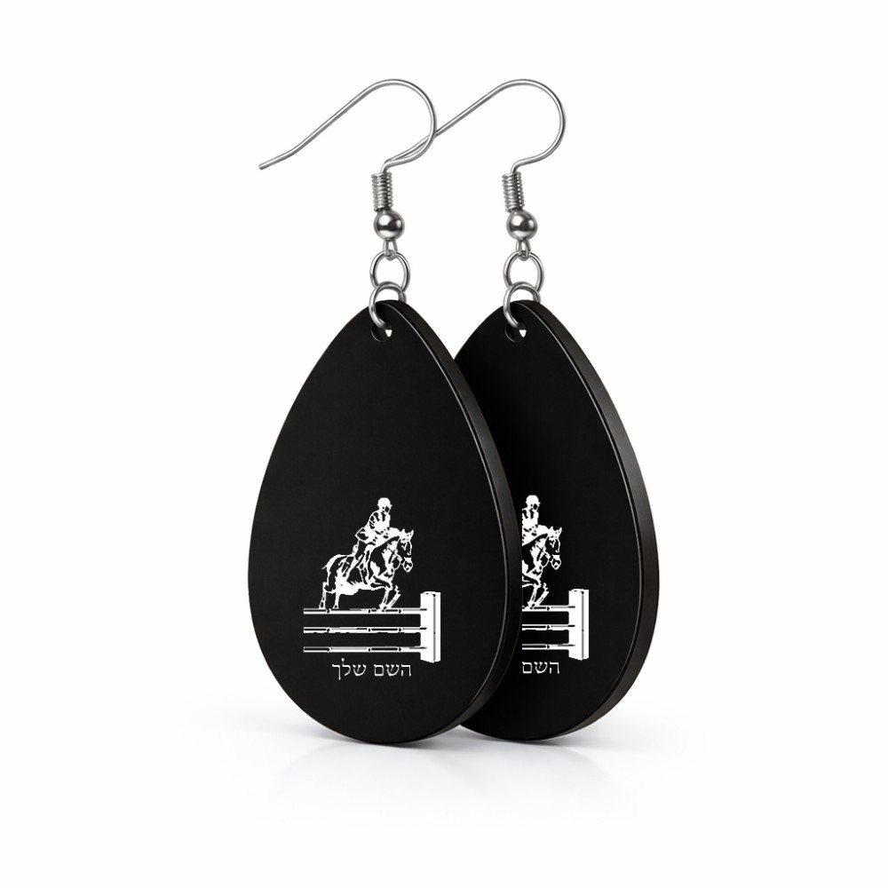 זוג עגילים בצורת טיפה בעיצוב אישי עם השם שלך בעיצוב רוכב סוסים גודל העגילים 2.5 × 3.8 ס"מ. את השם המבוקש ניתן לציין בהזמנה, אם לא צויין אנחנו ניצור קשר לבירור.