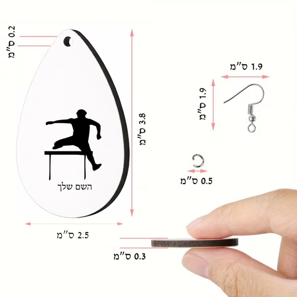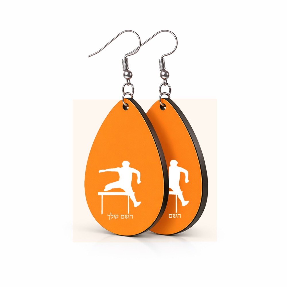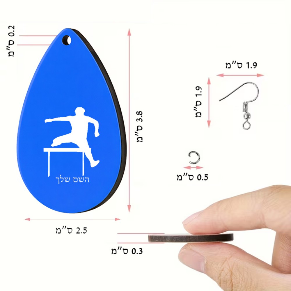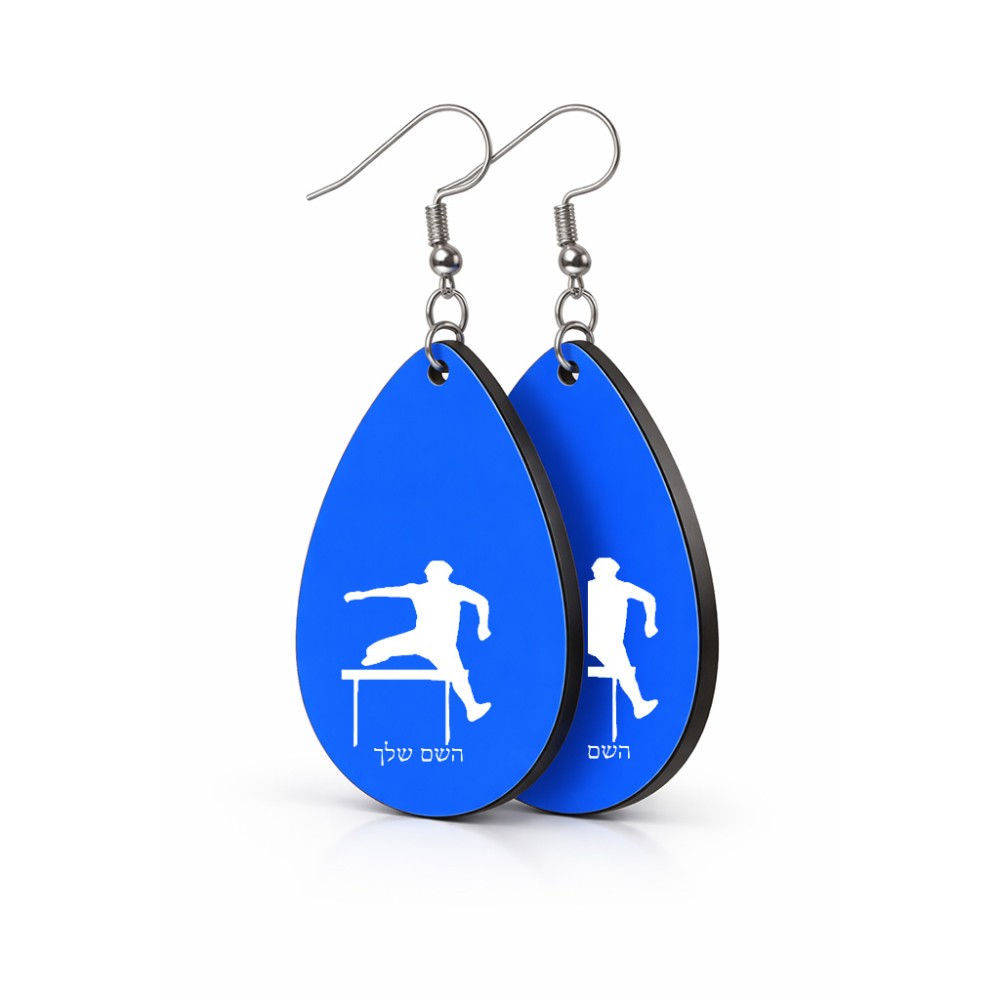 זוג עגילים בצורת טיפה בעיצוב אישי עם השם שלך בעיצוב קפיצת משוכות גודל העגילים 2.5 × 3.8 ס"מ. את השם המבוקש ניתן לציין בהזמנה, אם לא צויין אנחנו ניצור קשר לבירור.