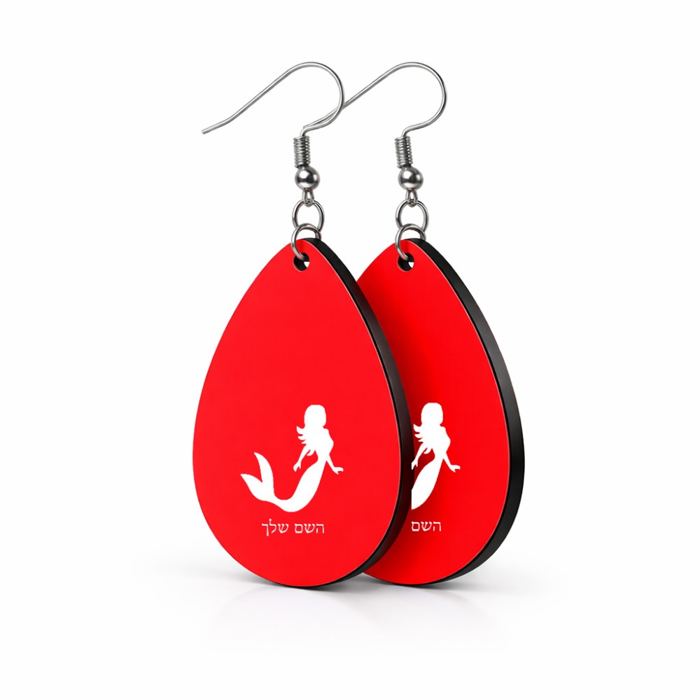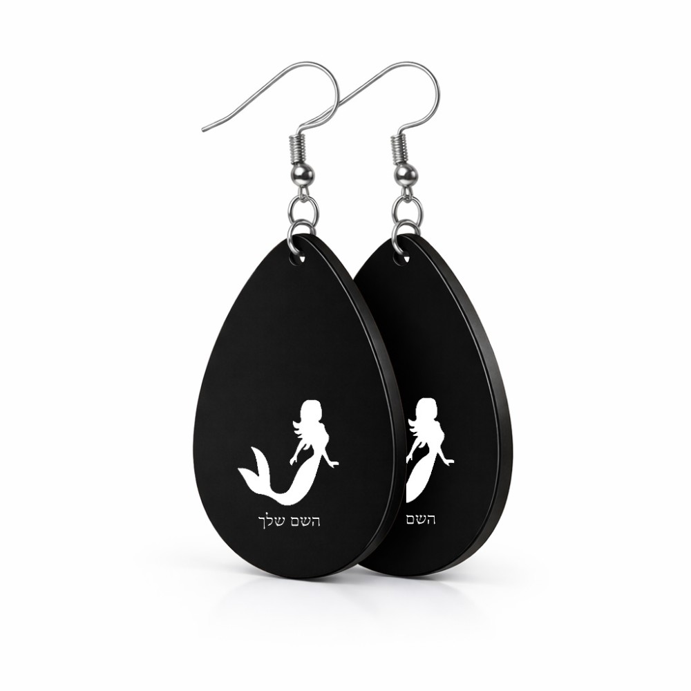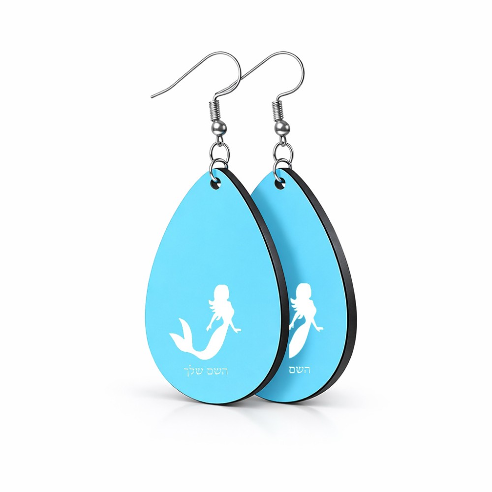 זוג עגילים בצורת טיפה בעיצוב אישי עם השם שלך בעיצוב בתולת ים - אישה גודל העגילים 2.5 × 3.8 ס"מ. את השם המבוקש ניתן לציין בהזמנה, אם לא צויין אנחנו ניצור קשר לבירור.