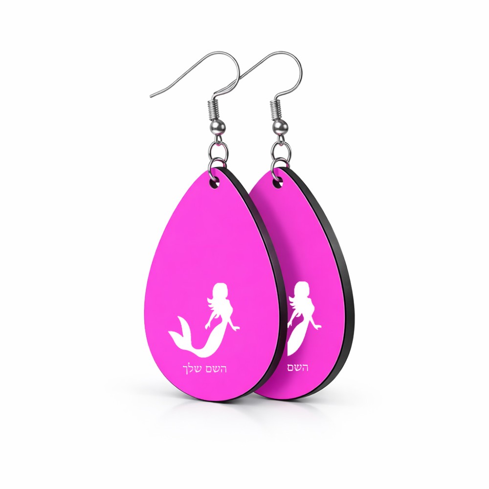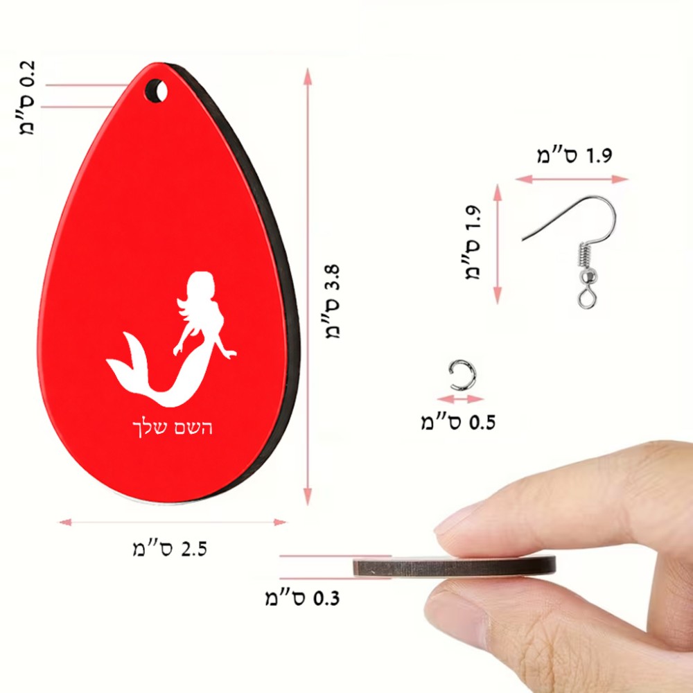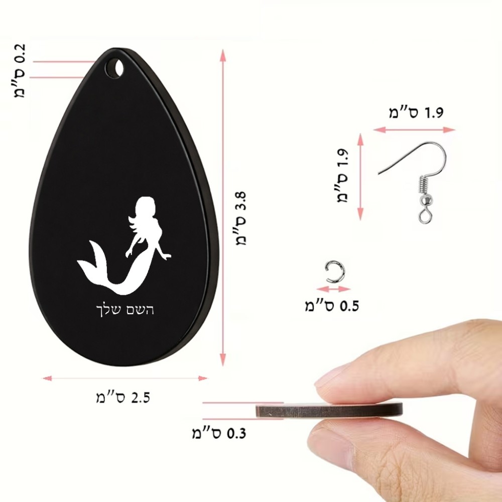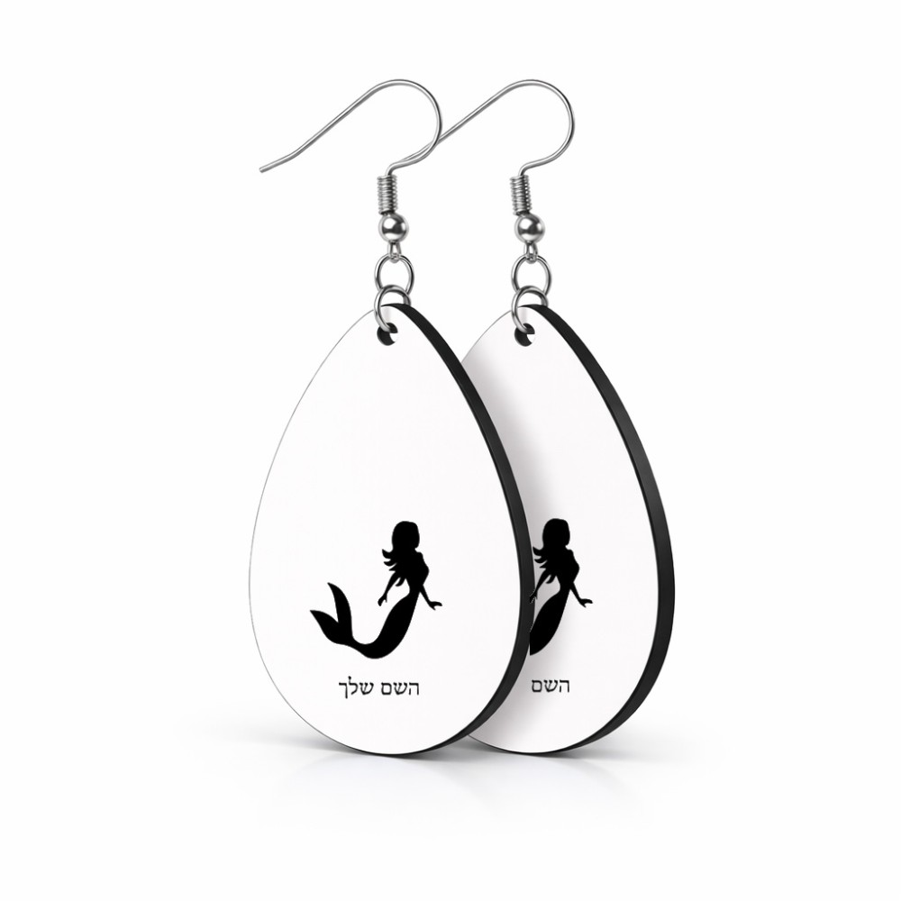 זוג עגילים בצורת טיפה בעיצוב אישי עם השם שלך בעיצוב בתולת ים - אישה גודל העגילים 2.5 × 3.8 ס"מ. את השם המבוקש ניתן לציין בהזמנה, אם לא צויין אנחנו ניצור קשר לבירור.
