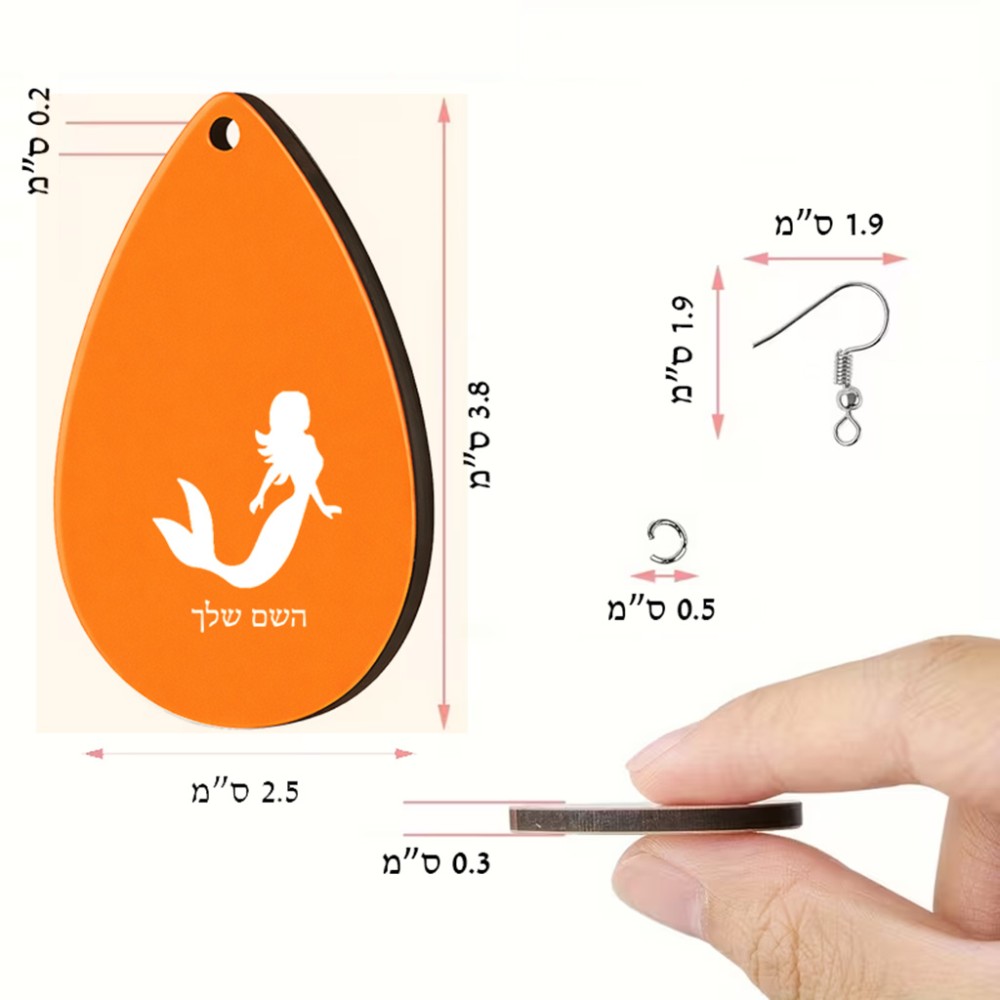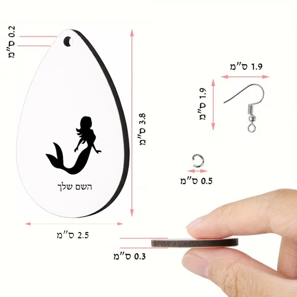 זוג עגילים בצורת טיפה בעיצוב אישי עם השם שלך בעיצוב בתולת ים - אישה גודל העגילים 2.5 × 3.8 ס"מ