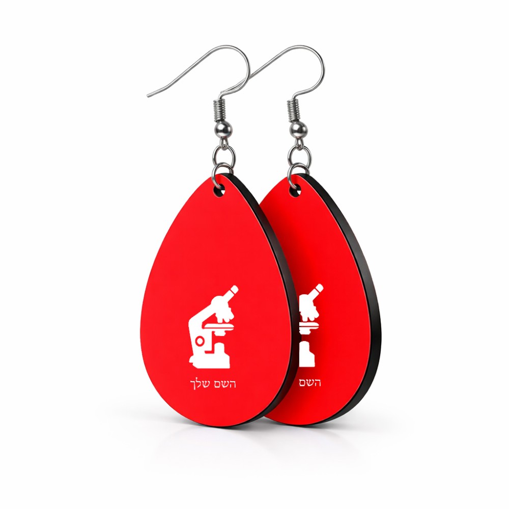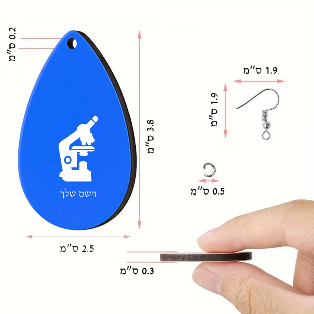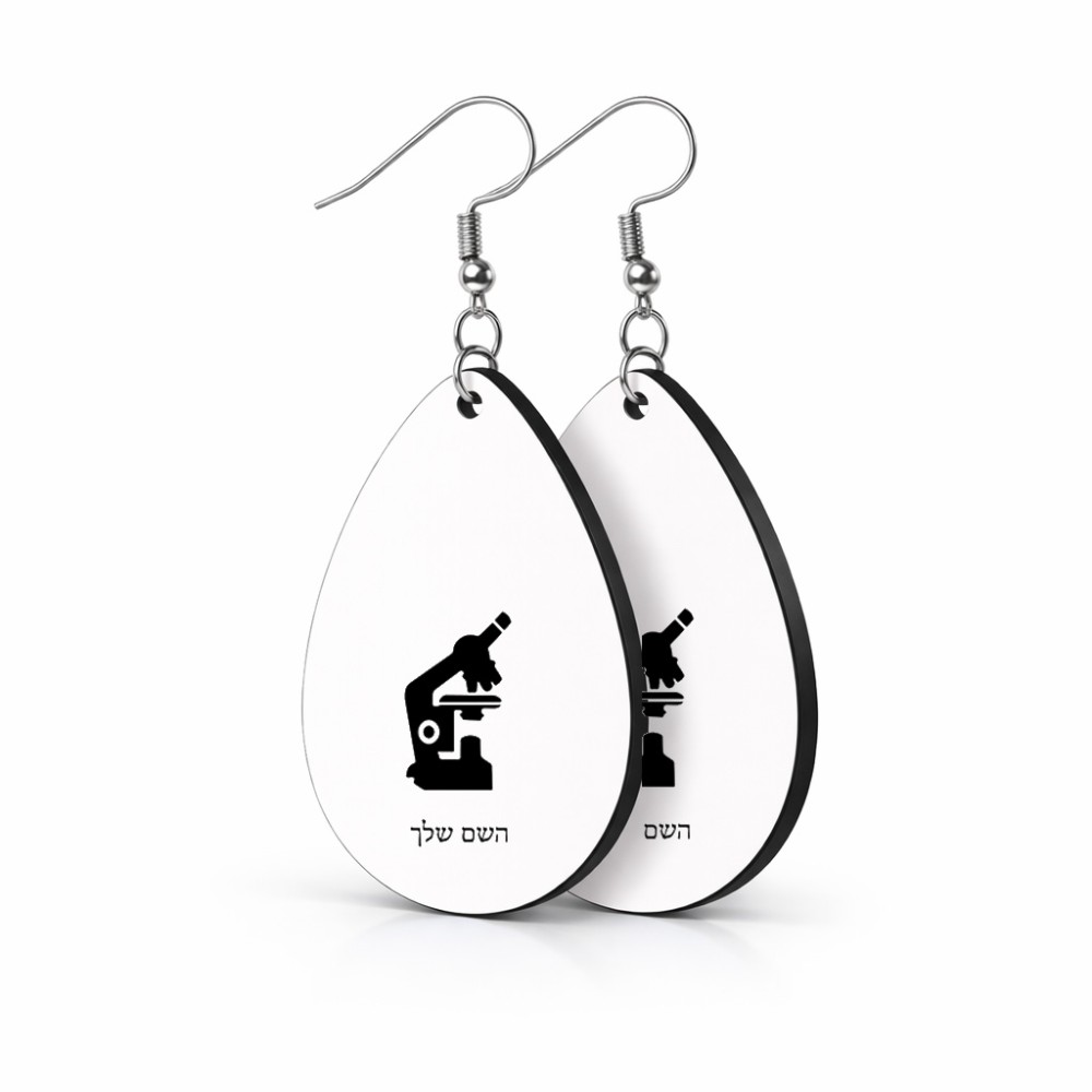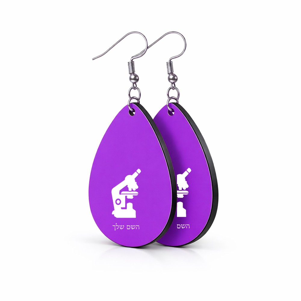 זוג עגילים בצורת טיפה בעיצוב אישי עם השם שלך בעיצוב מיקרוסקופ גודל העגילים 2.5 × 3.8 ס"מ. את השם המבוקש ניתן לציין בהזמנה, אם לא צויין אנחנו ניצור קשר לבירור.