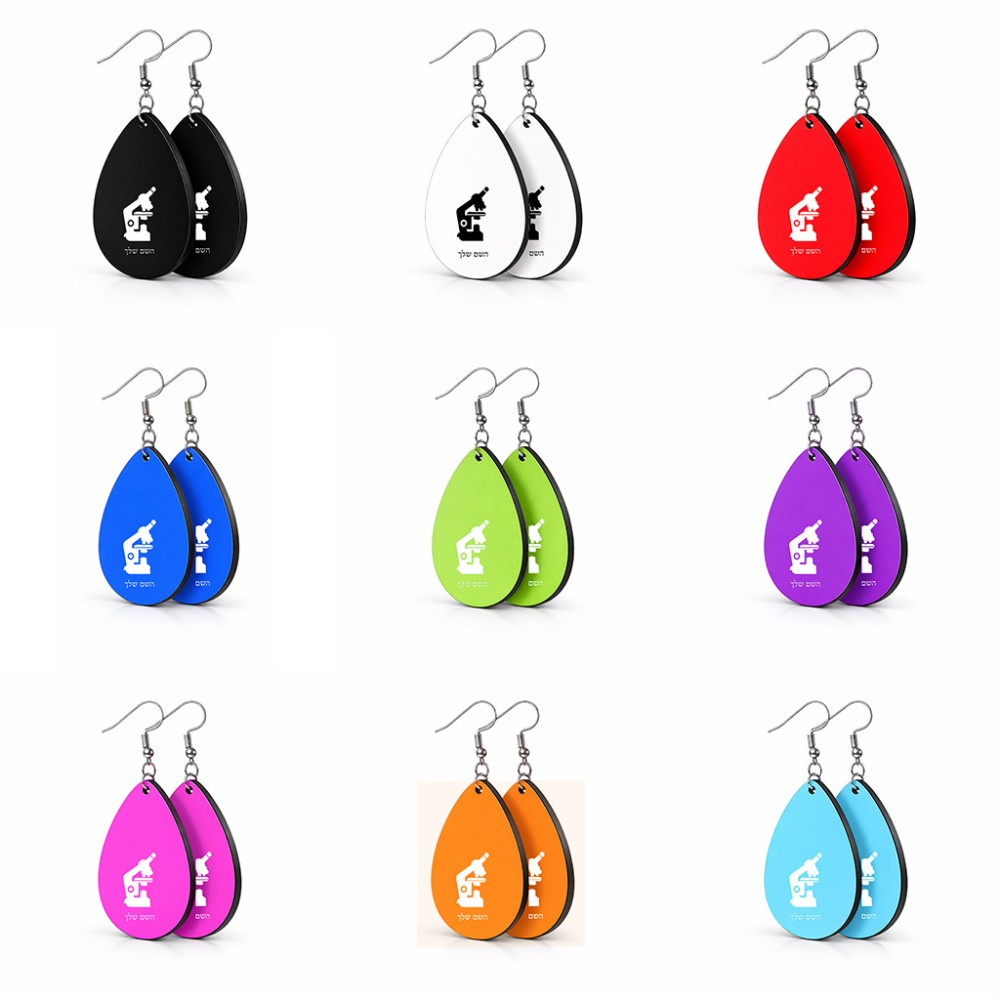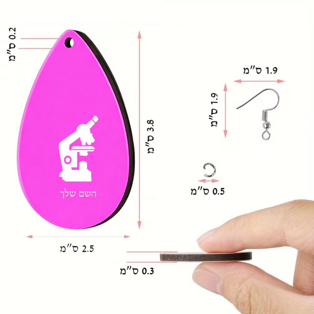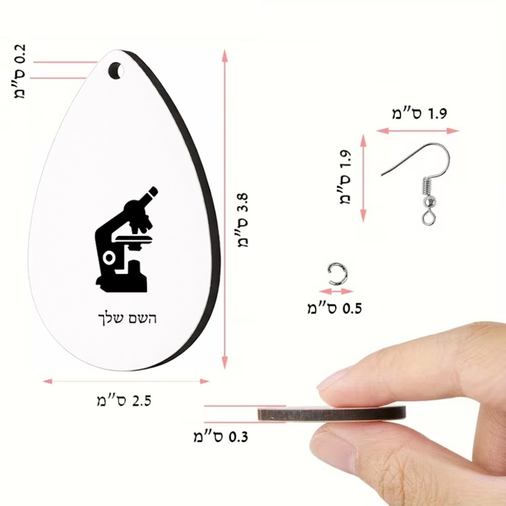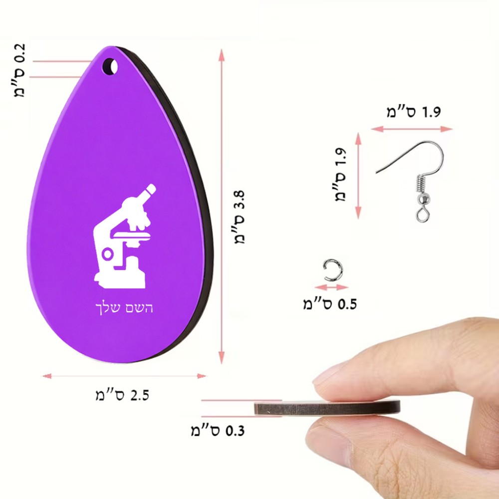 זוג עגילים בצורת טיפה בעיצוב אישי עם השם שלך בעיצוב מיקרוסקופ גודל העגילים 2.5 × 3.8 ס"מ. את השם המבוקש ניתן לציין בהזמנה, אם לא צויין אנחנו ניצור קשר לבירור.