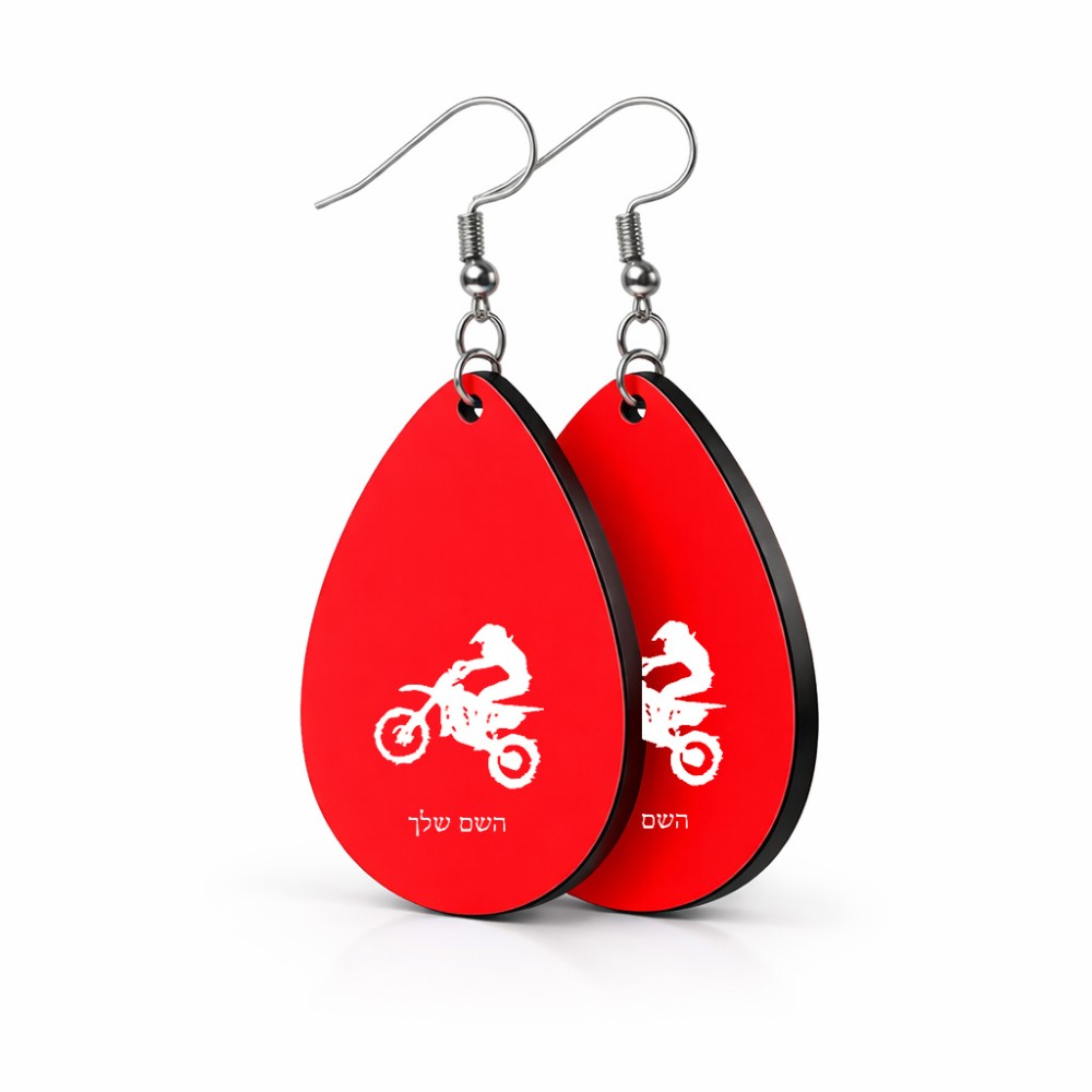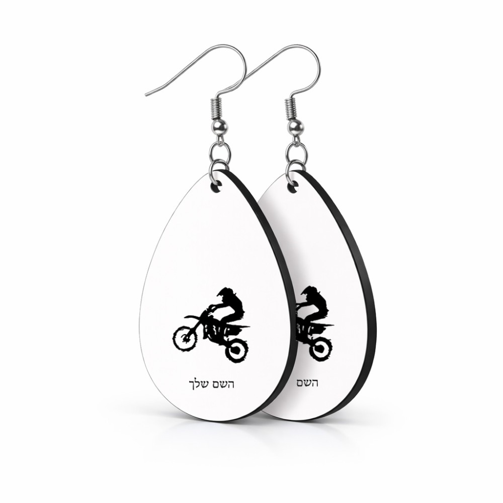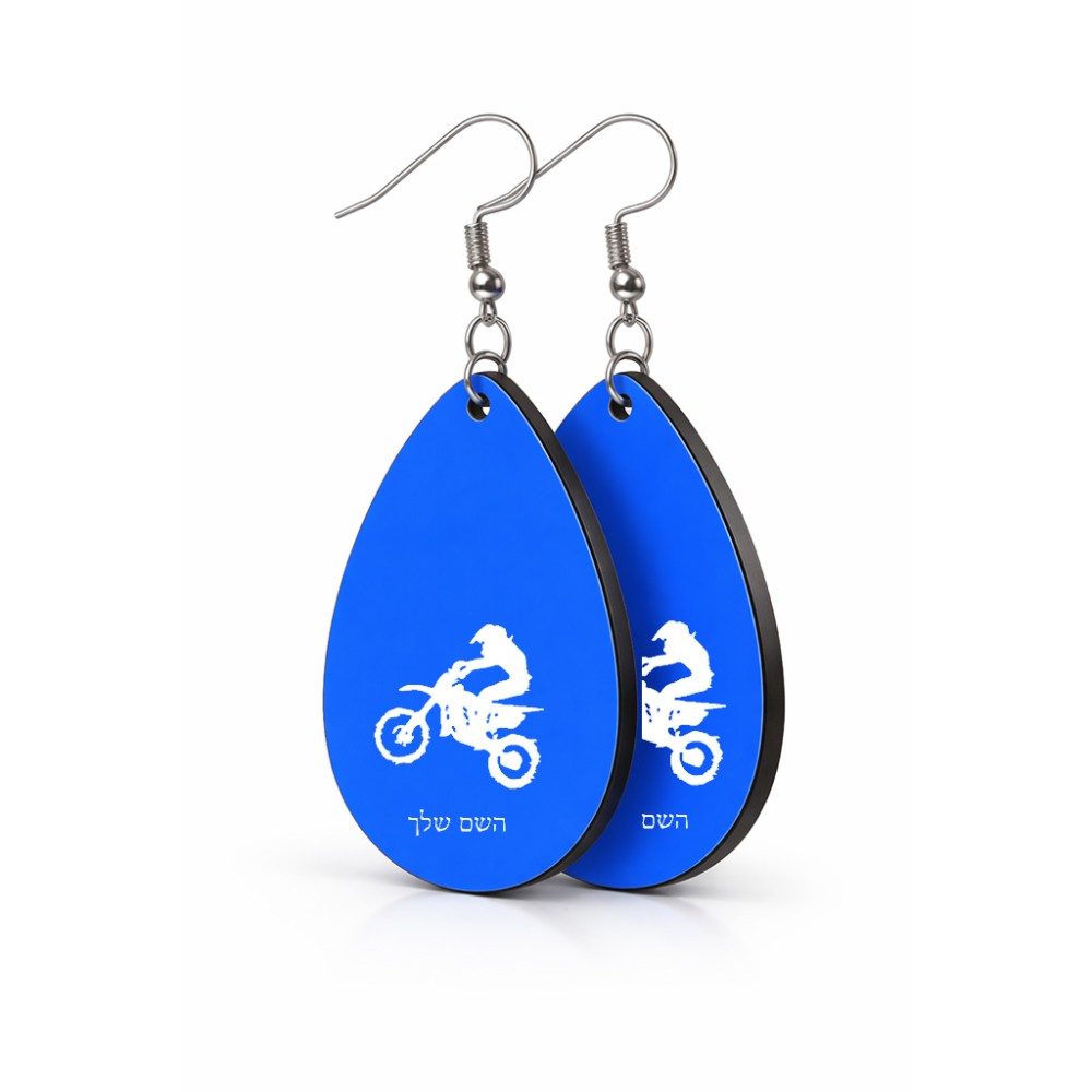 זוג עגילים בצורת טיפה בעיצוב אישי עם השם שלך בעיצוב מוטוקרוס גודל העגילים 2.5 × 3.8 ס"מ. את השם המבוקש ניתן לציין בהזמנה, אם לא צויין אנחנו ניצור קשר לבירור.