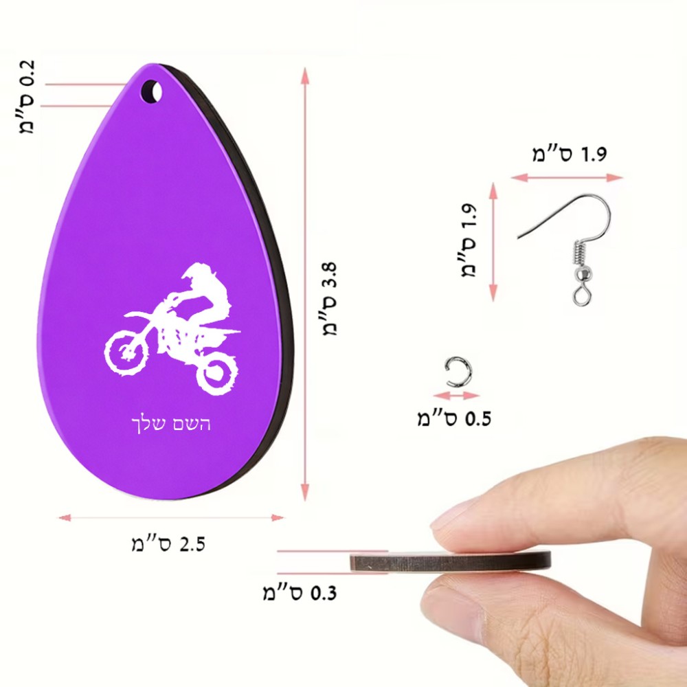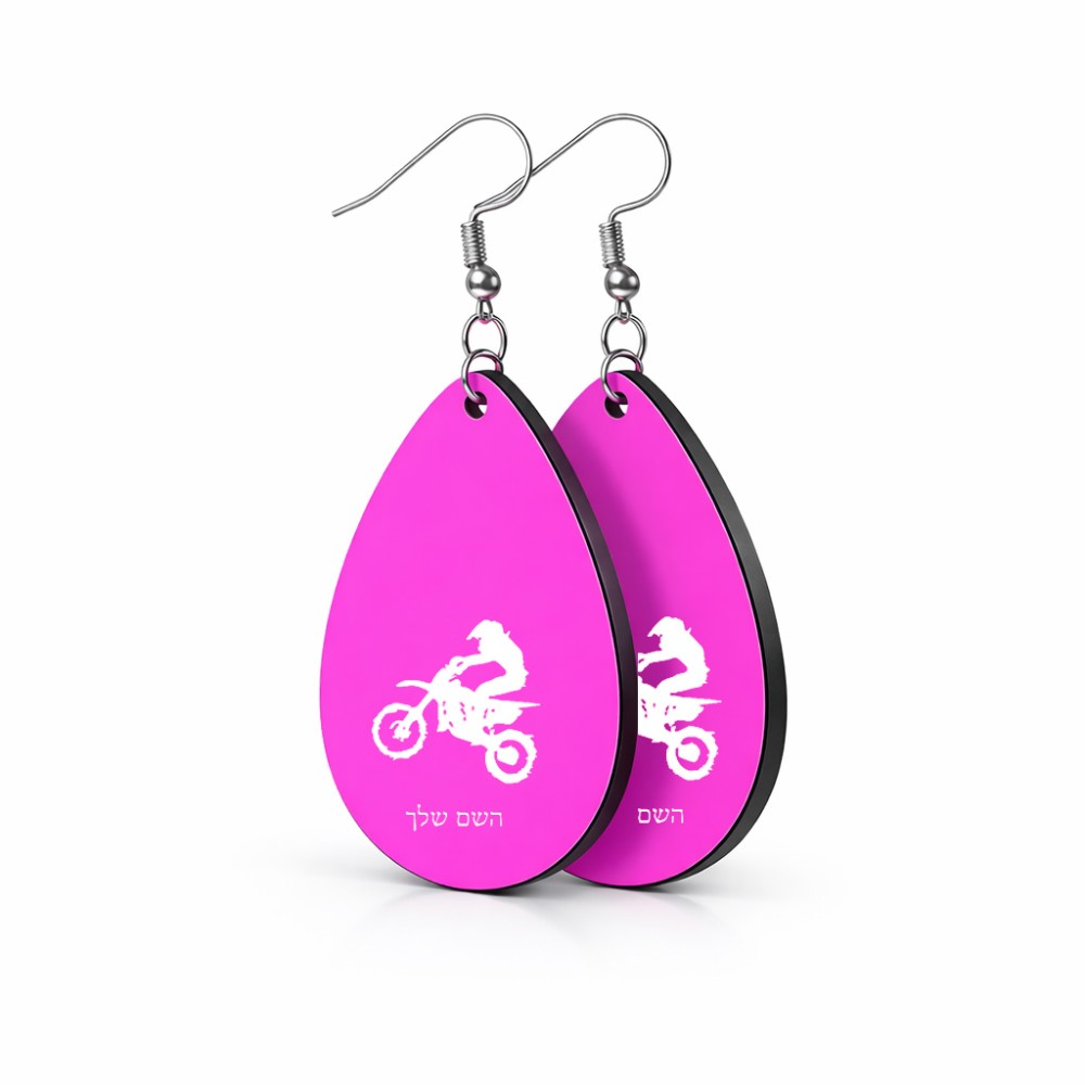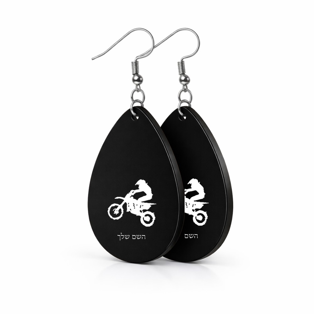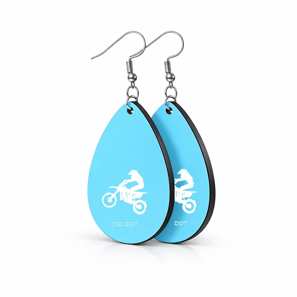 זוג עגילים בצורת טיפה בעיצוב אישי עם השם שלך בעיצוב מוטוקרוס גודל העגילים 2.5 × 3.8 ס"מ. את השם המבוקש ניתן לציין בהזמנה, אם לא צויין אנחנו ניצור קשר לבירור.