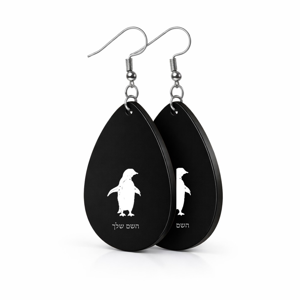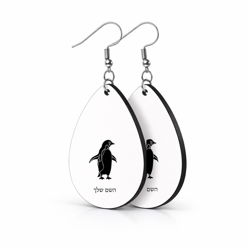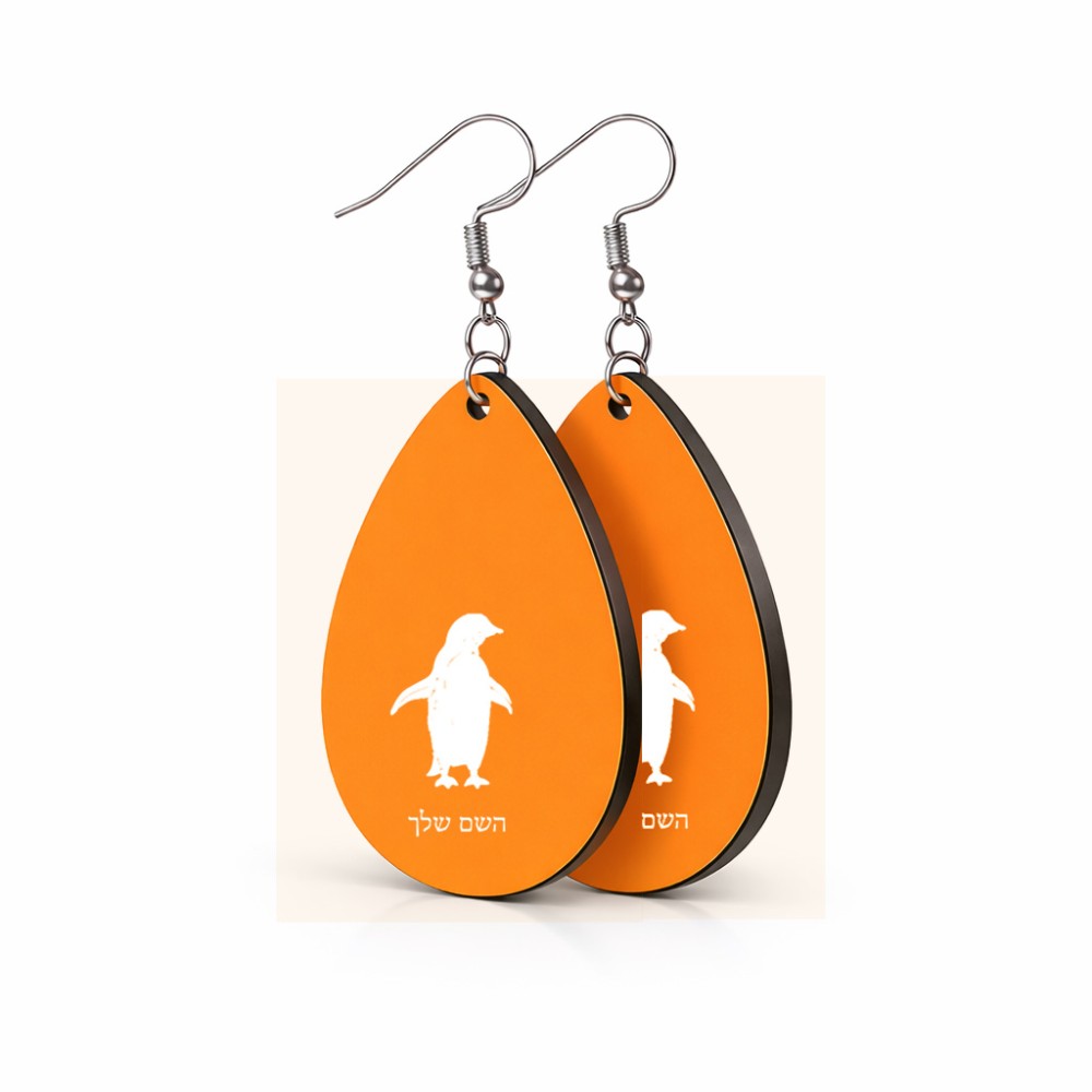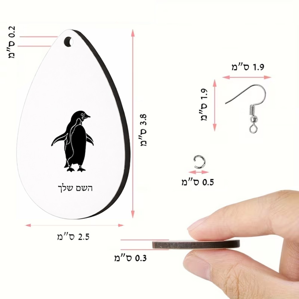 זוג עגילים בצורת טיפה בעיצוב אישי עם השם שלך בעיצוב פינגווין גודל העגילים 2.5 × 3.8 ס"מ. את השם המבוקש ניתן לציין בהזמנה, אם לא צויין אנחנו ניצור קשר לבירור.