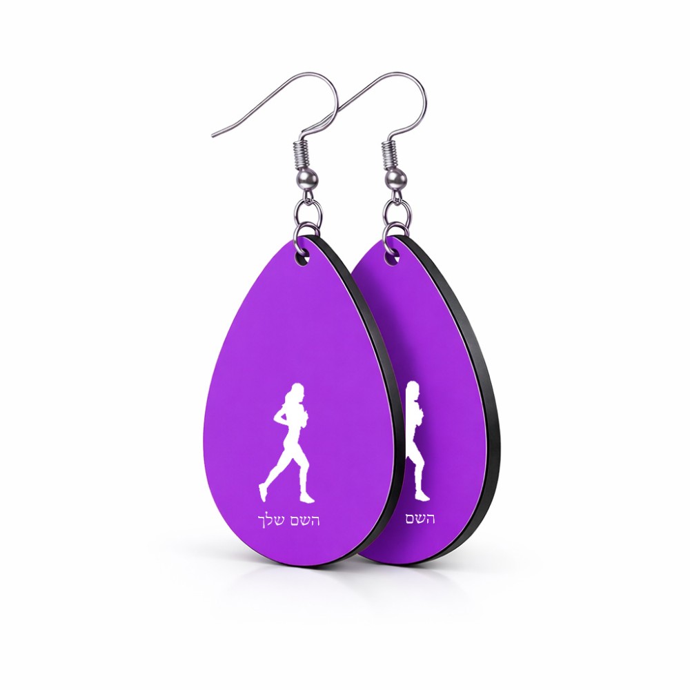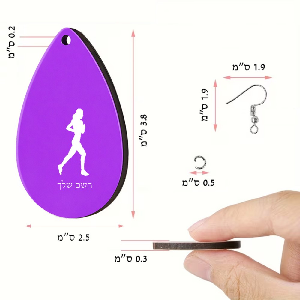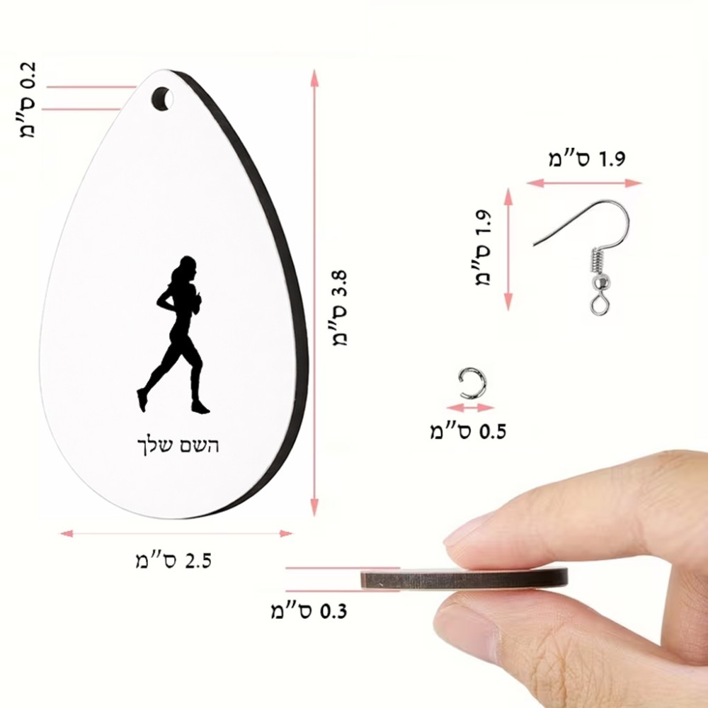 זוג עגילים בצורת טיפה בעיצוב אישי עם השם שלך בעיצוב רץ רץ אישה גודל העגילים 2.5 × 3.8 ס"מ. את השם המבוקש ניתן לציין בהזמנה, אם לא צויין אנחנו ניצור קשר לבירור.
