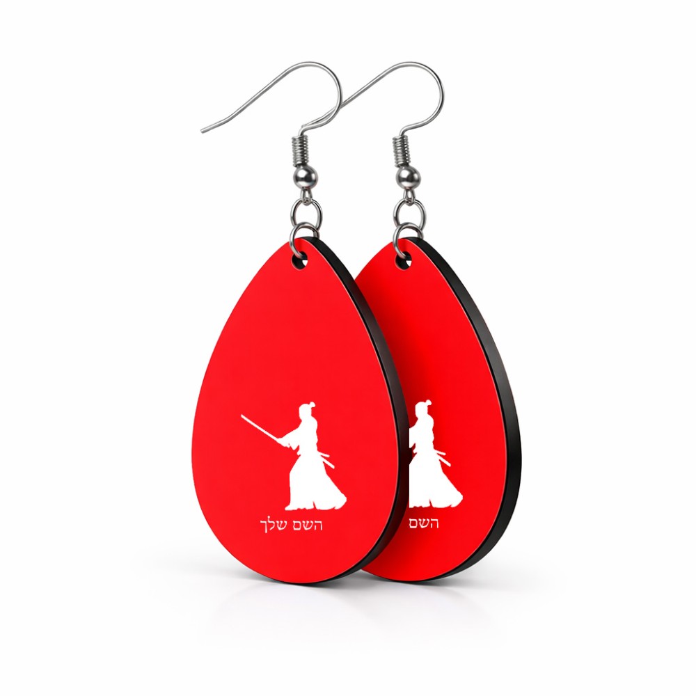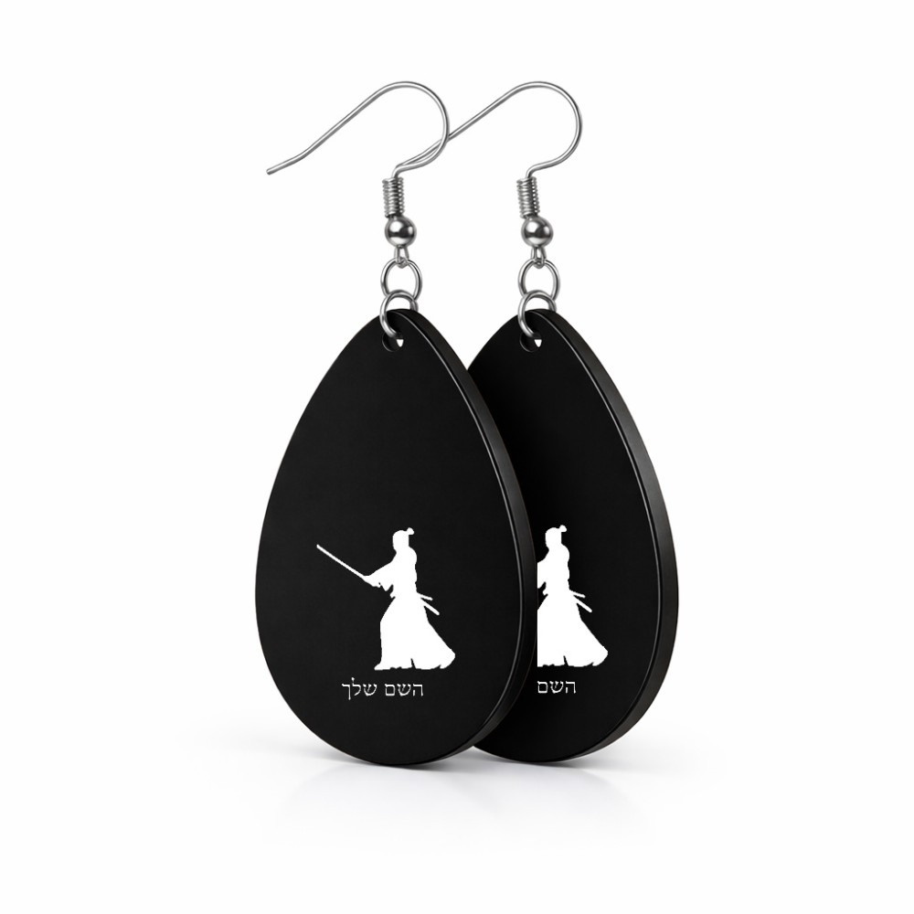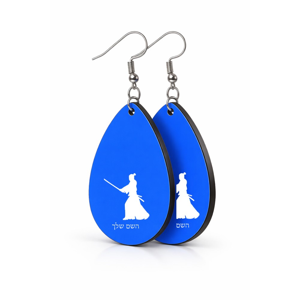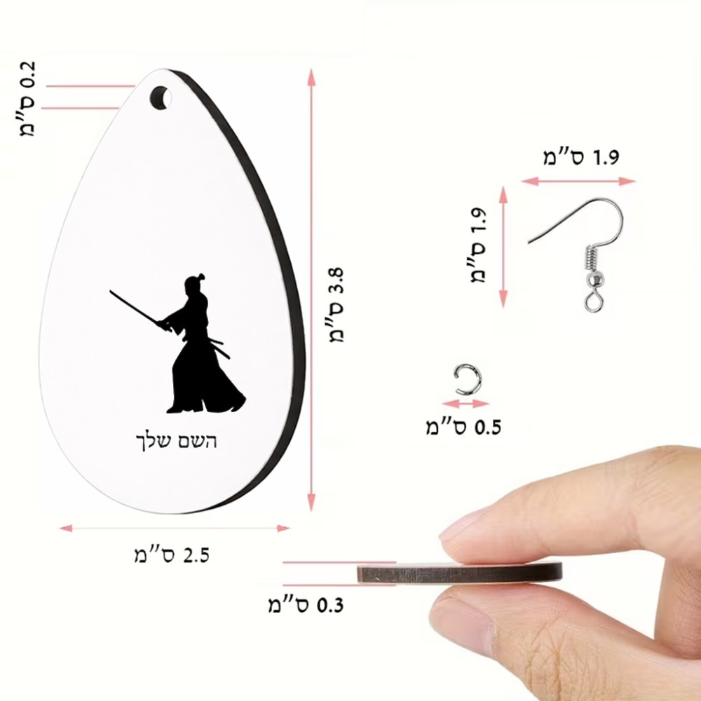 זוג עגילים בצורת טיפה בעיצוב אישי עם השם שלך בעיצוב סמוראי גודל העגילים 2.5 × 3.8 ס"מ. את השם המבוקש ניתן לציין בהזמנה, אם לא צויין אנחנו ניצור קשר לבירור.