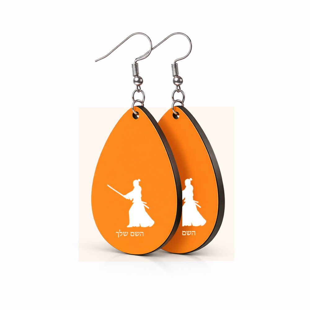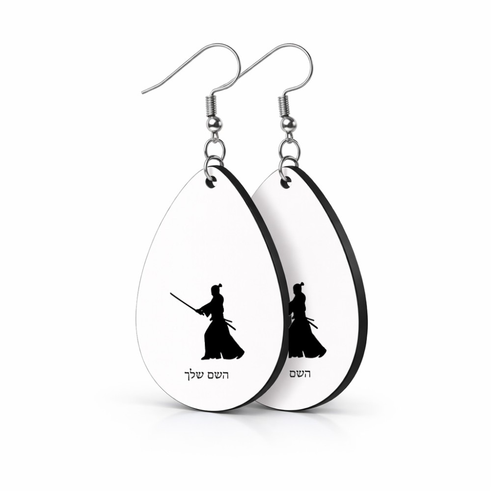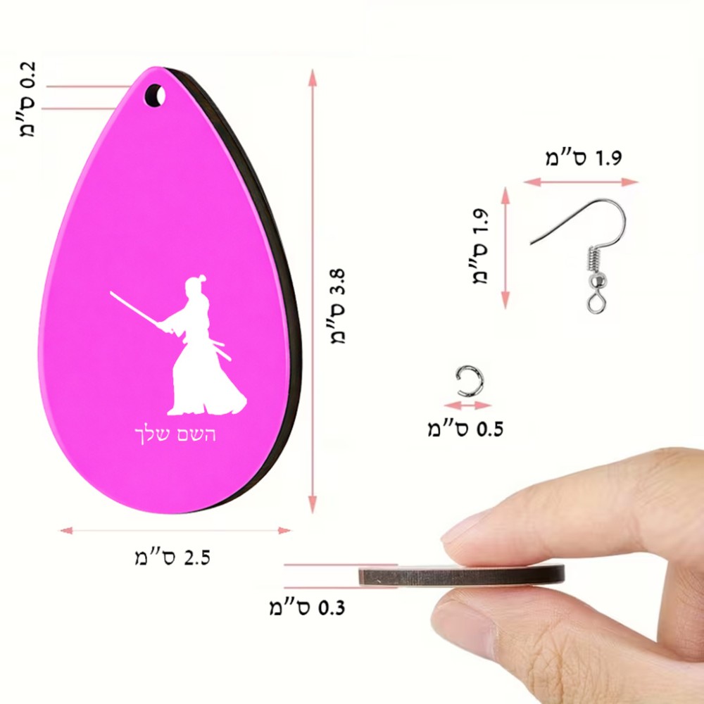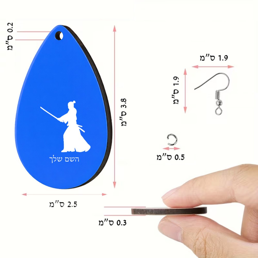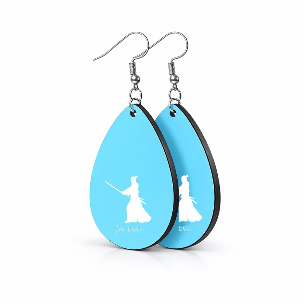 זוג עגילים בצורת טיפה בעיצוב אישי עם השם שלך בעיצוב סמוראי גודל העגילים 2.5 × 3.8 ס"מ. את השם המבוקש ניתן לציין בהזמנה, אם לא צויין אנחנו ניצור קשר לבירור.