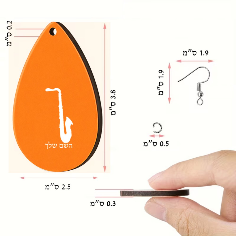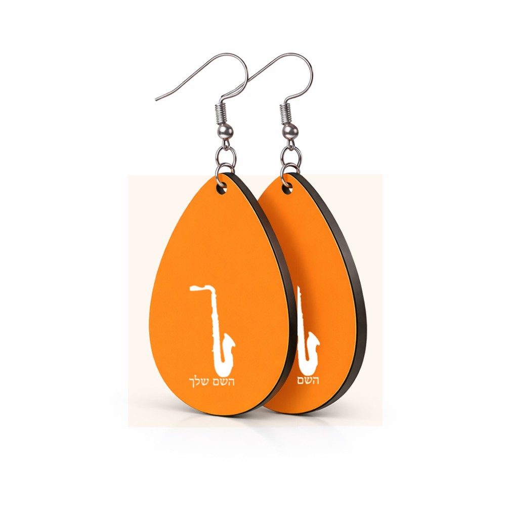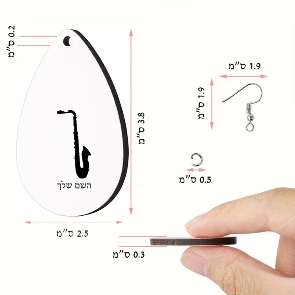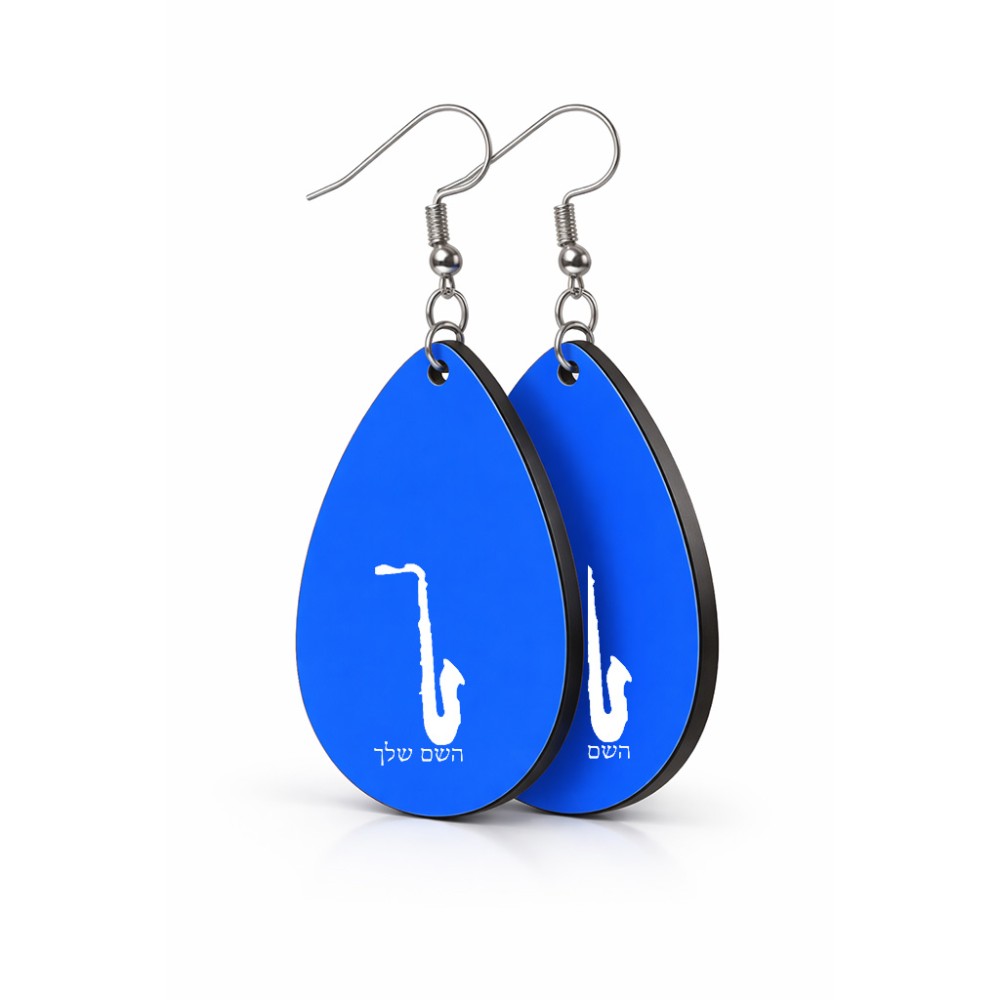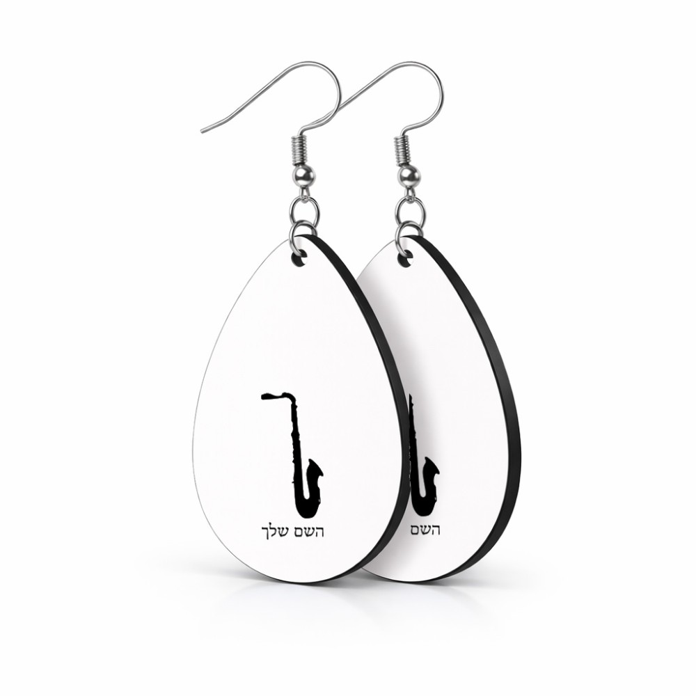 זוג עגילים בצורת טיפה בעיצוב אישי עם השם שלך בעיצוב סקסופון גודל העגילים 2.5 × 3.8 ס"מ. את השם המבוקש ניתן לציין בהזמנה, אם לא צויין אנחנו ניצור קשר לבירור.
