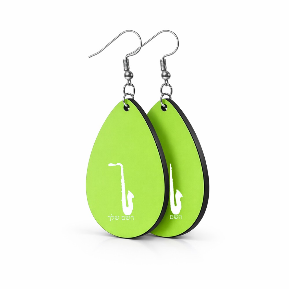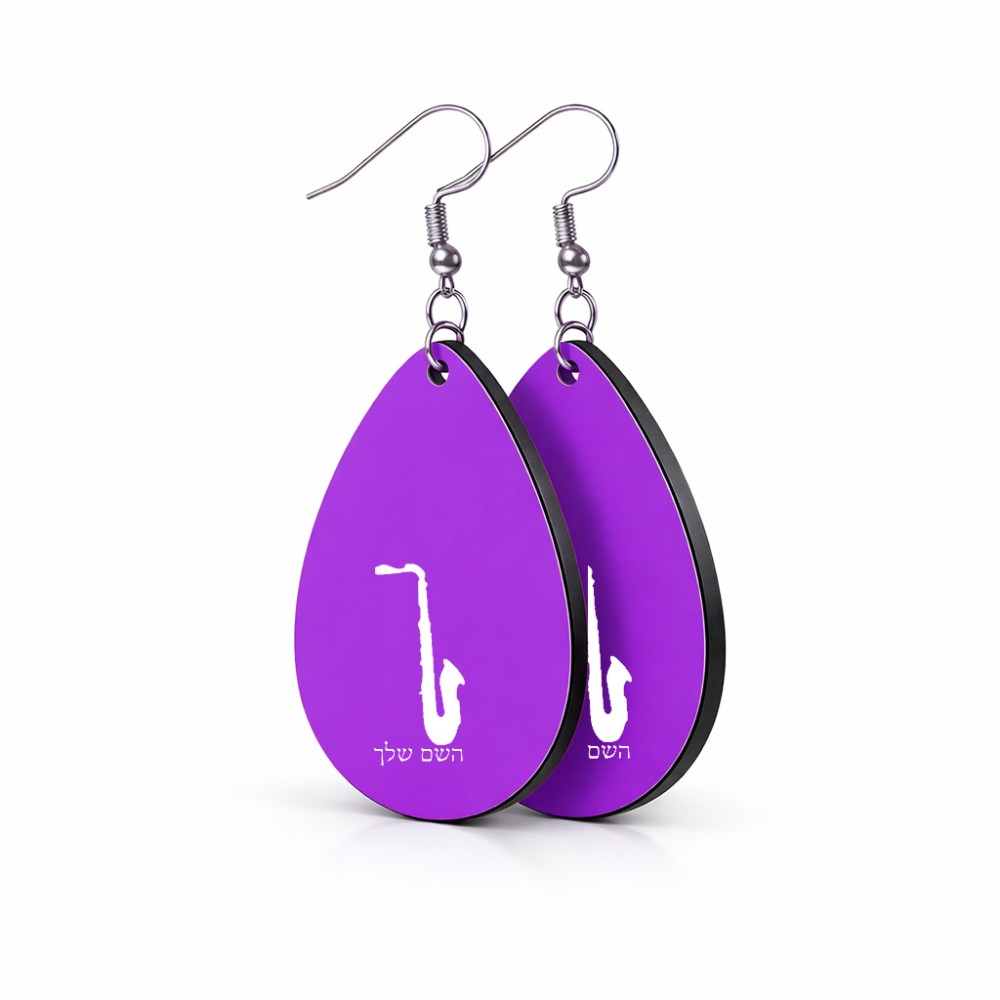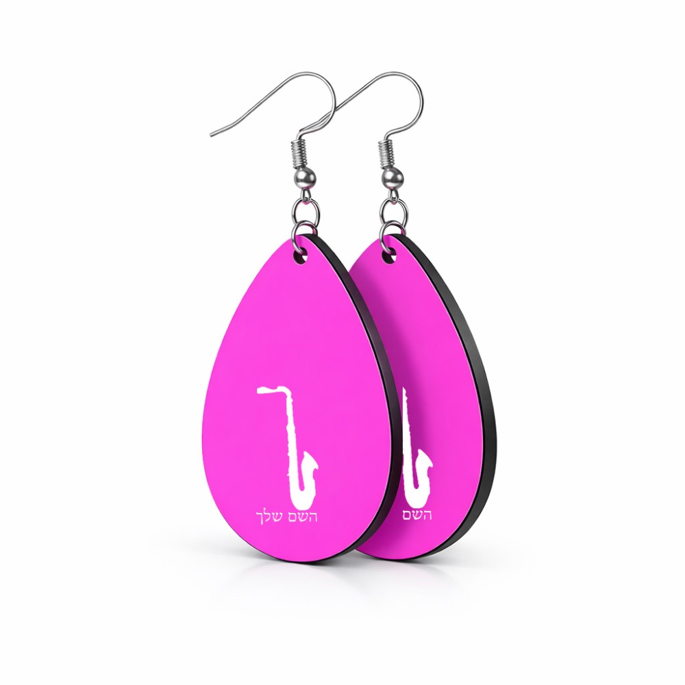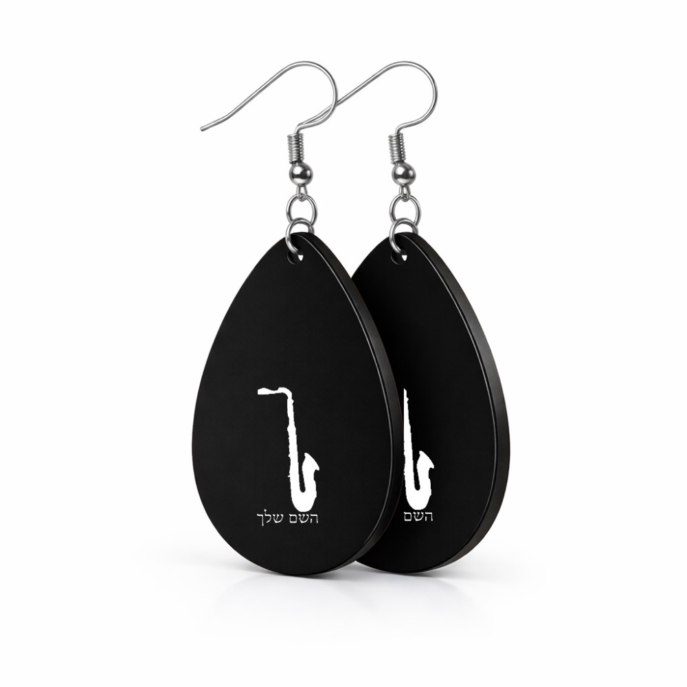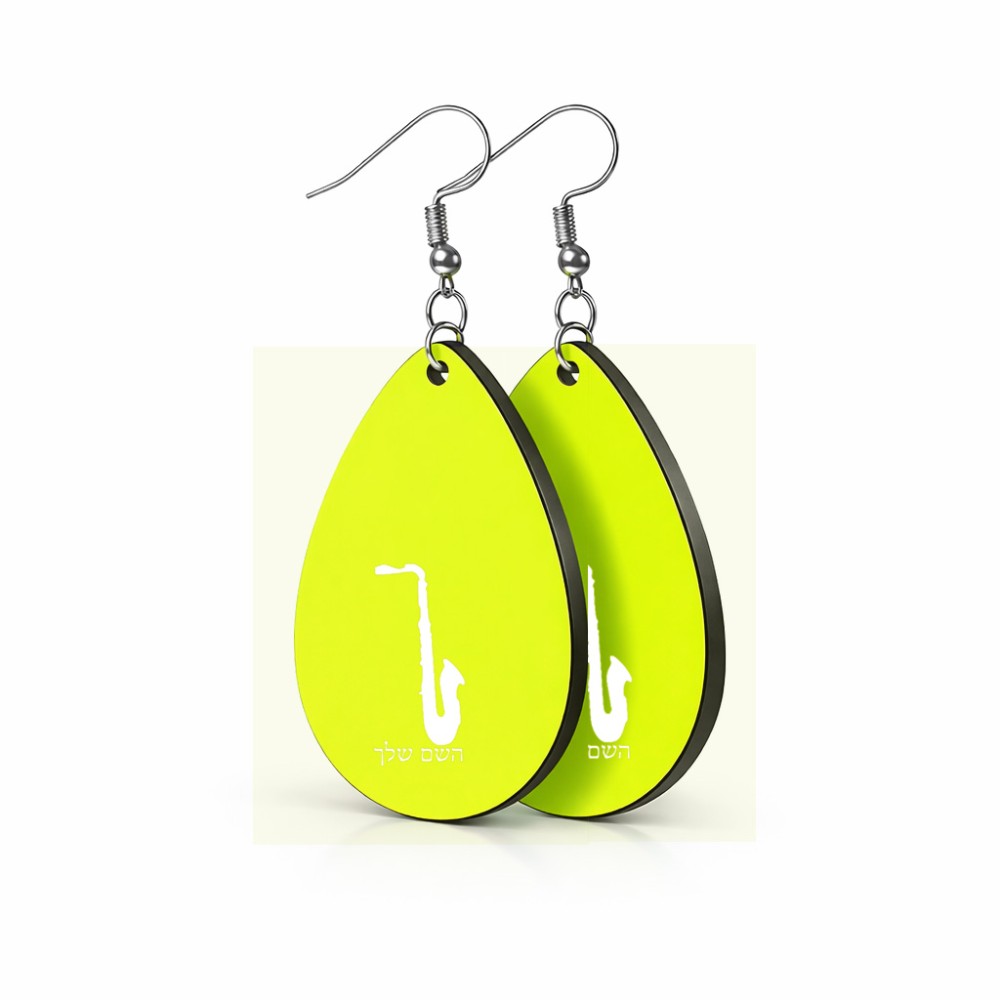 זוג עגילים בצורת טיפה בעיצוב אישי עם השם שלך בעיצוב סקסופון גודל העגילים 2.5 × 3.8 ס"מ. את השם המבוקש ניתן לציין בהזמנה, אם לא צויין אנחנו ניצור קשר לבירור.