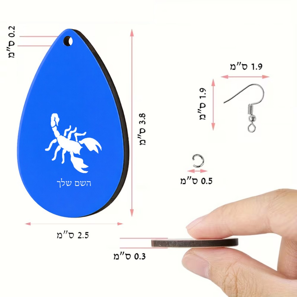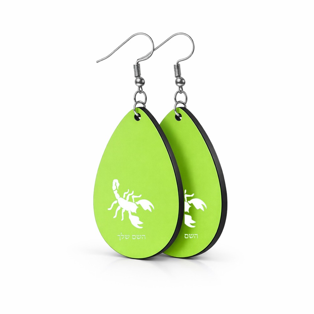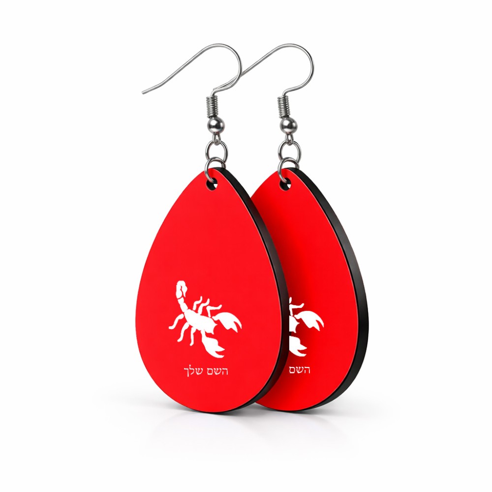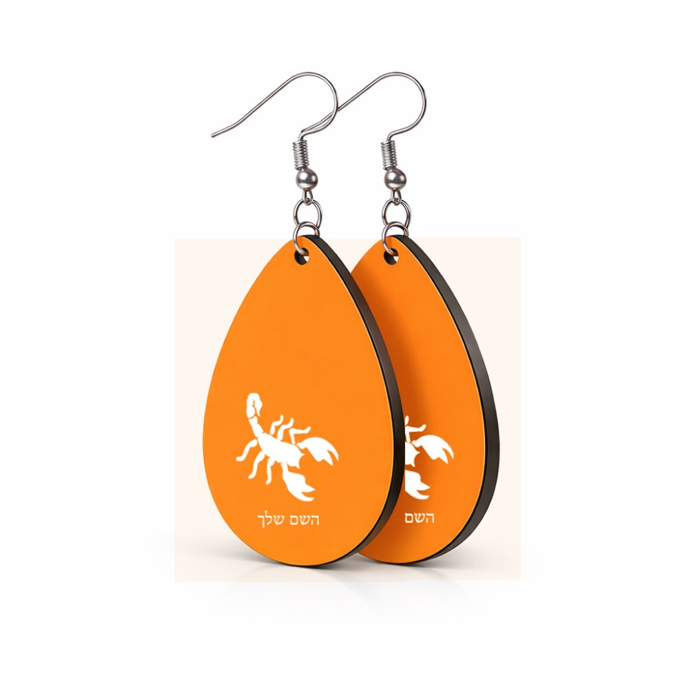 זוג עגילים בצורת טיפה בעיצוב אישי עם השם שלך בעיצוב עקרב גודל העגילים 2.5 × 3.8 ס"מ. את השם המבוקש ניתן לציין בהזמנה, אם לא צויין אנחנו ניצור קשר לבירור.
