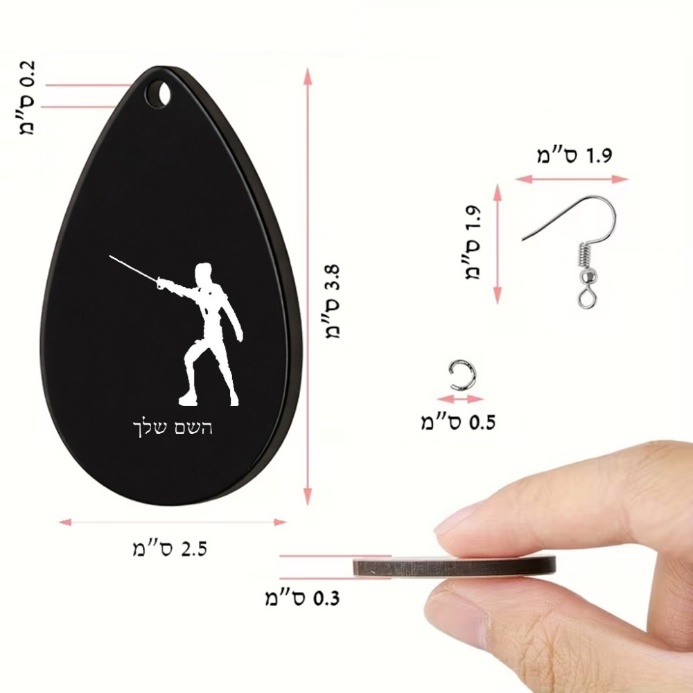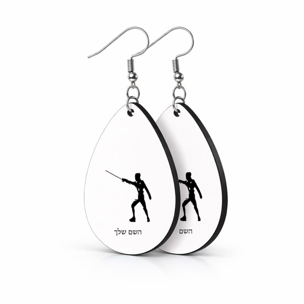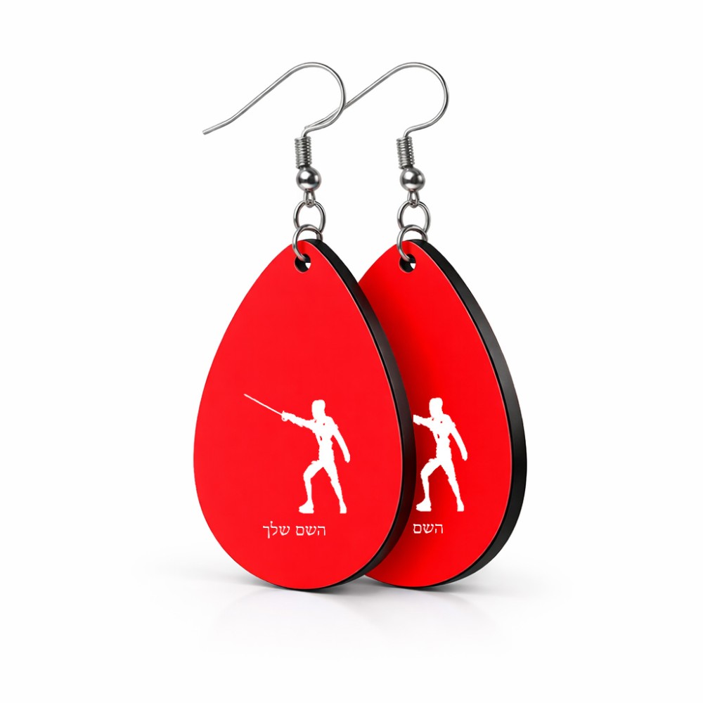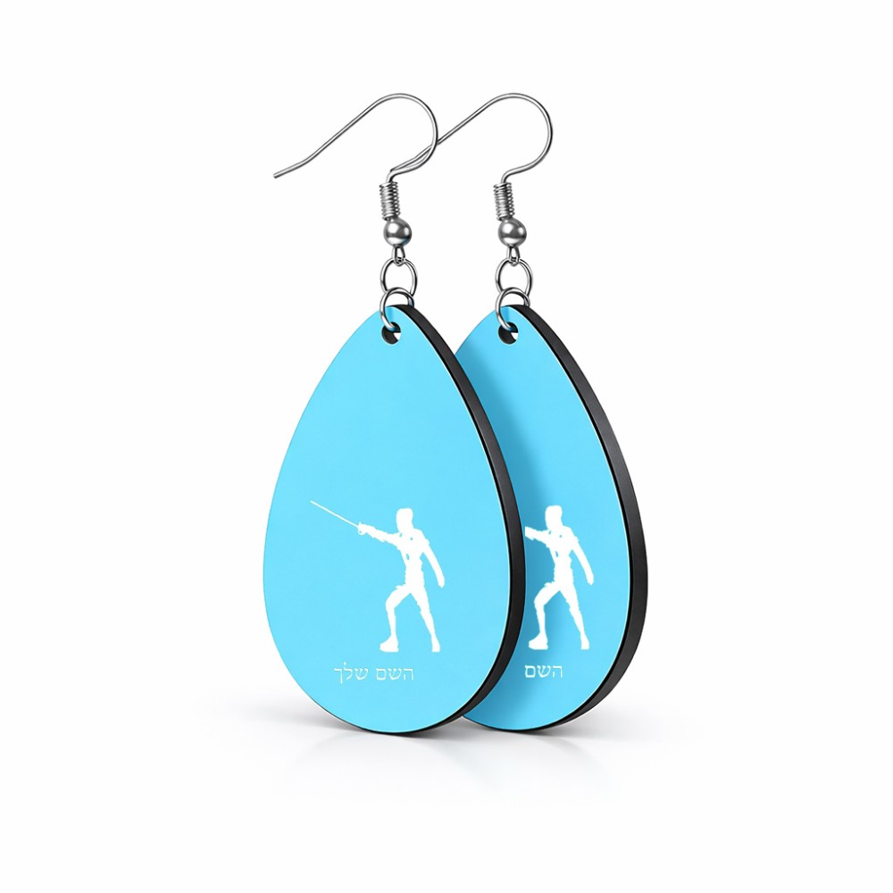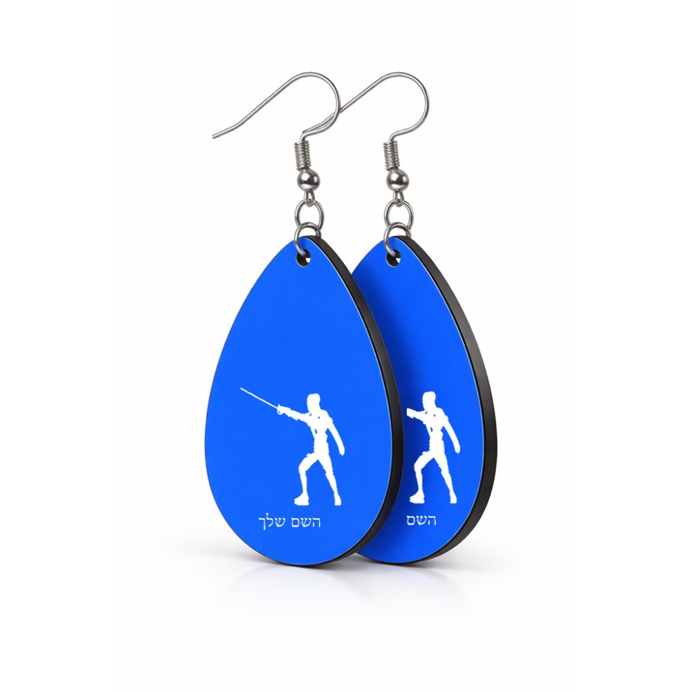 זוג עגילים בצורת טיפה בעיצוב אישי עם השם שלך בעיצוב לוחם סייף גודל העגילים 2.5 × 3.8 ס"מ. את השם המבוקש ניתן לציין בהזמנה, אם לא צויין אנחנו ניצור קשר לבירור.
