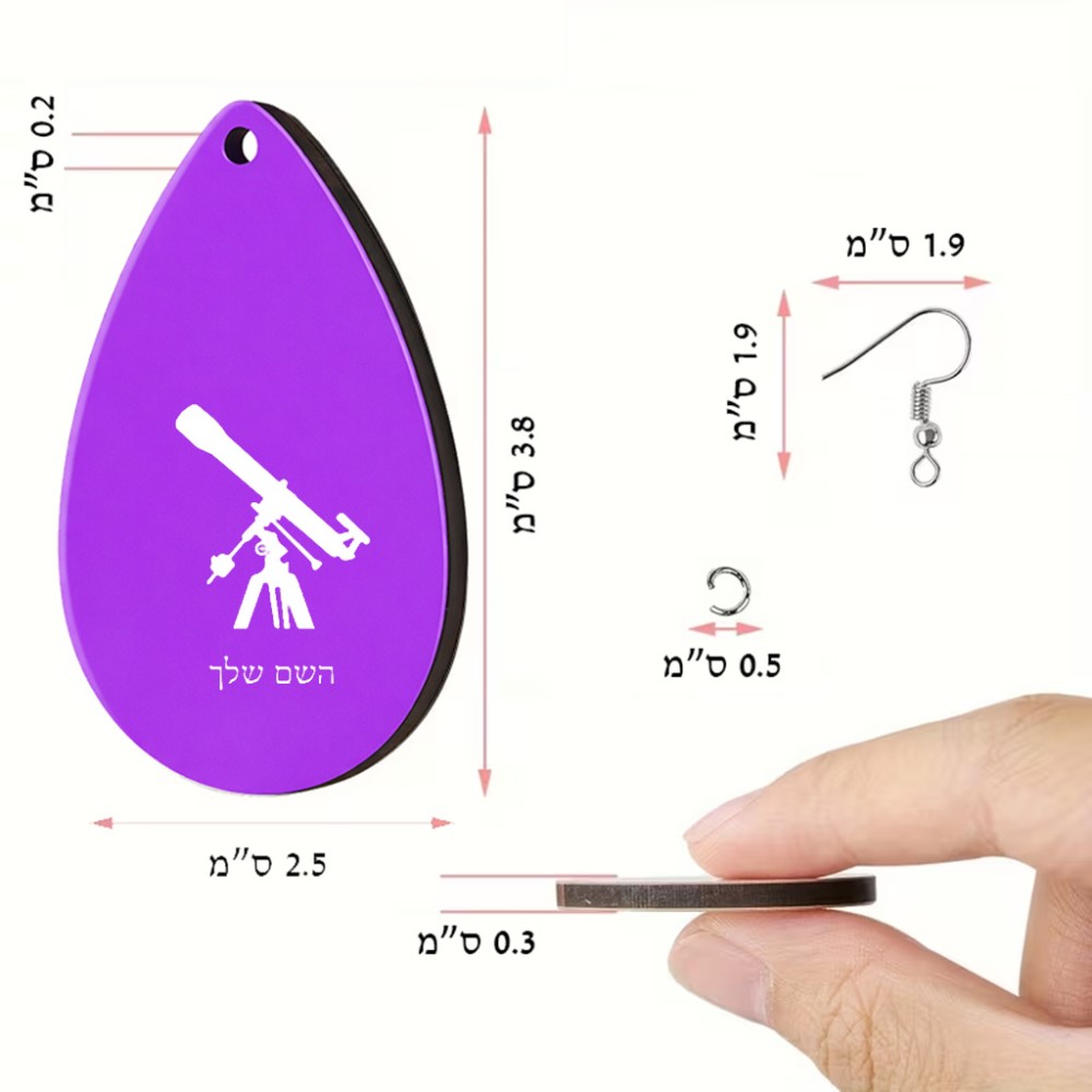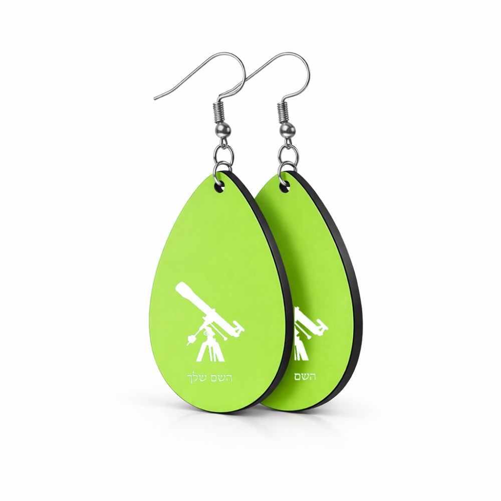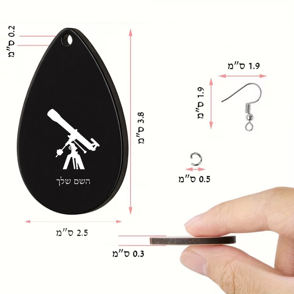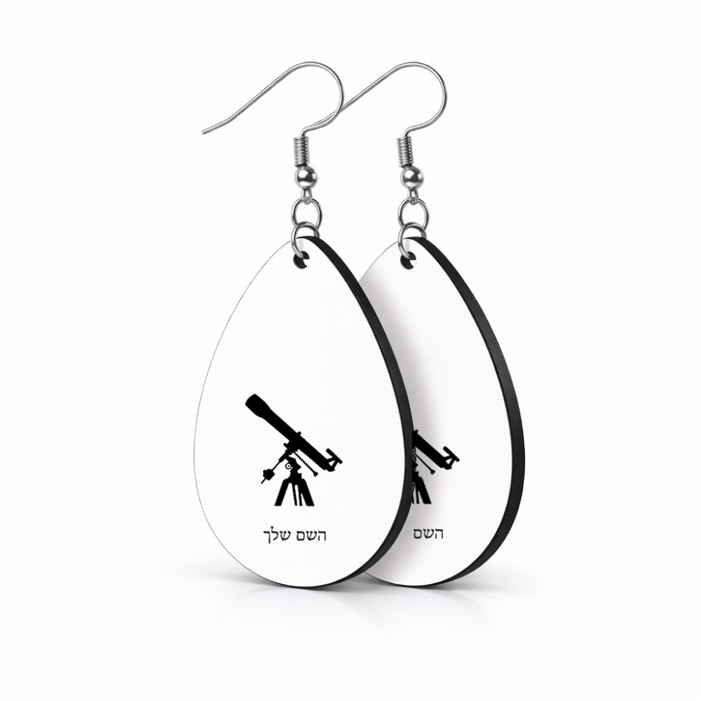 זוג עגילים בצורת טיפה בעיצוב אישי עם השם שלך בעיצוב טלסקופ גודל העגילים 2.5 × 3.8 ס"מ. את השם המבוקש ניתן לציין בהזמנה, אם לא צויין אנחנו ניצור קשר לבירור.