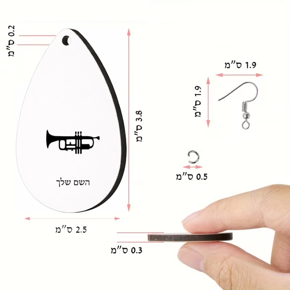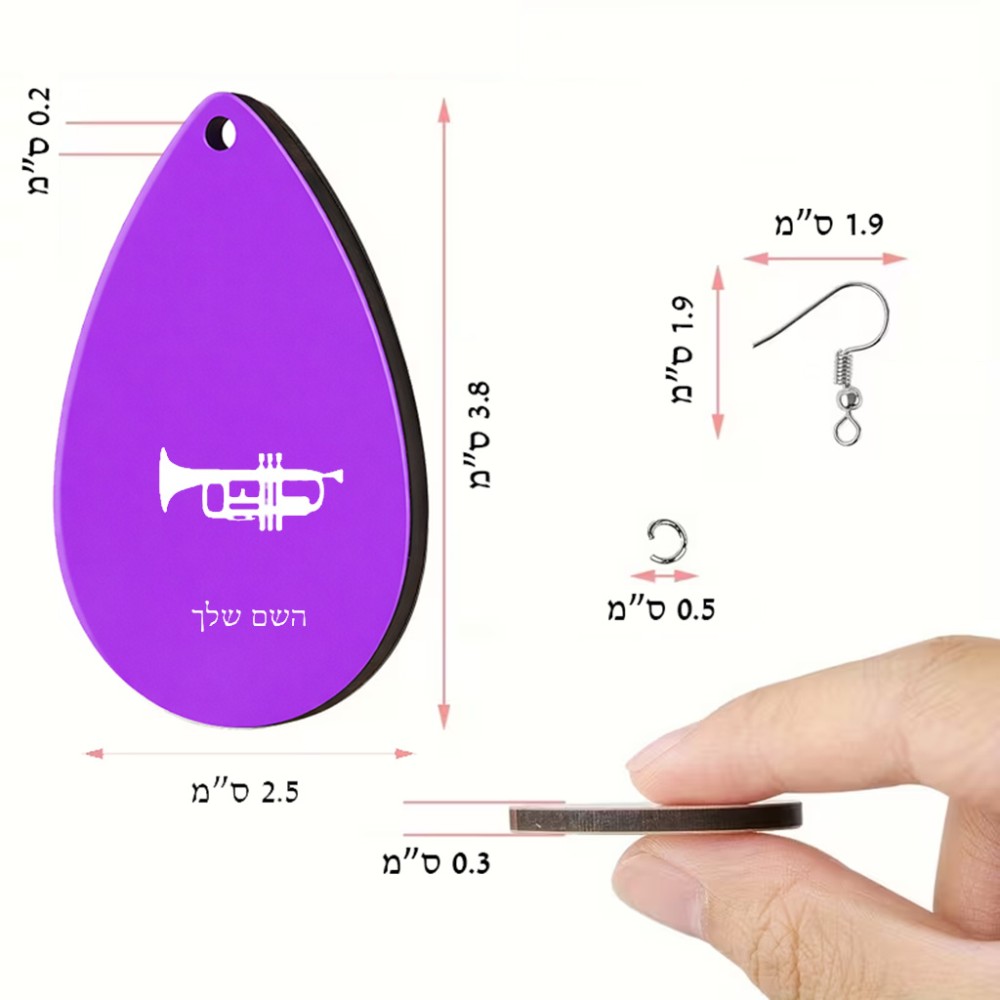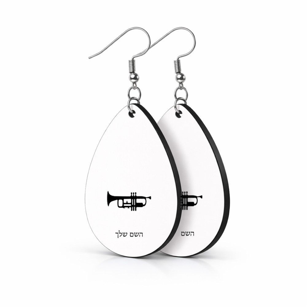 זוג עגילים בצורת טיפה בעיצוב אישי עם השם שלך בעיצוב חצוצרה גודל העגילים 2.5 × 3.8 ס"מ. את השם המבוקש ניתן לציין בהזמנה, אם לא צויין אנחנו ניצור קשר לבירור.