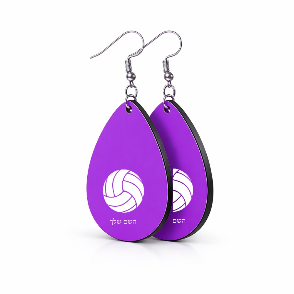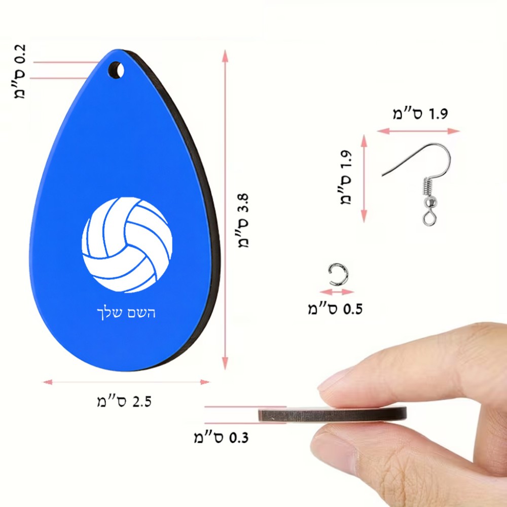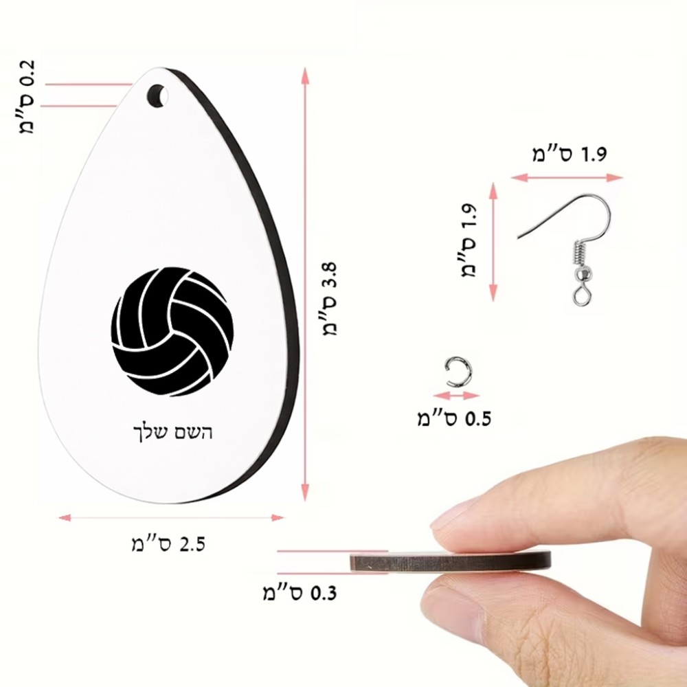 זוג עגילים בצורת טיפה בעיצוב אישי עם השם שלך בעיצוב כדור כדורעף גודל העגילים 2.5 × 3.8 ס"מ. את השם המבוקש ניתן לציין בהזמנה, אם לא צויין אנחנו ניצור קשר לבירור.