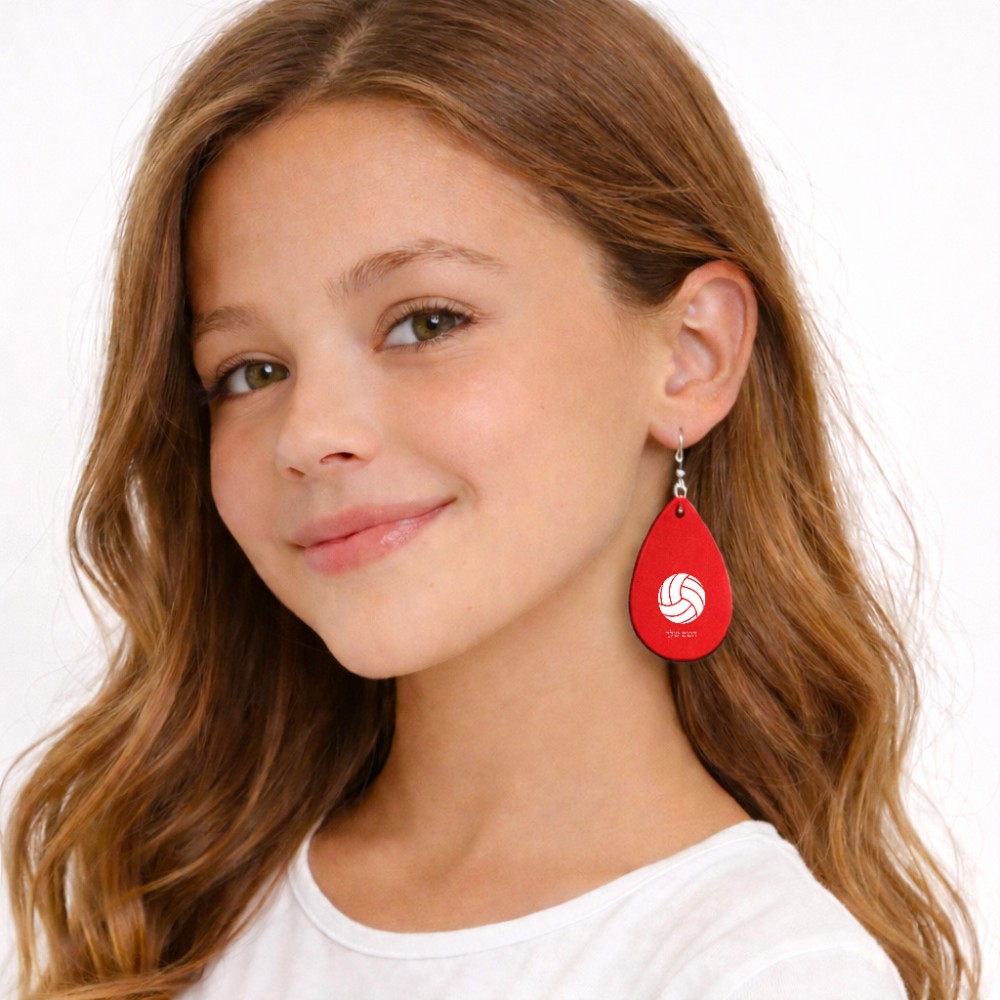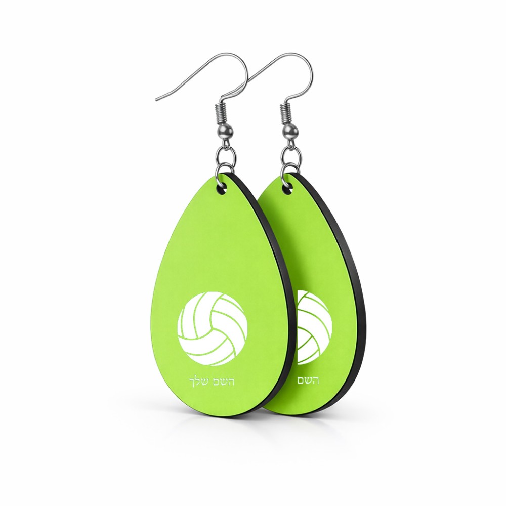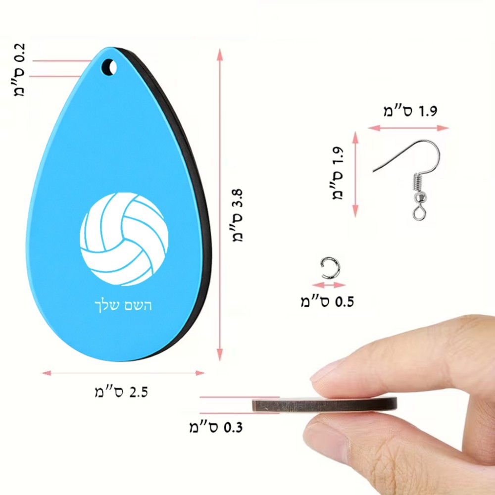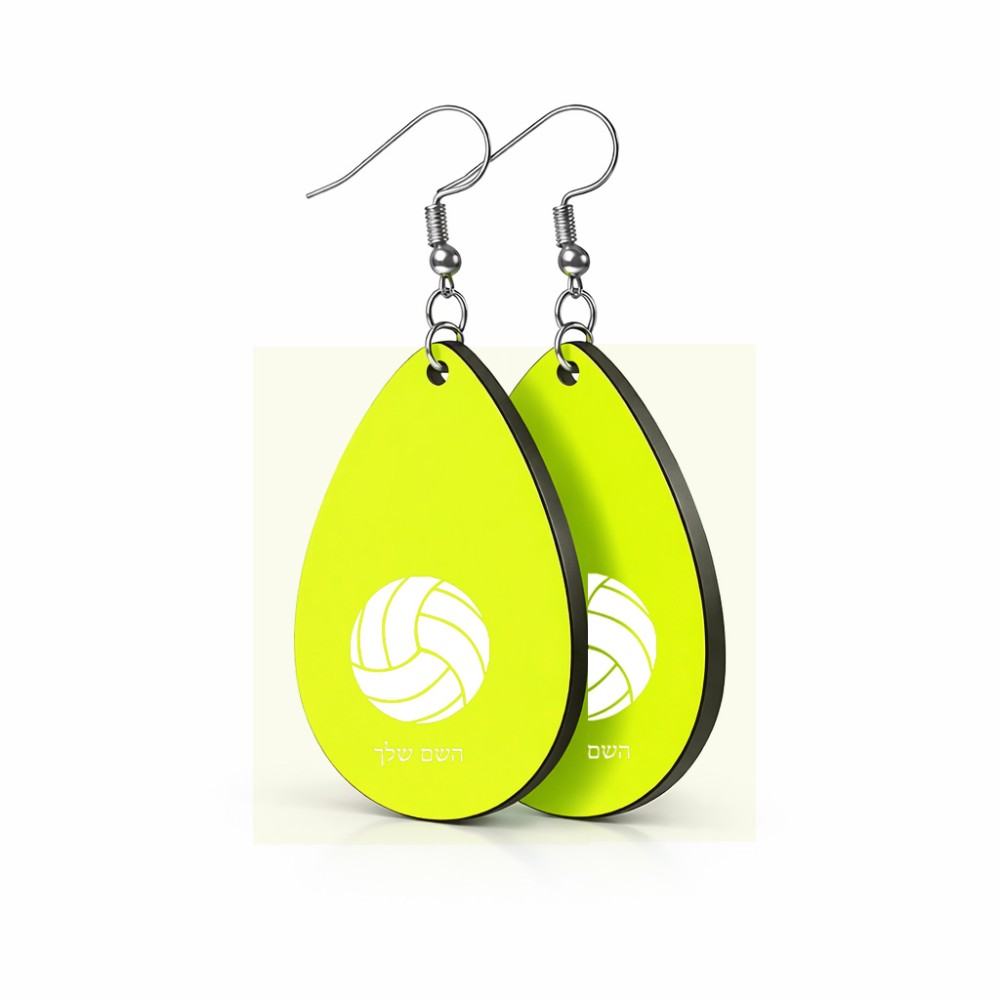 זוג עגילים בצורת טיפה בעיצוב אישי עם השם שלך בעיצוב כדור כדורעף גודל העגילים 2.5 × 3.8 ס"מ. את השם המבוקש ניתן לציין בהזמנה, אם לא צויין אנחנו ניצור קשר לבירור.