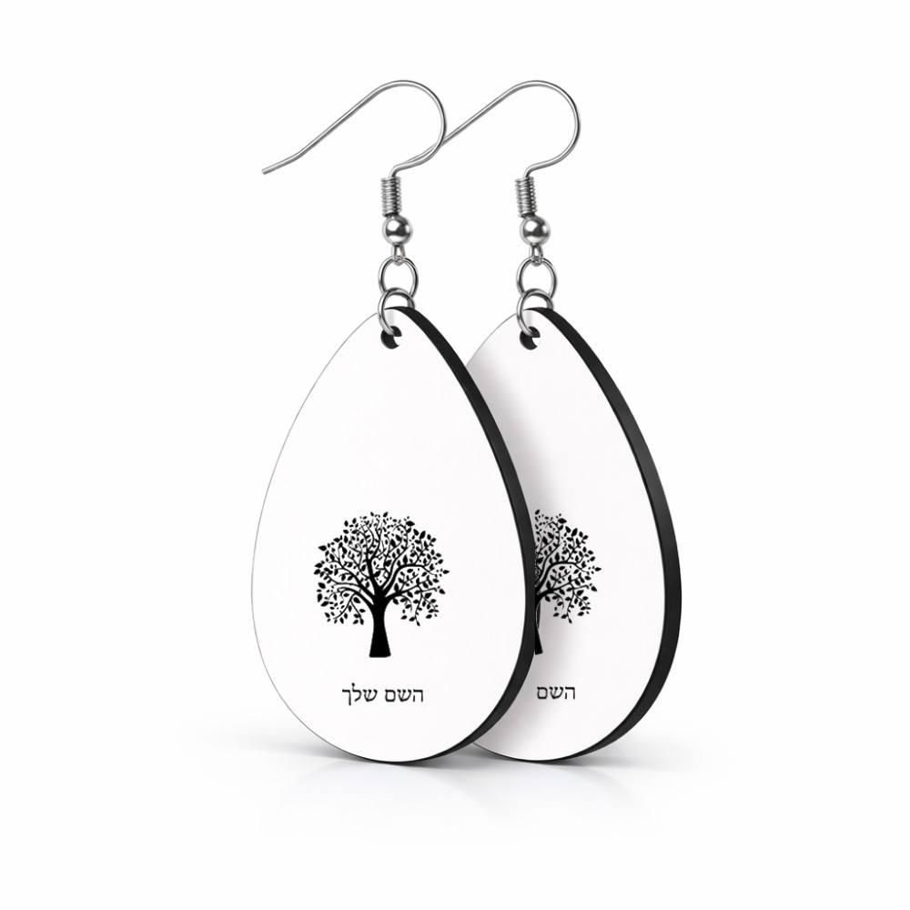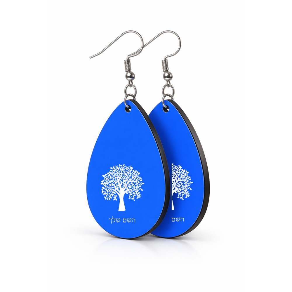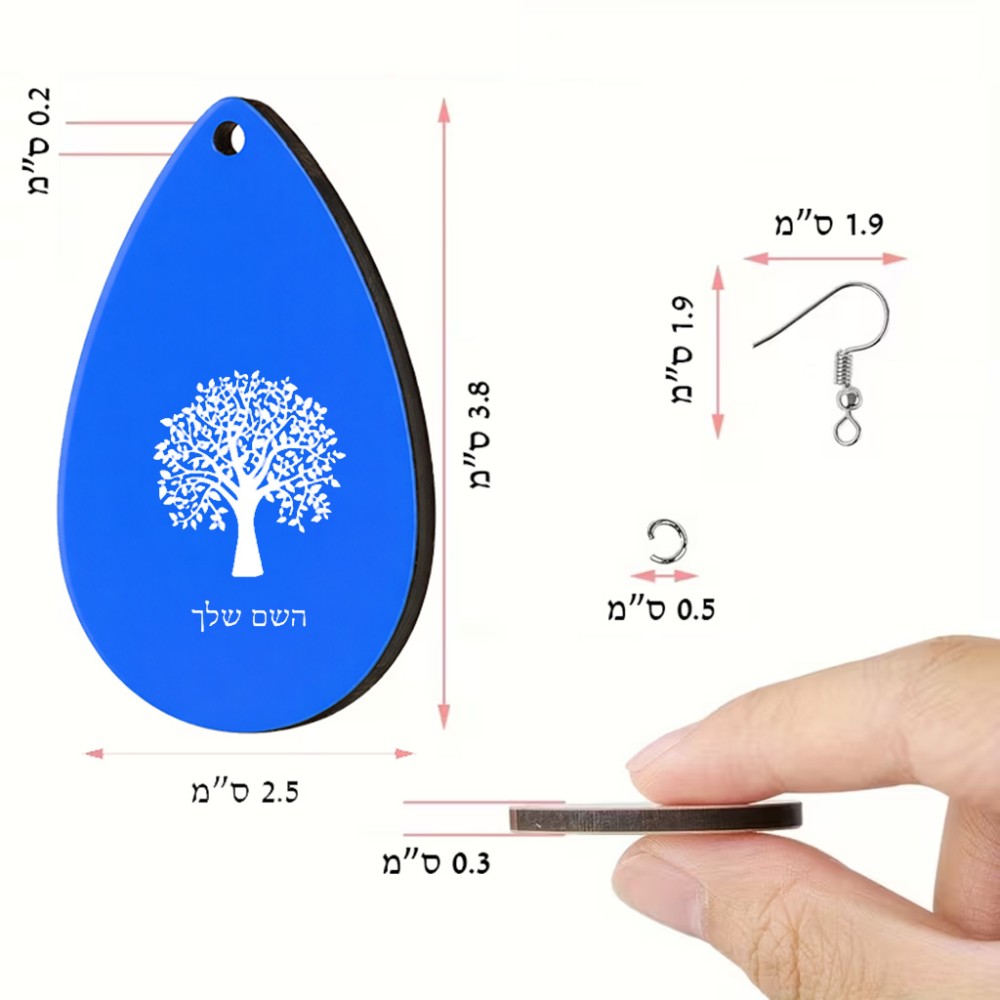 זוג עגילים בצורת טיפה בעיצוב אישי עם השם שלך בעיצוב עץ גודל העגילים 2.5 × 3.8 ס"מ. את השם המבוקש ניתן לציין בהזמנה, אם לא צויין אנחנו ניצור קשר לבירור.