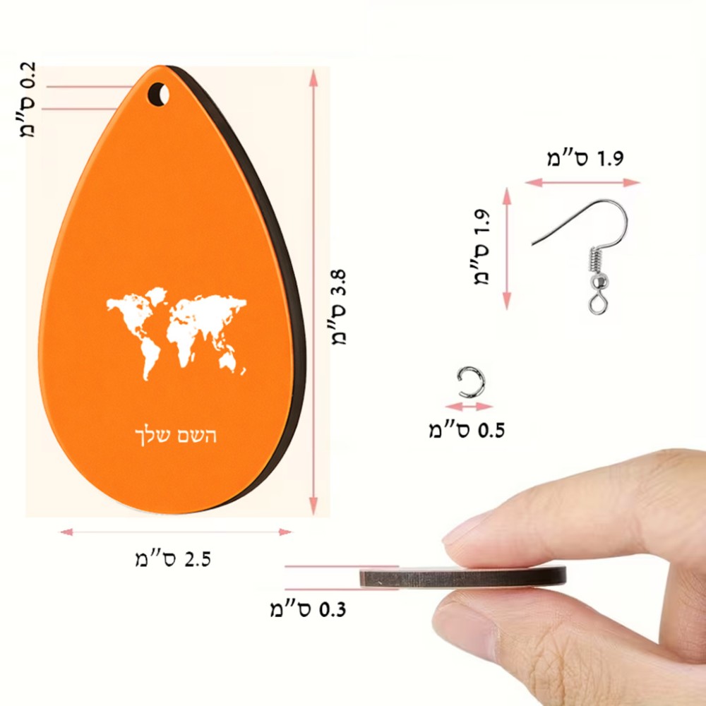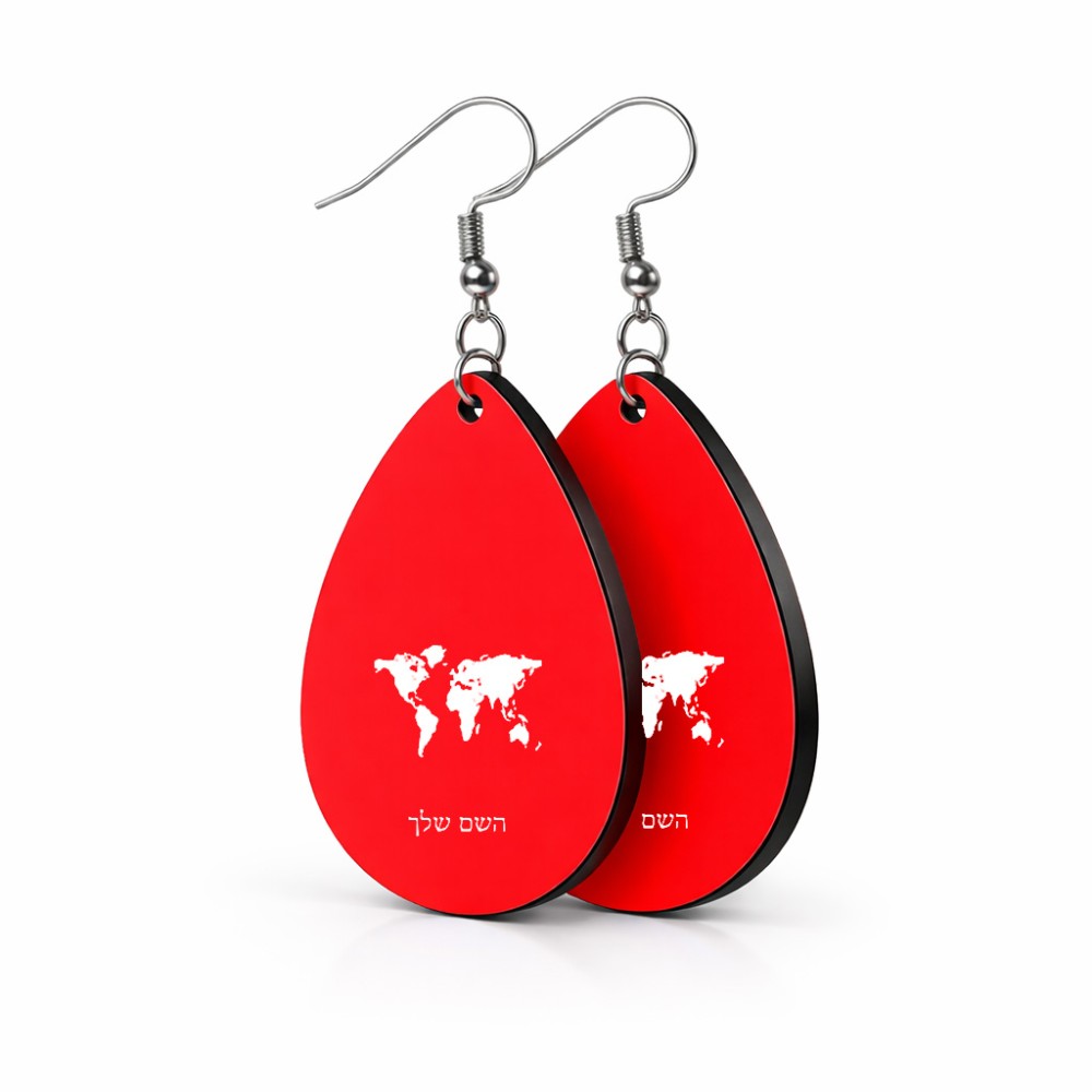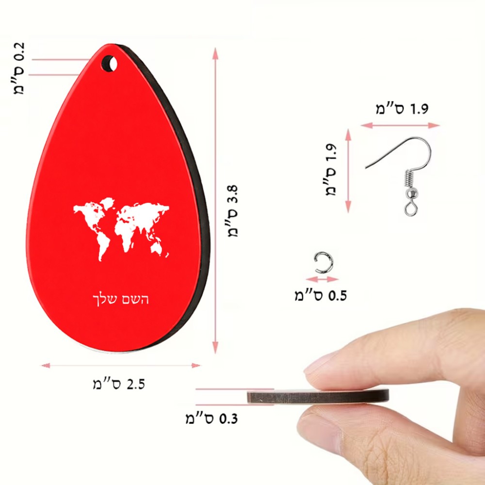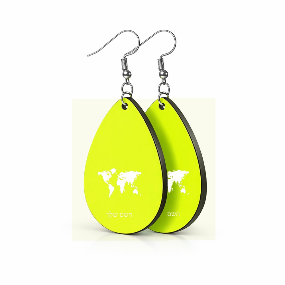 זוג עגילים בצורת טיפה בעיצוב אישי עם השם שלך בעיצוב מפת העולם גודל העגילים 2.5 × 3.8 ס"מ. את השם המבוקש ניתן לציין בהזמנה, אם לא צויין אנחנו ניצור קשר לבירור.