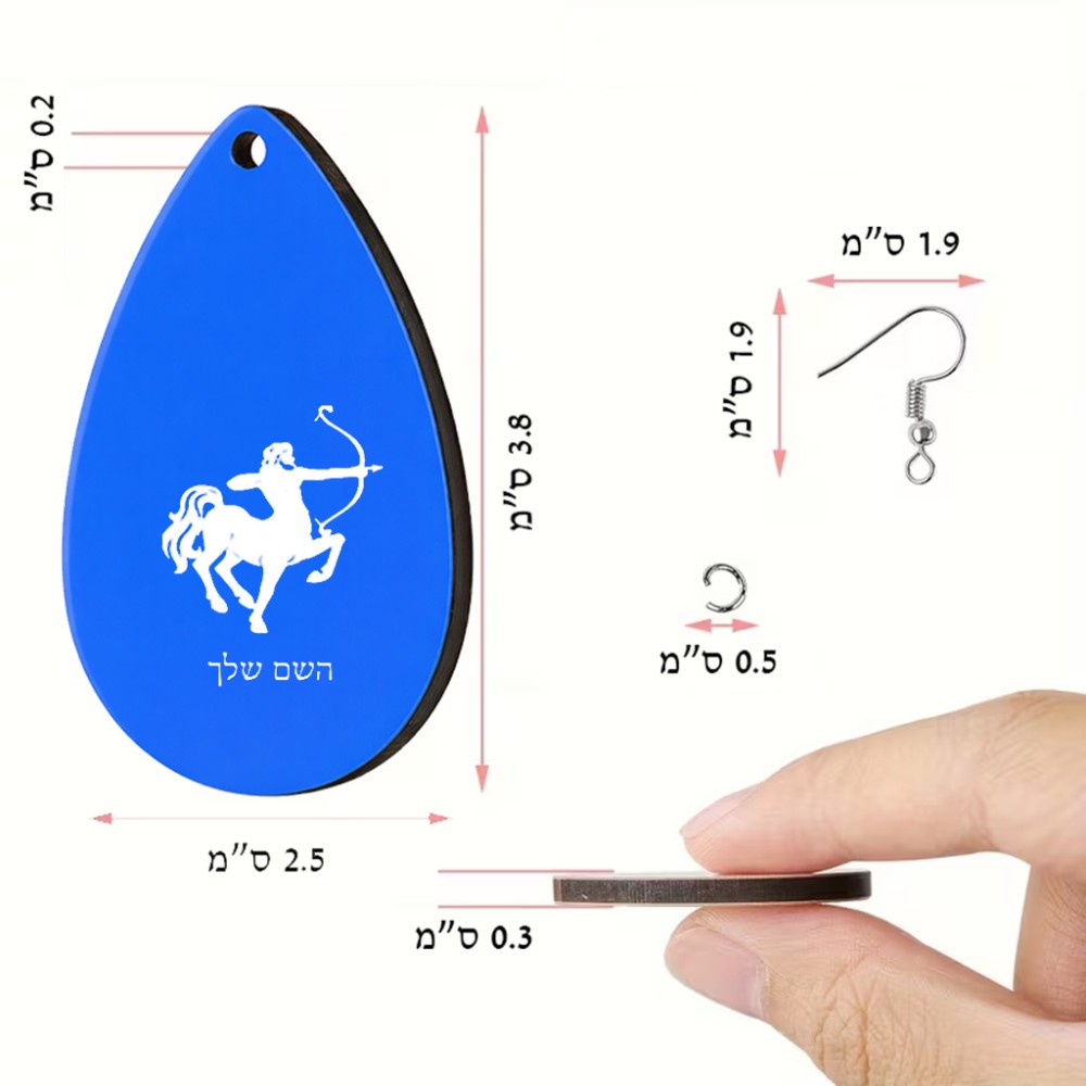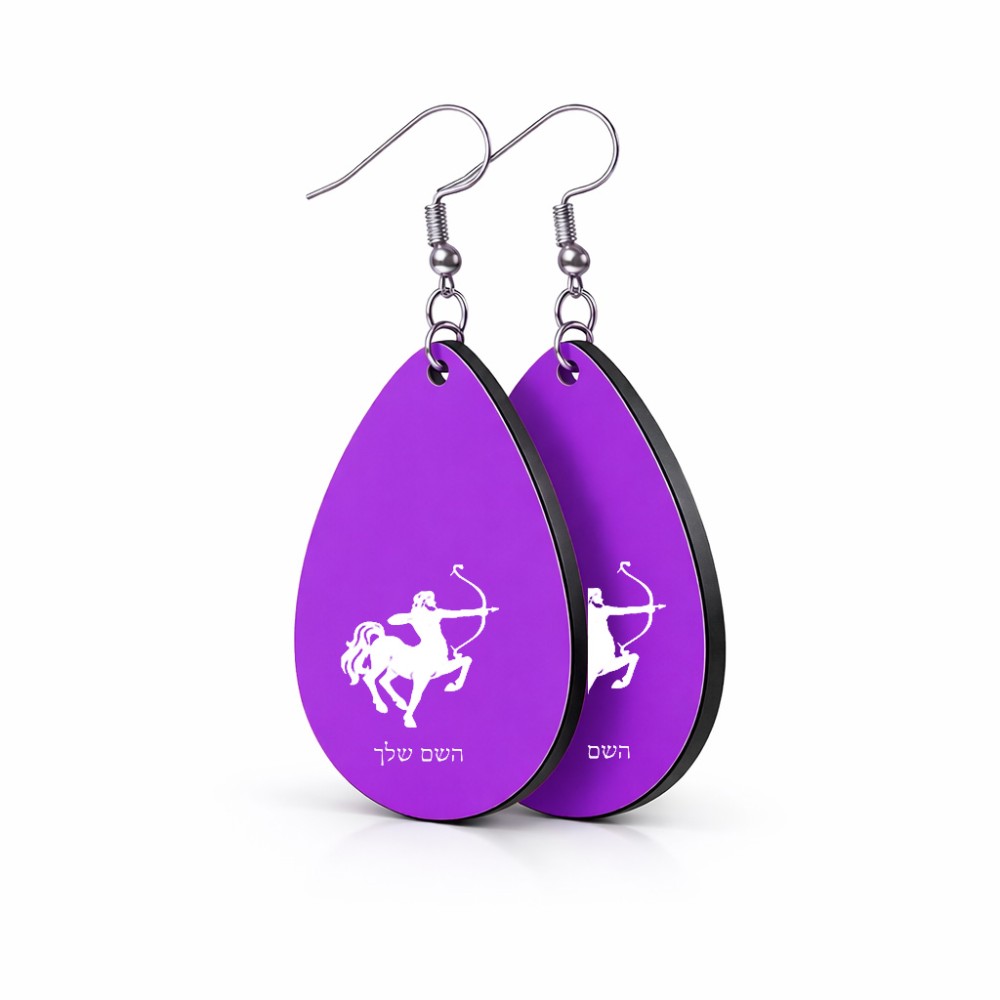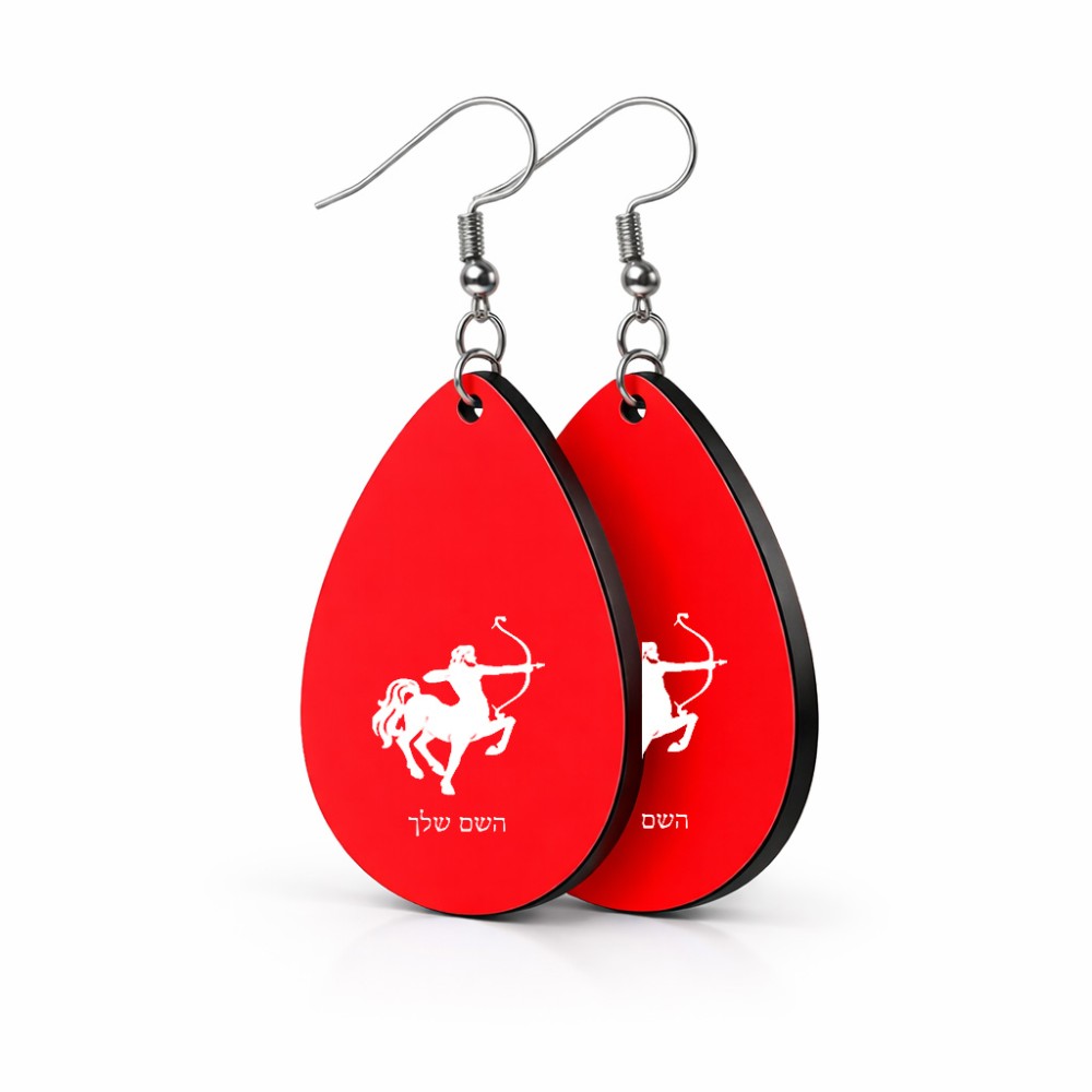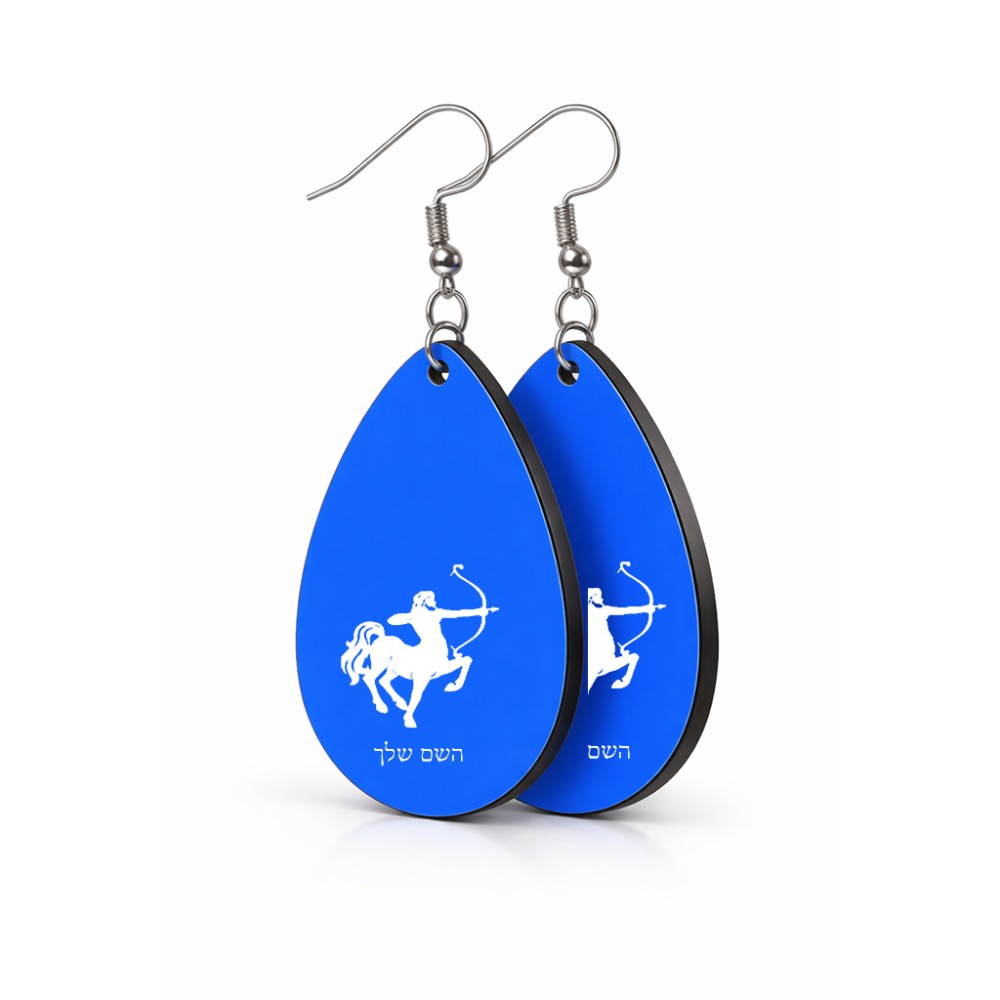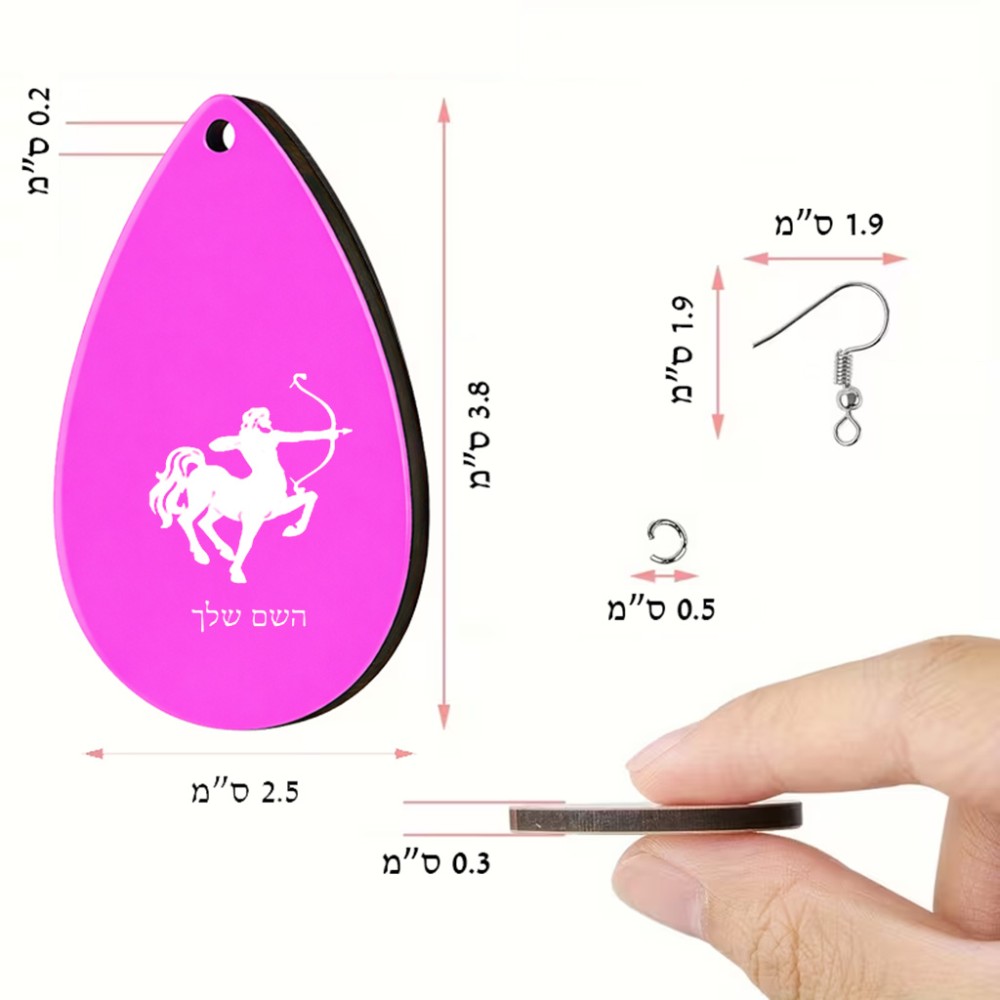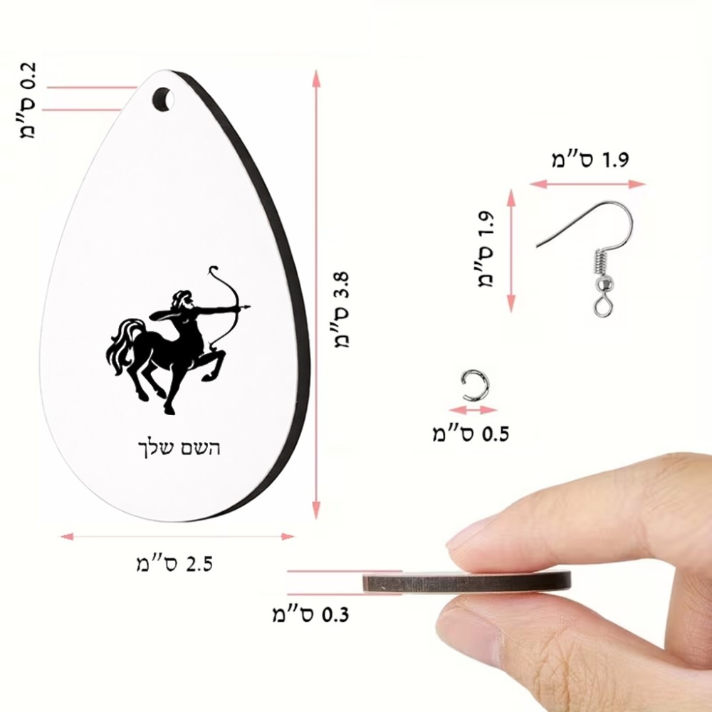 זוג עגילים בצורת טיפה בעיצוב אישי עם השם שלך בעיצוב מזלות - קשת גודל העגילים 2.5 × 3.8 ס"מ. את השם המבוקש ניתן לציין בהזמנה, אם לא צויין אנחנו ניצור קשר לבירור.