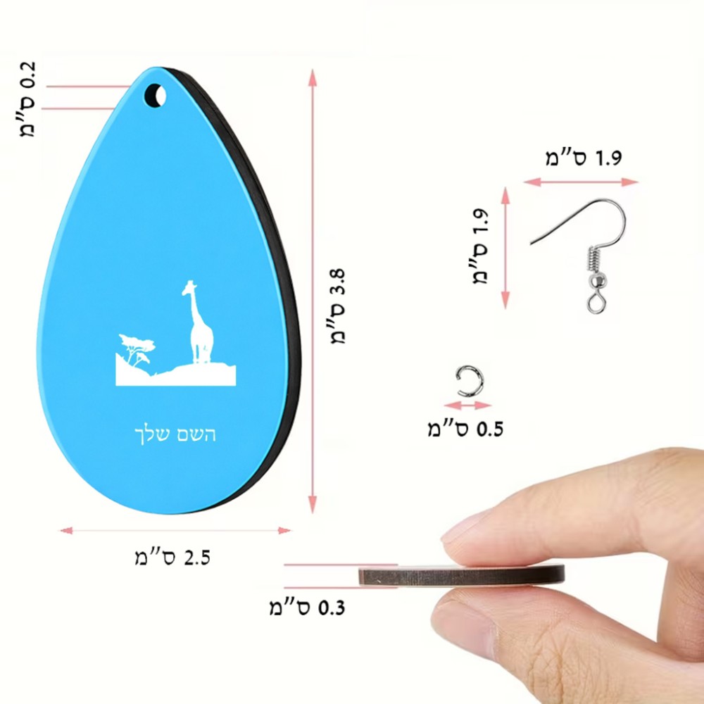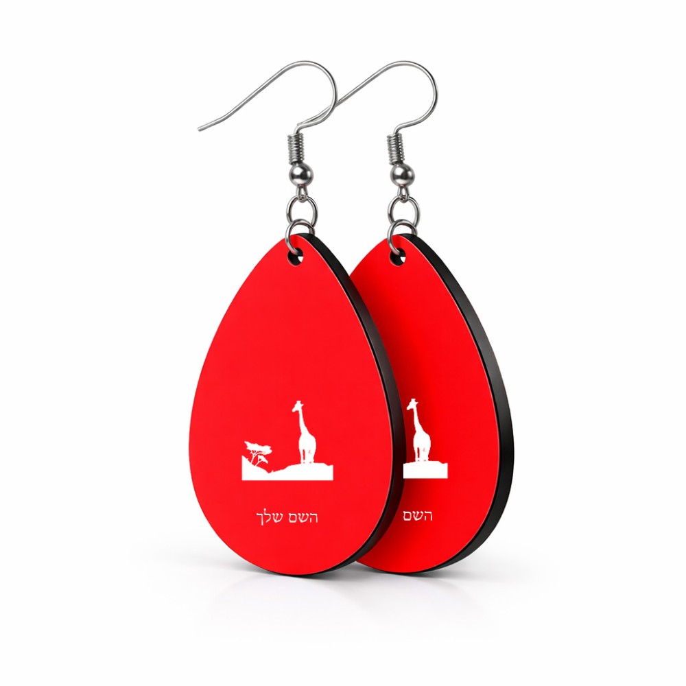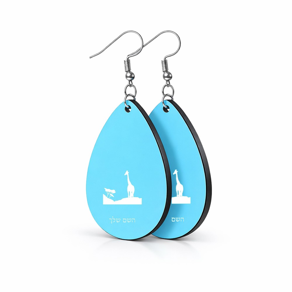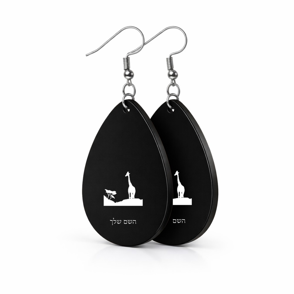 זוג עגילים בצורת טיפה בעיצוב אישי עם השם שלך בעיצוב ג'ירפה באפריקה גודל העגילים 2.5 × 3.8 ס"מ. את השם המבוקש ניתן לציין בהזמנה, אם לא צויין אנחנו ניצור קשר לבירור.