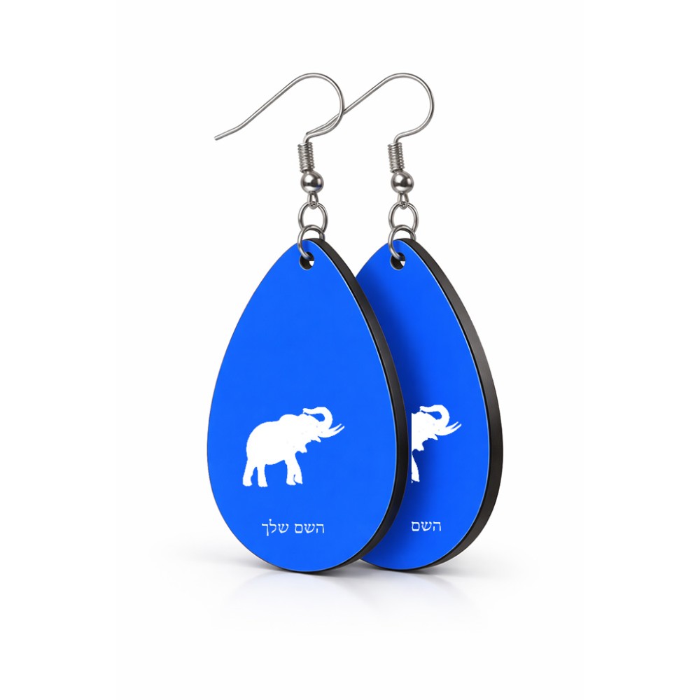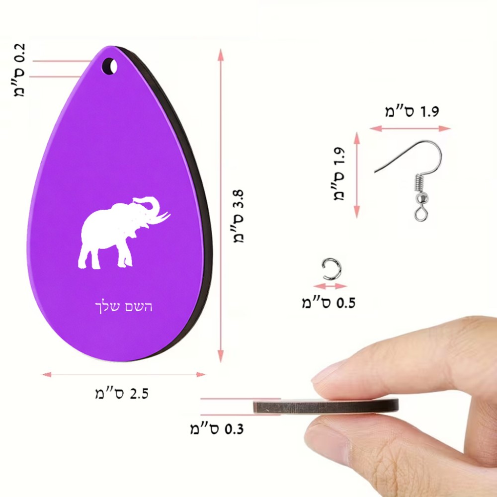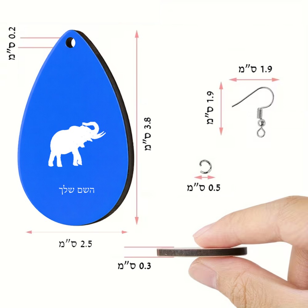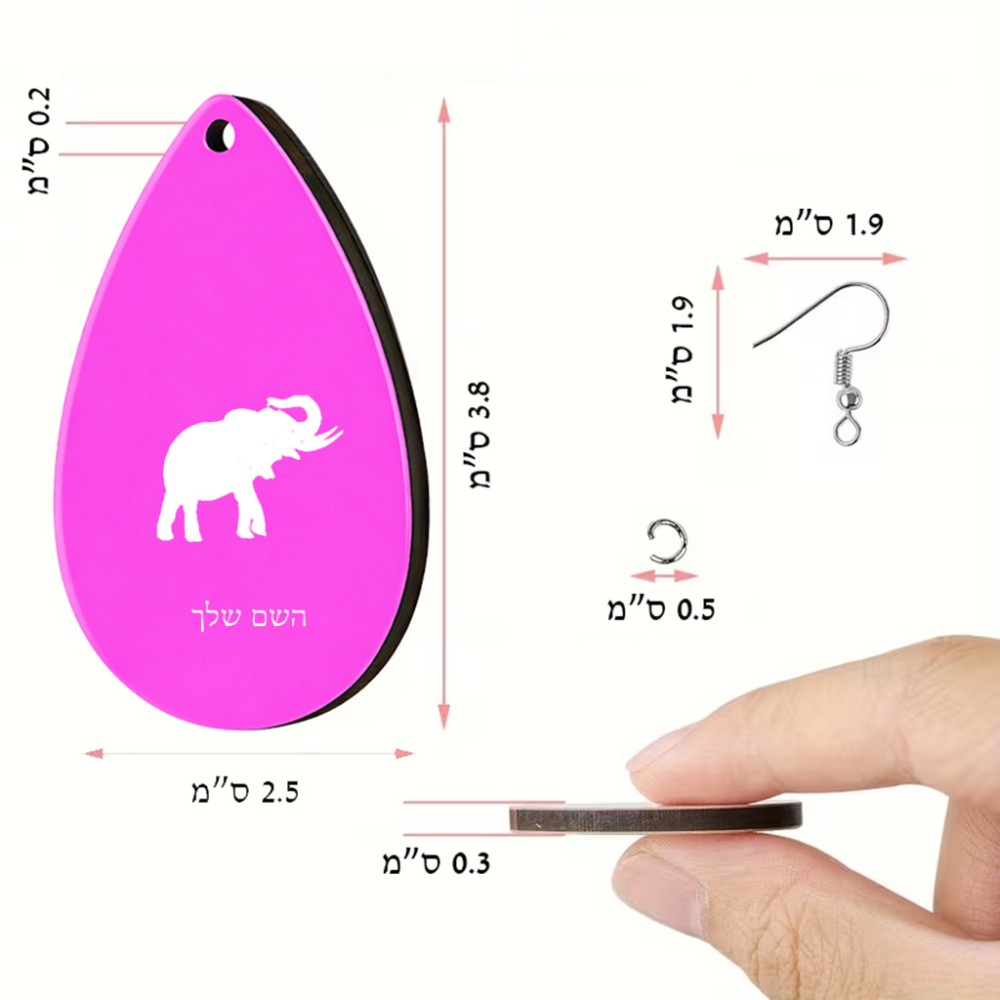 זוג עגילים בצורת טיפה בעיצוב אישי עם השם שלך בעיצוב פיל גודל העגילים 2.5 × 3.8 ס"מ. את השם המבוקש ניתן לציין בהזמנה, אם לא צויין אנחנו ניצור קשר לבירור.