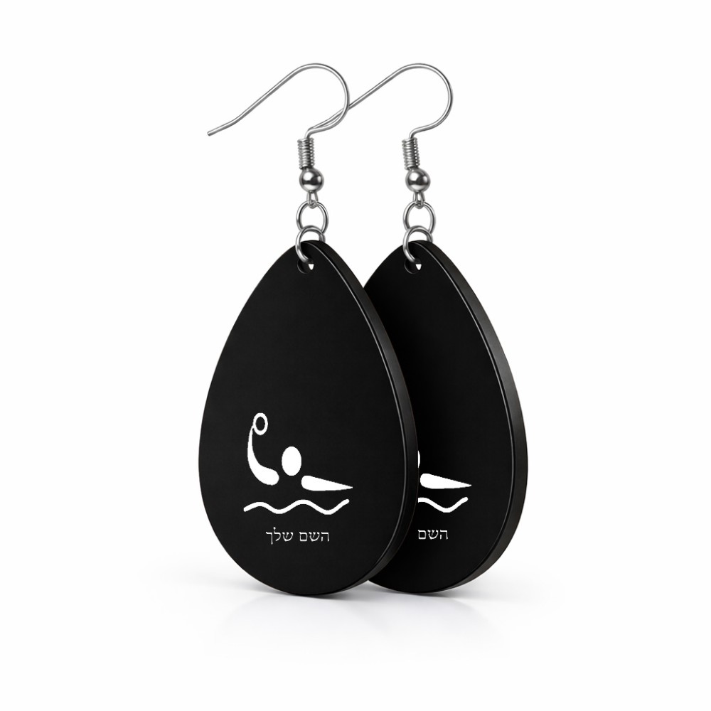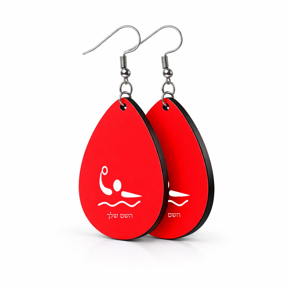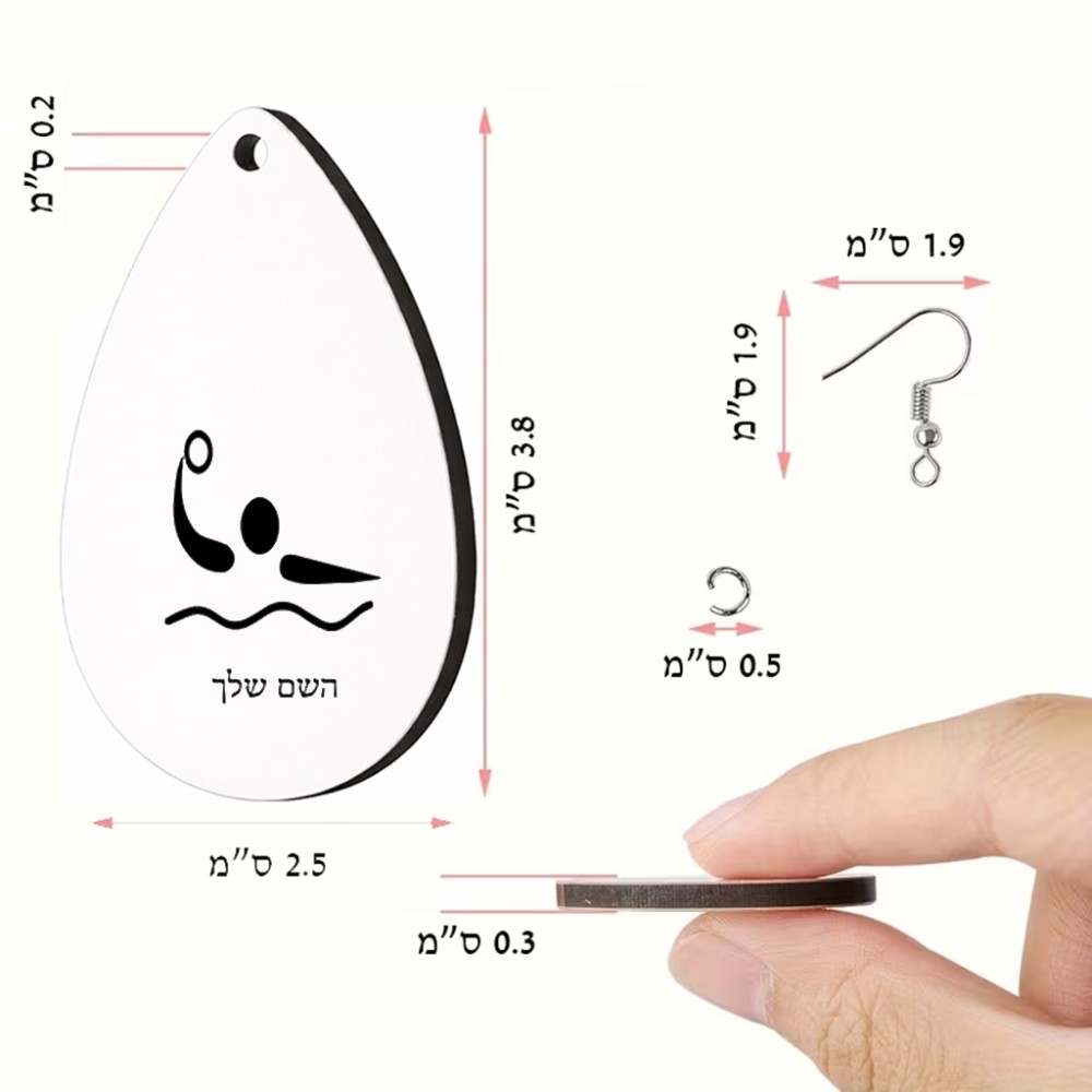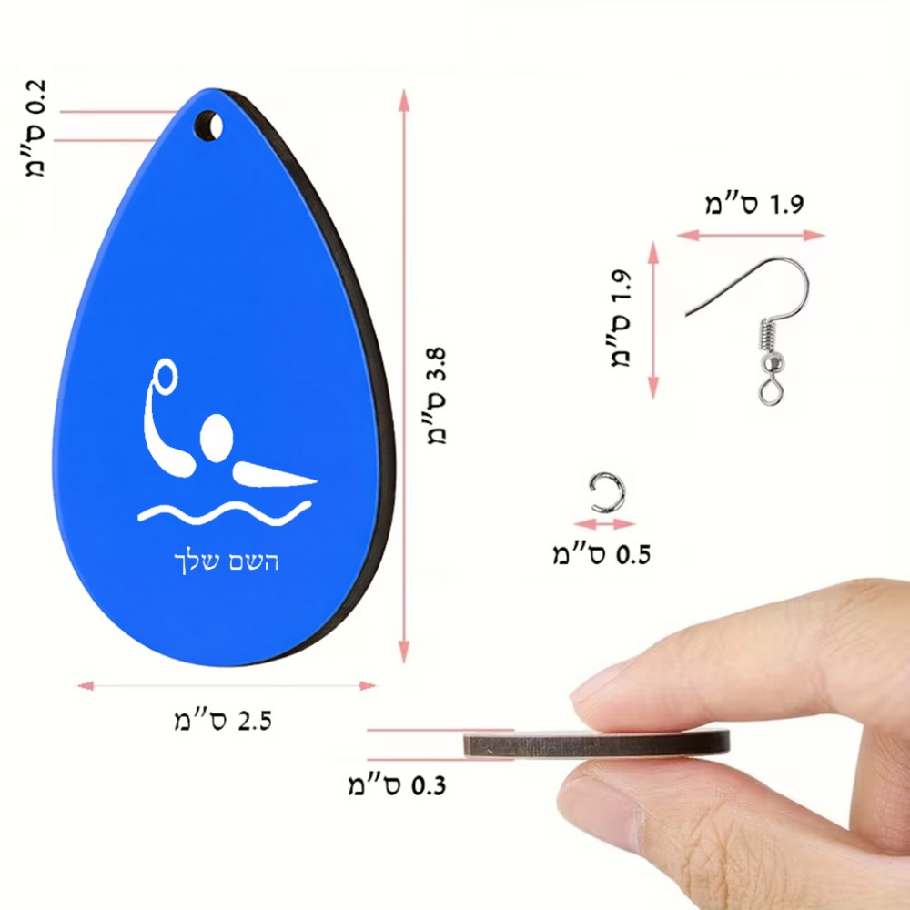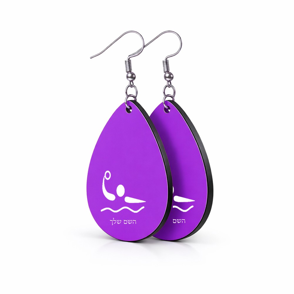 זוג עגילים בצורת טיפה בעיצוב אישי עם השם שלך בעיצוב כדור מים אולימפי גודל העגילים 2.5 × 3.8 ס"מ. את השם המבוקש ניתן לציין בהזמנה, אם לא צויין אנחנו ניצור קשר לבירור.