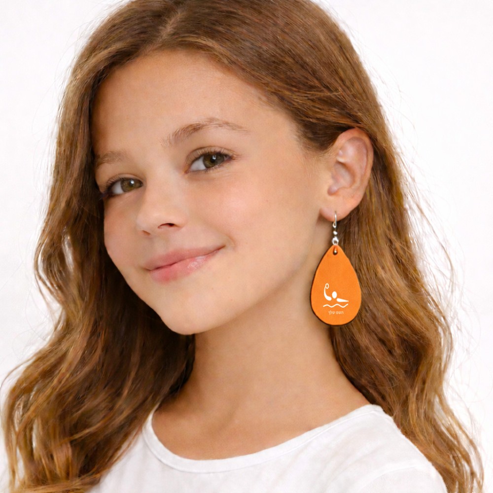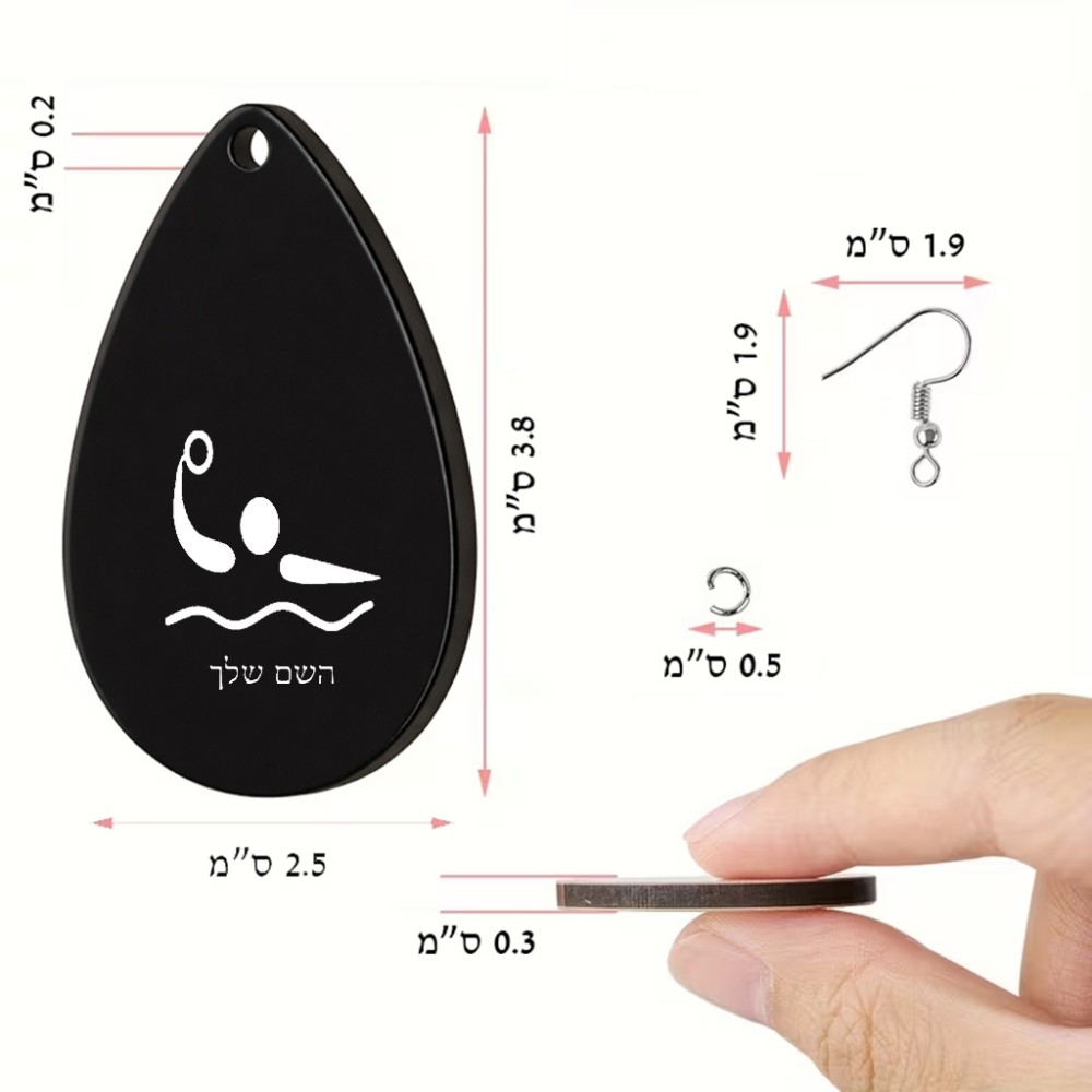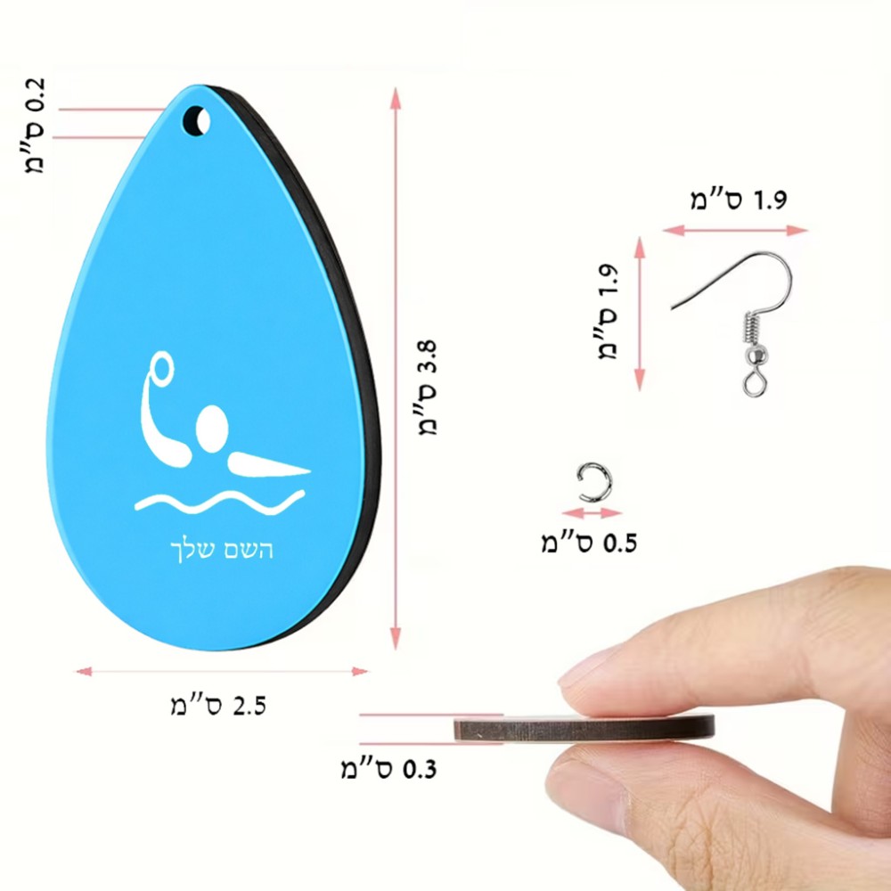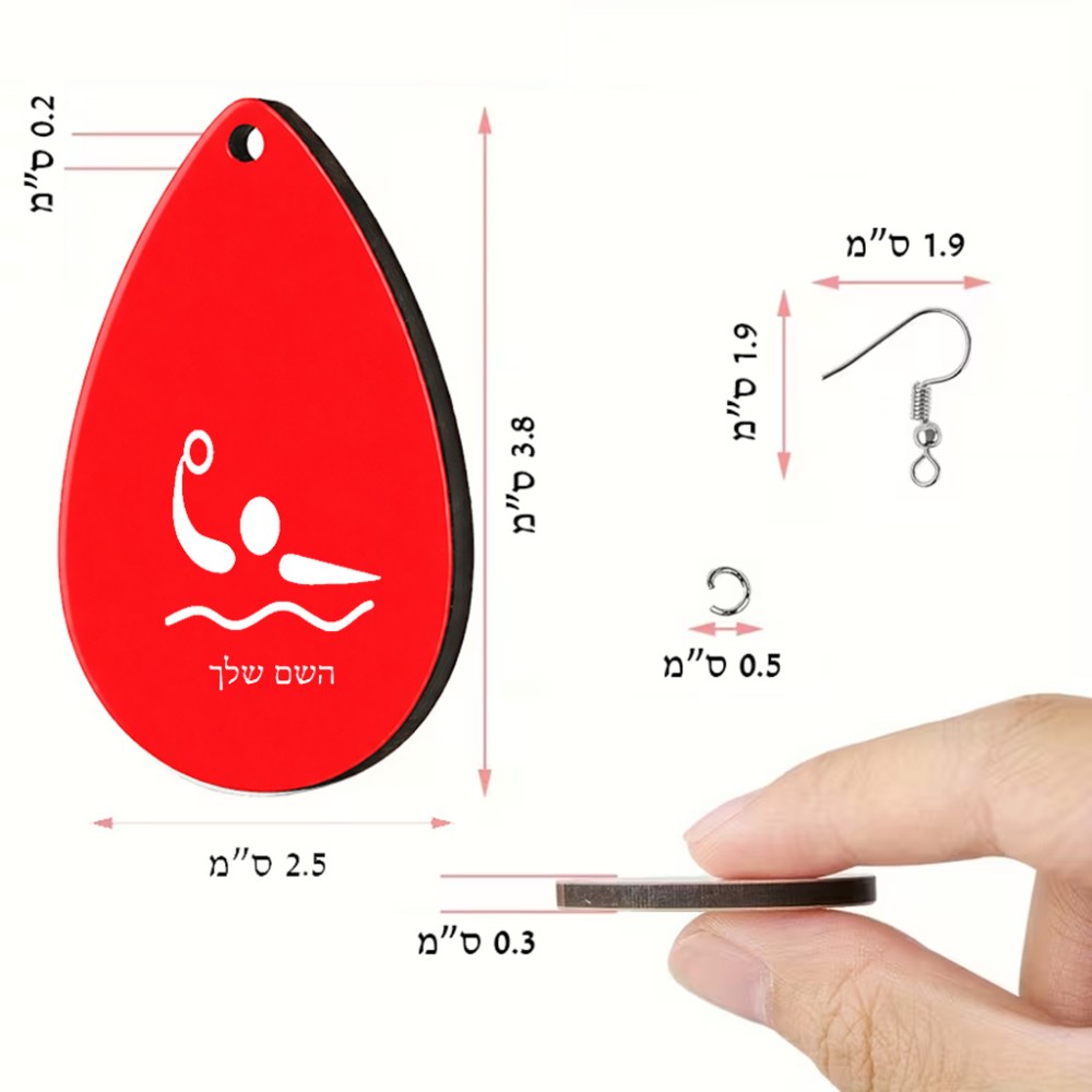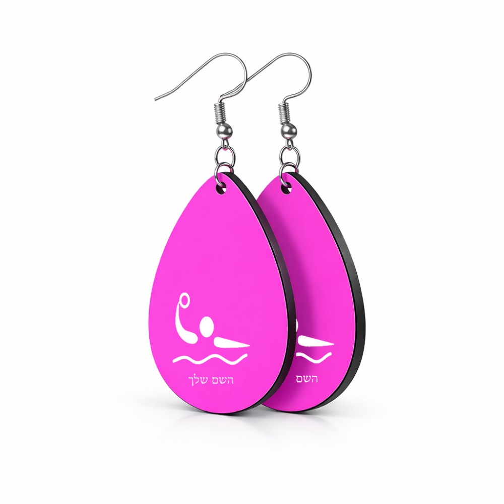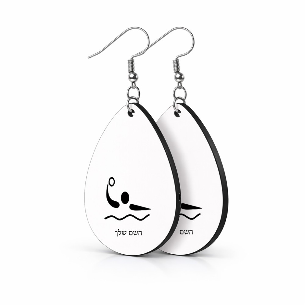 זוג עגילים בצורת טיפה בעיצוב אישי עם השם שלך בעיצוב כדור מים אולימפי גודל העגילים 2.5 × 3.8 ס"מ. את השם המבוקש ניתן לציין בהזמנה, אם לא צויין אנחנו ניצור קשר לבירור.