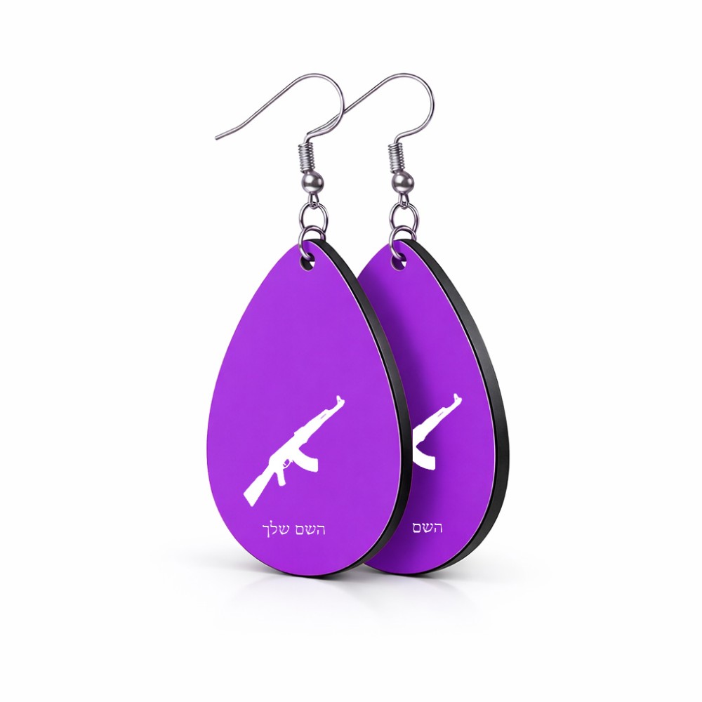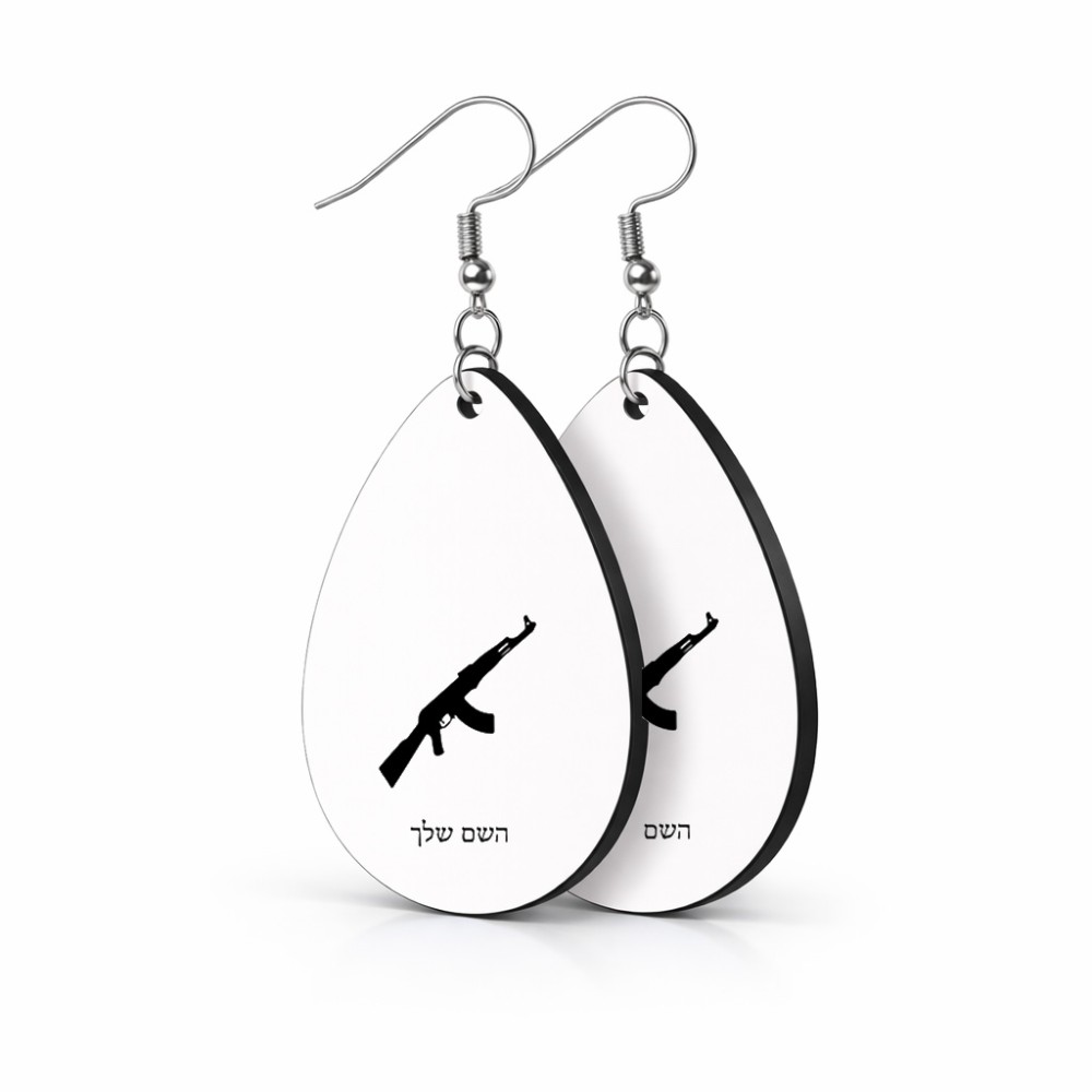 זוג עגילים בצורת טיפה בעיצוב אישי עם השם שלך בעיצוב אק 47 גודל העגילים 2.5 × 3.8 ס"מ. את השם המבוקש ניתן לציין בהזמנה, אם לא צויין אנחנו ניצור קשר לבירור.