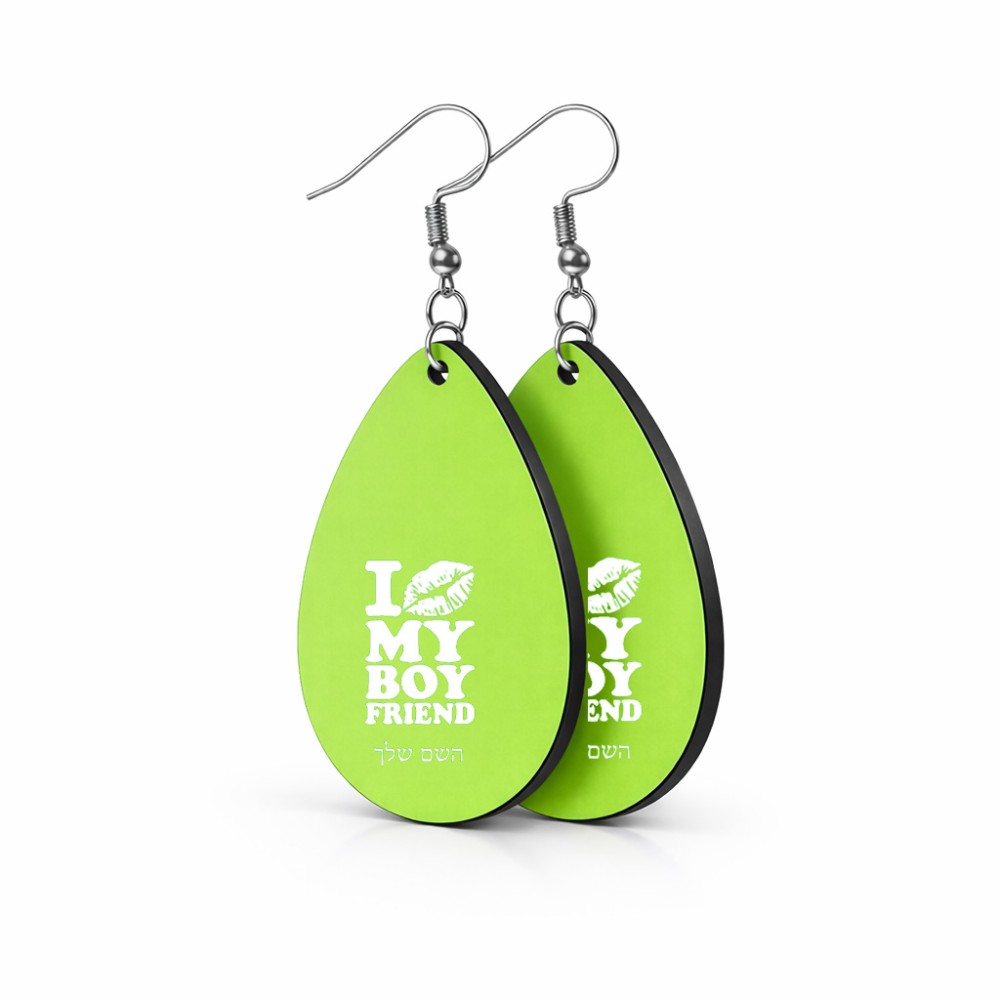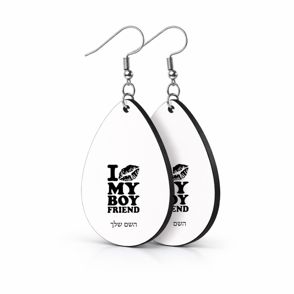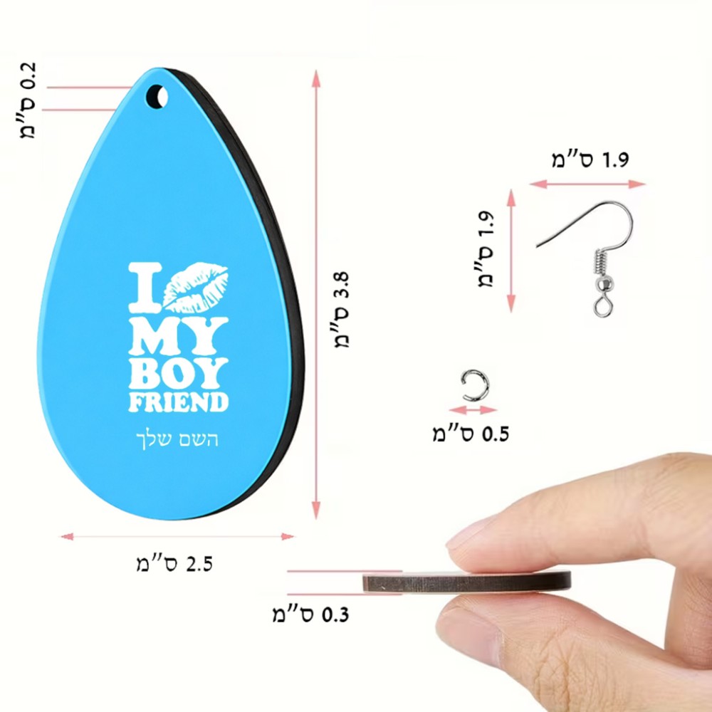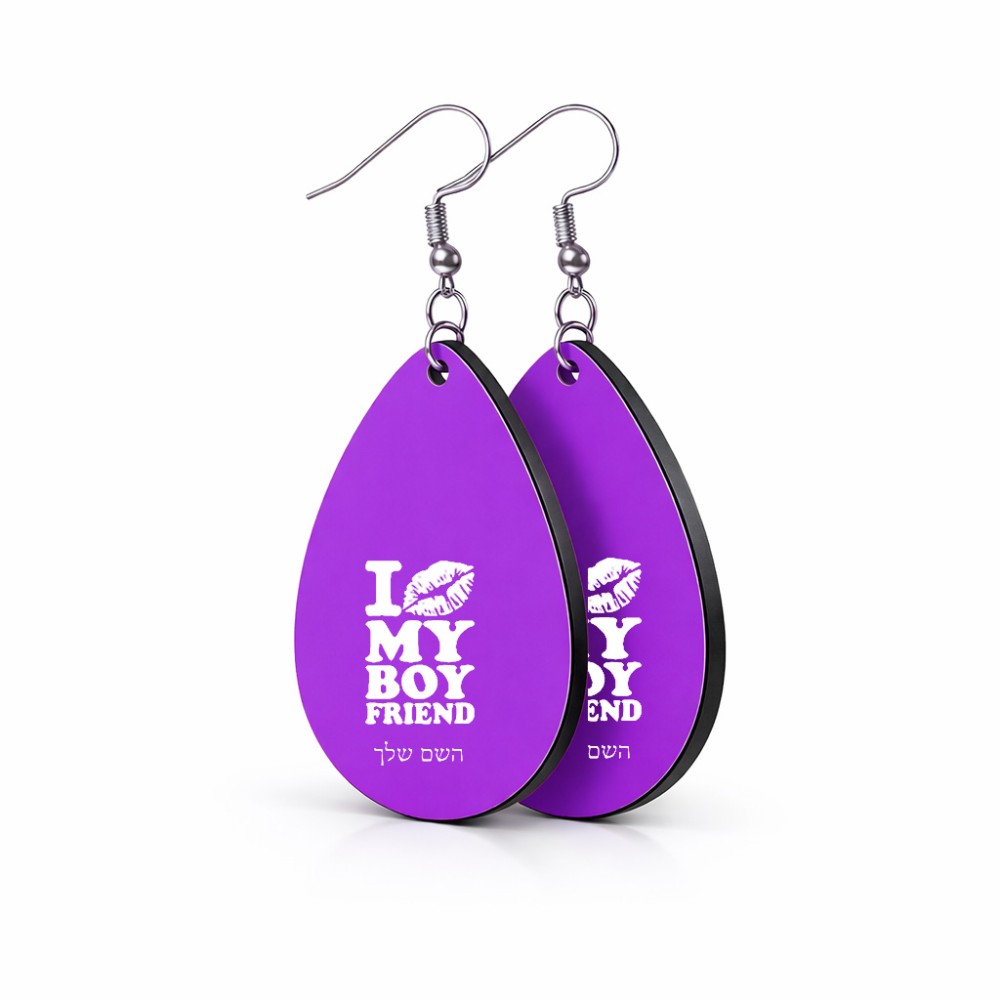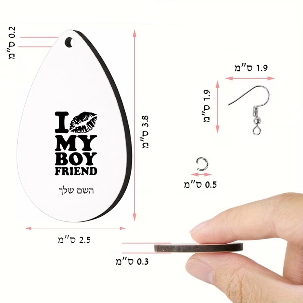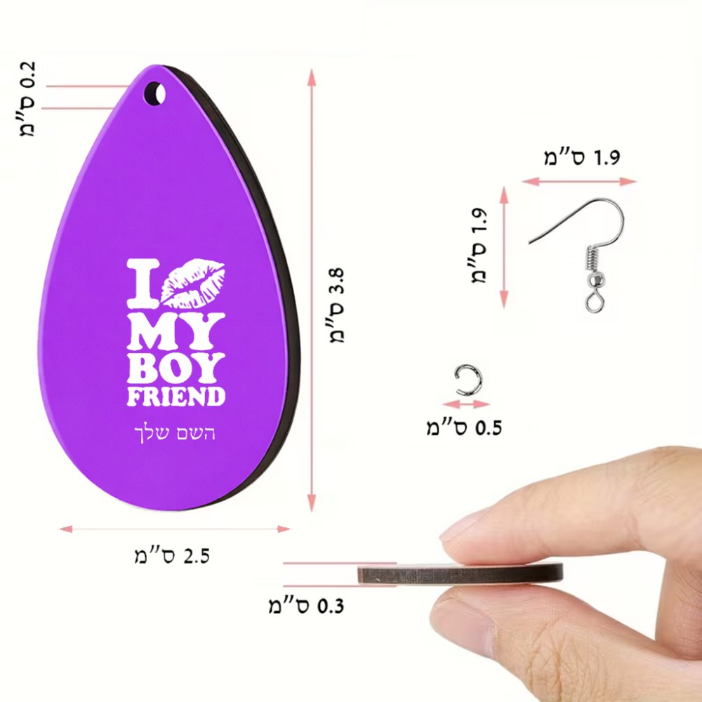 זוג עגילים בצורת טיפה בעיצוב אישי עם השם שלך בעיצוב נשקי את חבר שלי גודל העגילים 2.5 × 3.8 ס"מ. את השם המבוקש ניתן לציין בהזמנה, אם לא צויין אנחנו ניצור קשר לבירור.