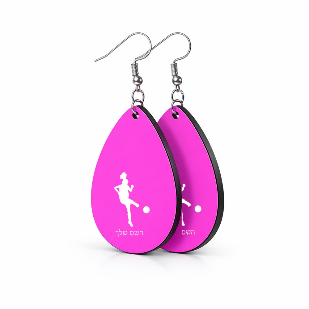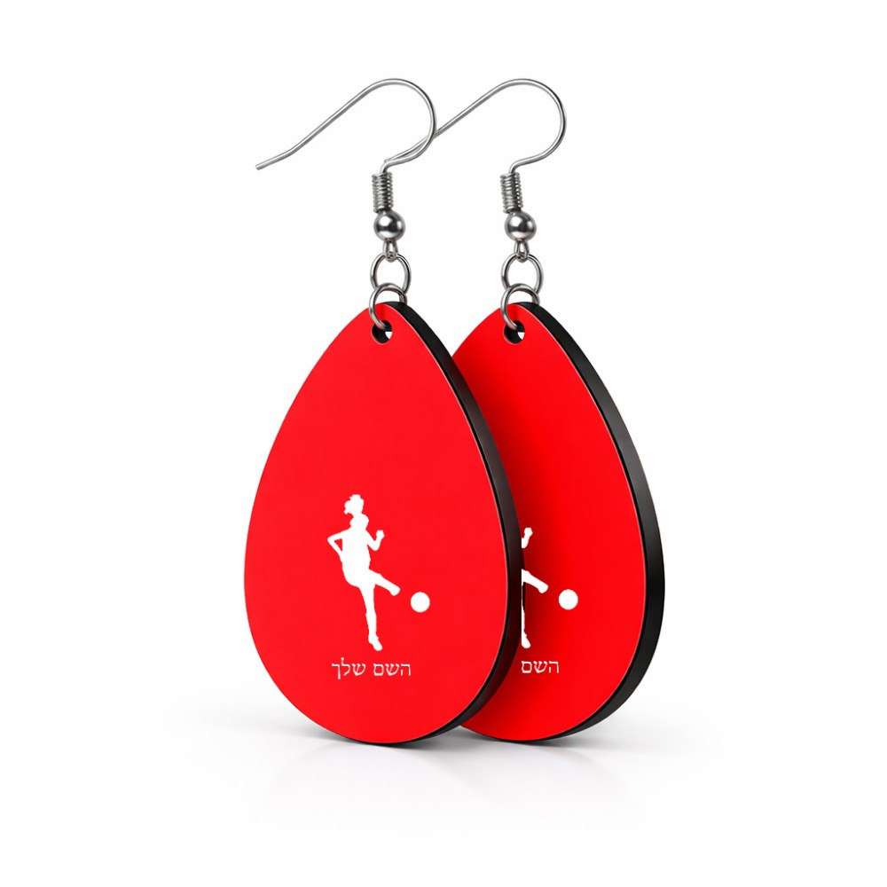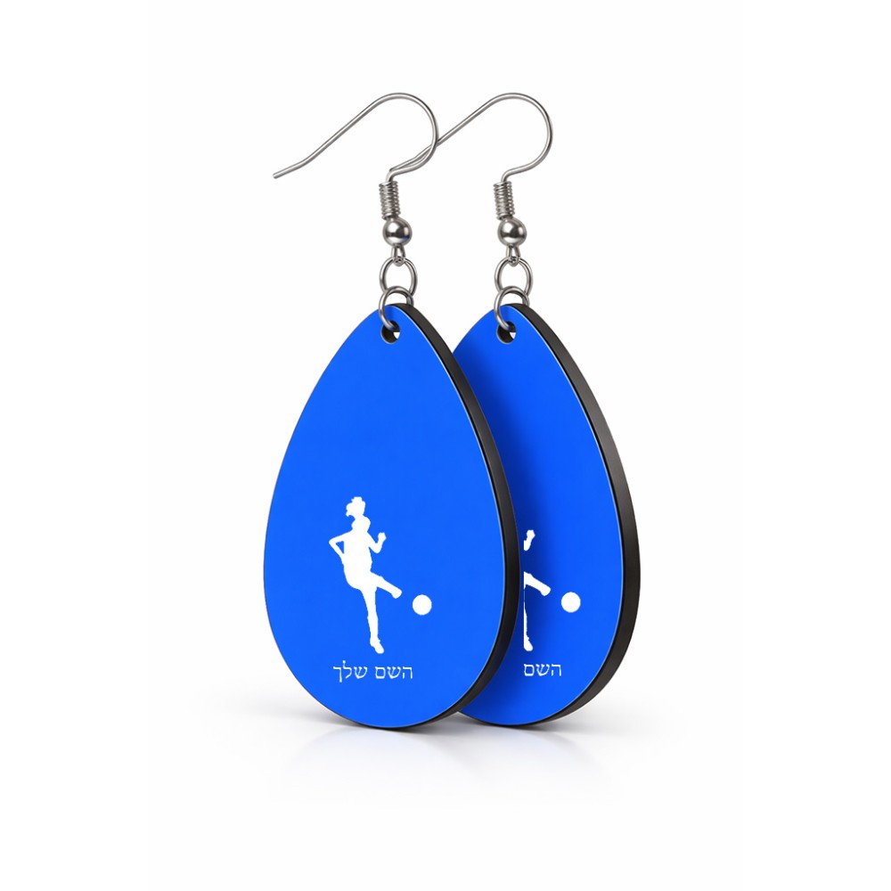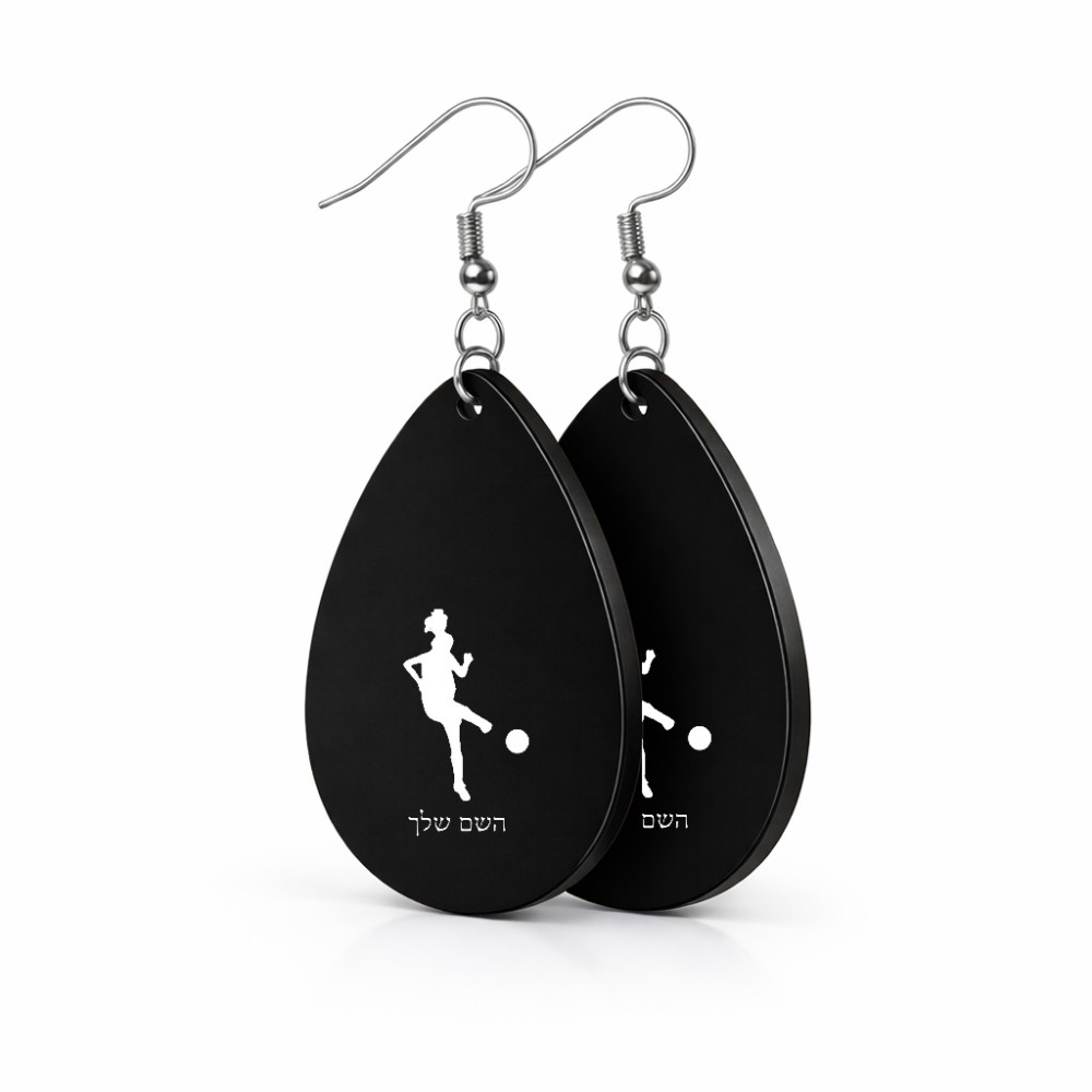 זוג עגילים בצורת טיפה בעיצוב אישי עם השם שלך בעיצוב שחקנית כדורגל - אישה גודל העגילים 2.5 × 3.8 ס"מ. את השם המבוקש ניתן לציין בהזמנה, אם לא צויין אנחנו ניצור קשר לבירור.