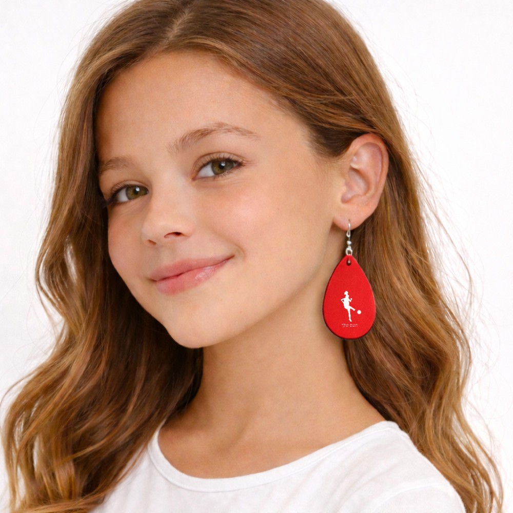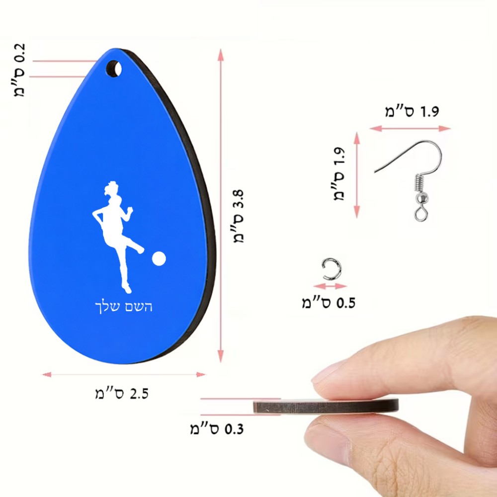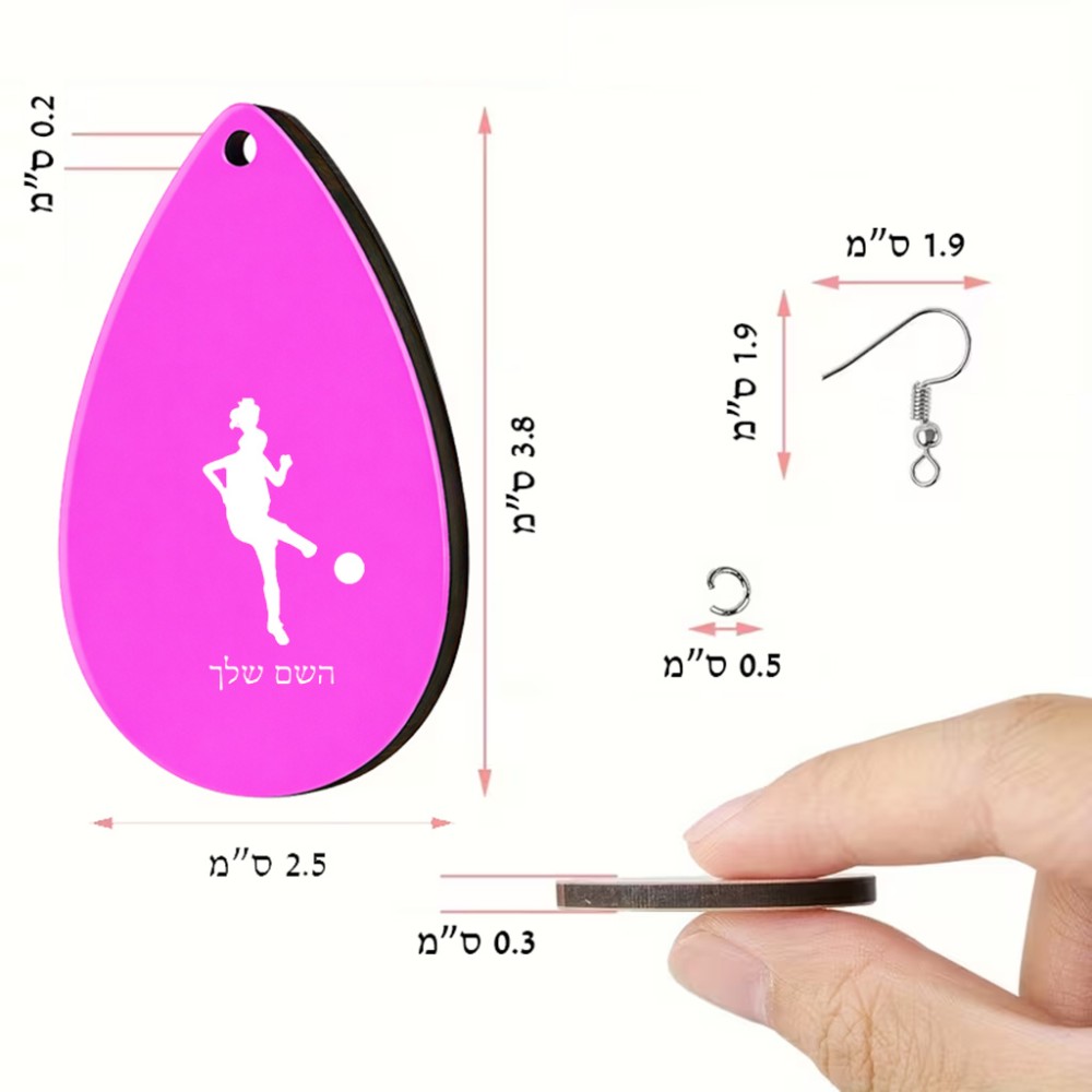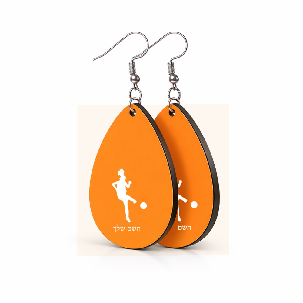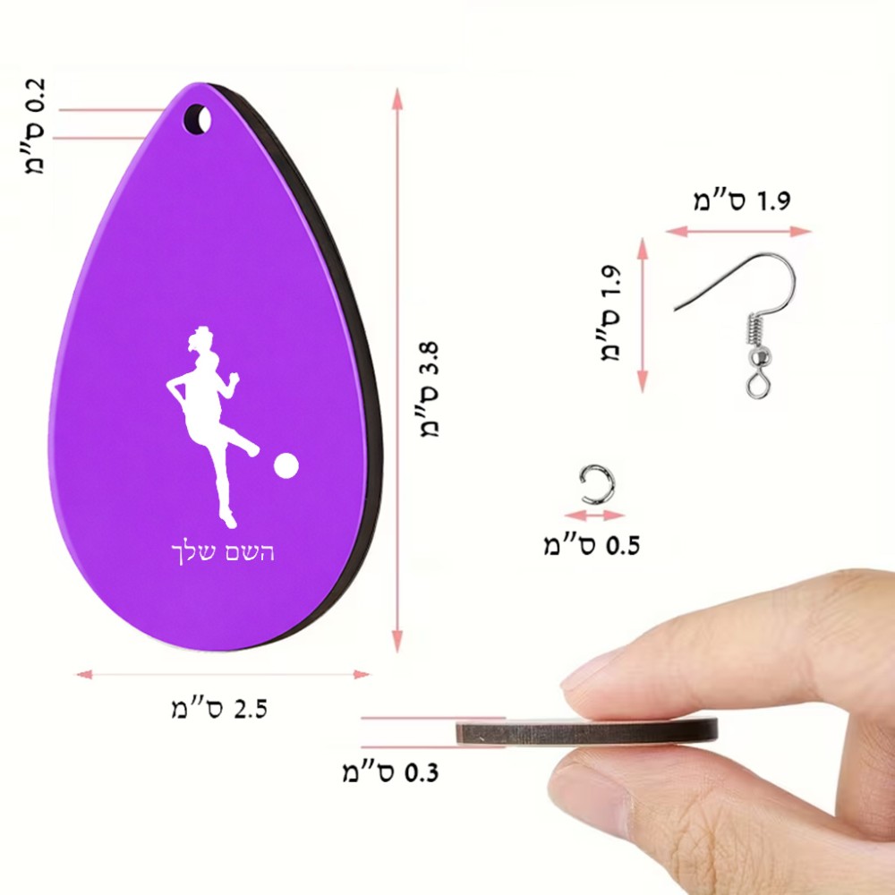 זוג עגילים בצורת טיפה בעיצוב אישי עם השם שלך בעיצוב שחקנית כדורגל - אישה גודל העגילים 2.5 × 3.8 ס"מ. את השם המבוקש ניתן לציין בהזמנה, אם לא צויין אנחנו ניצור קשר לבירור.