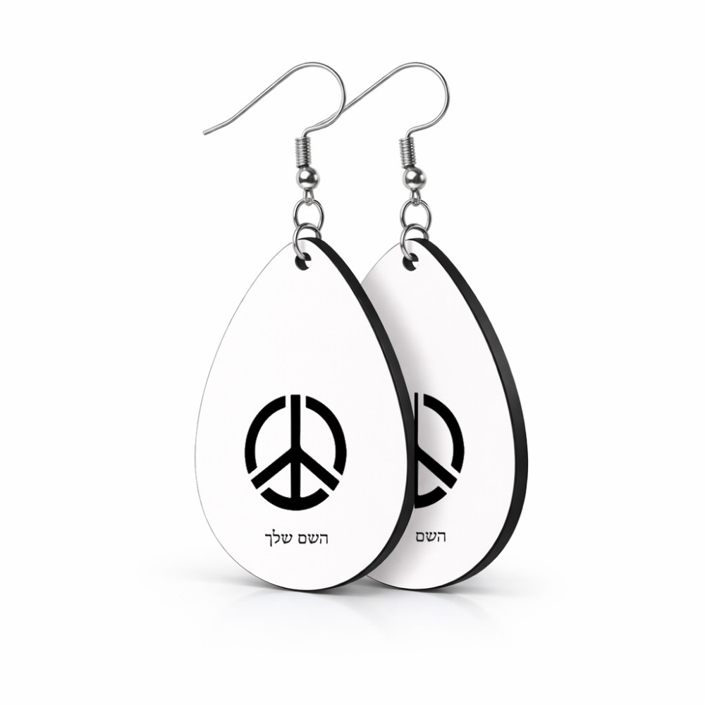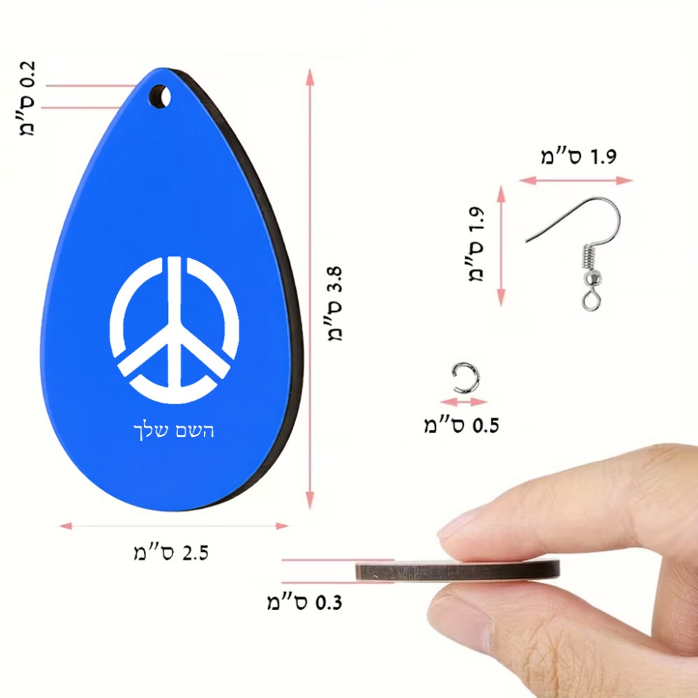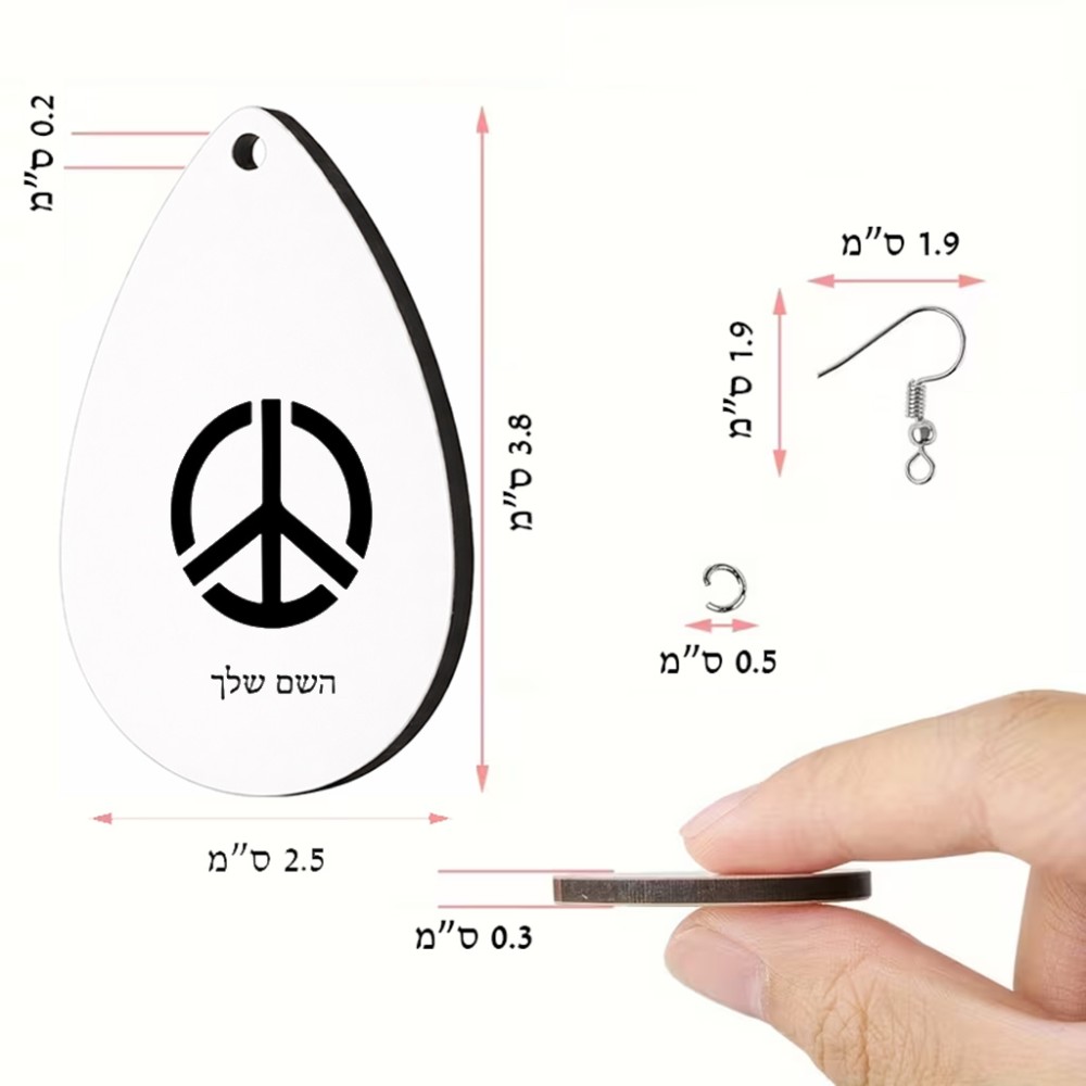 זוג עגילים בצורת טיפה בעיצוב אישי עם השם שלך בעיצוב סמל השלום גודל העגילים 2.5 × 3.8 ס"מ. את השם המבוקש ניתן לציין בהזמנה, אם לא צויין אנחנו ניצור קשר לבירור.