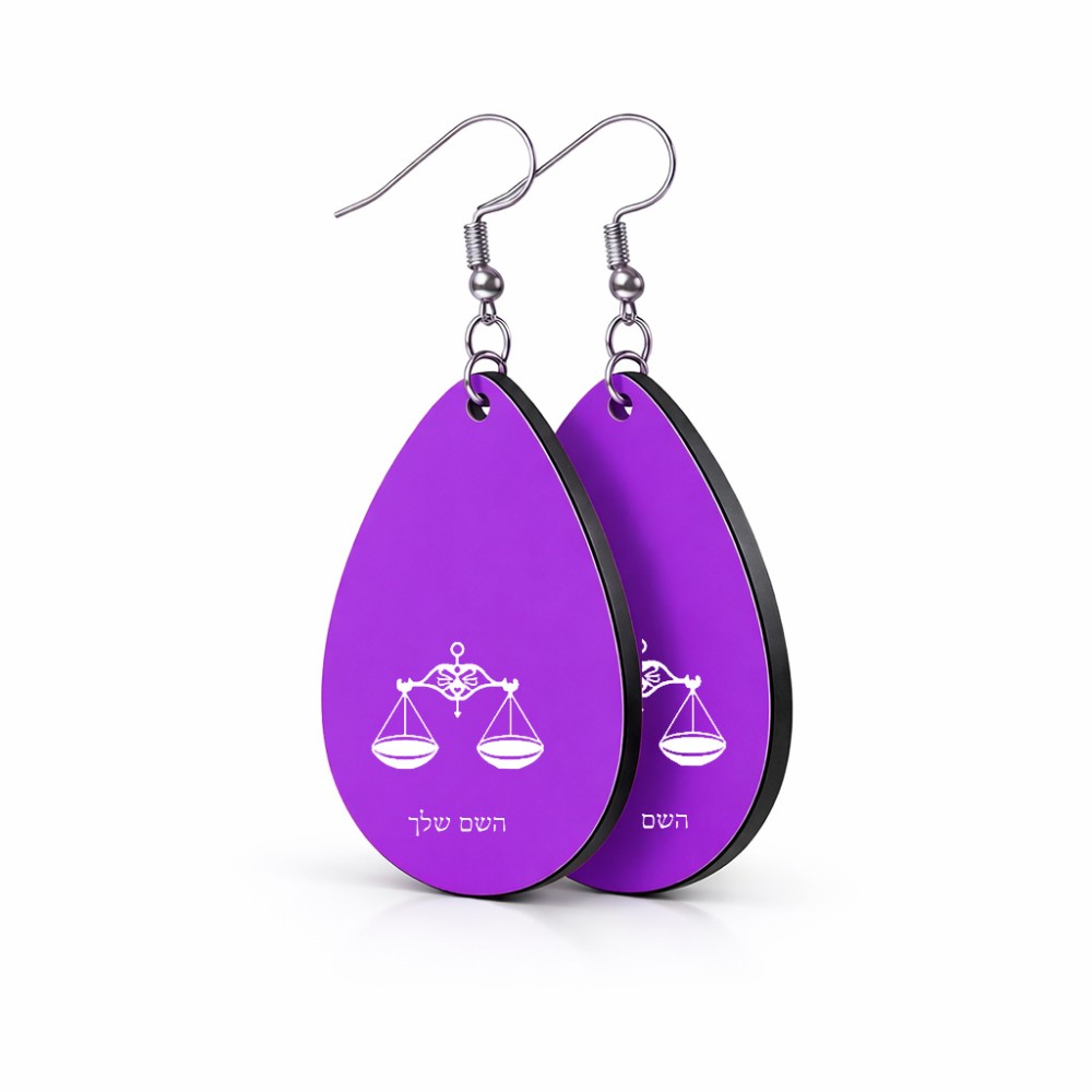 זוג עגילים בצורת טיפה בעיצוב אישי עם השם שלך בעיצוב מזלות - מאזניים גודל העגילים 2.5 × 3.8 ס"מ. את השם המבוקש ניתן לציין בהזמנה, אם לא צויין אנחנו ניצור קשר לבירור.