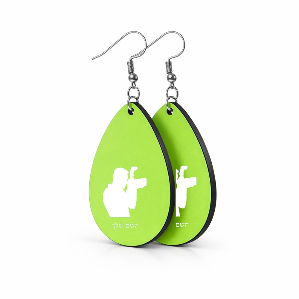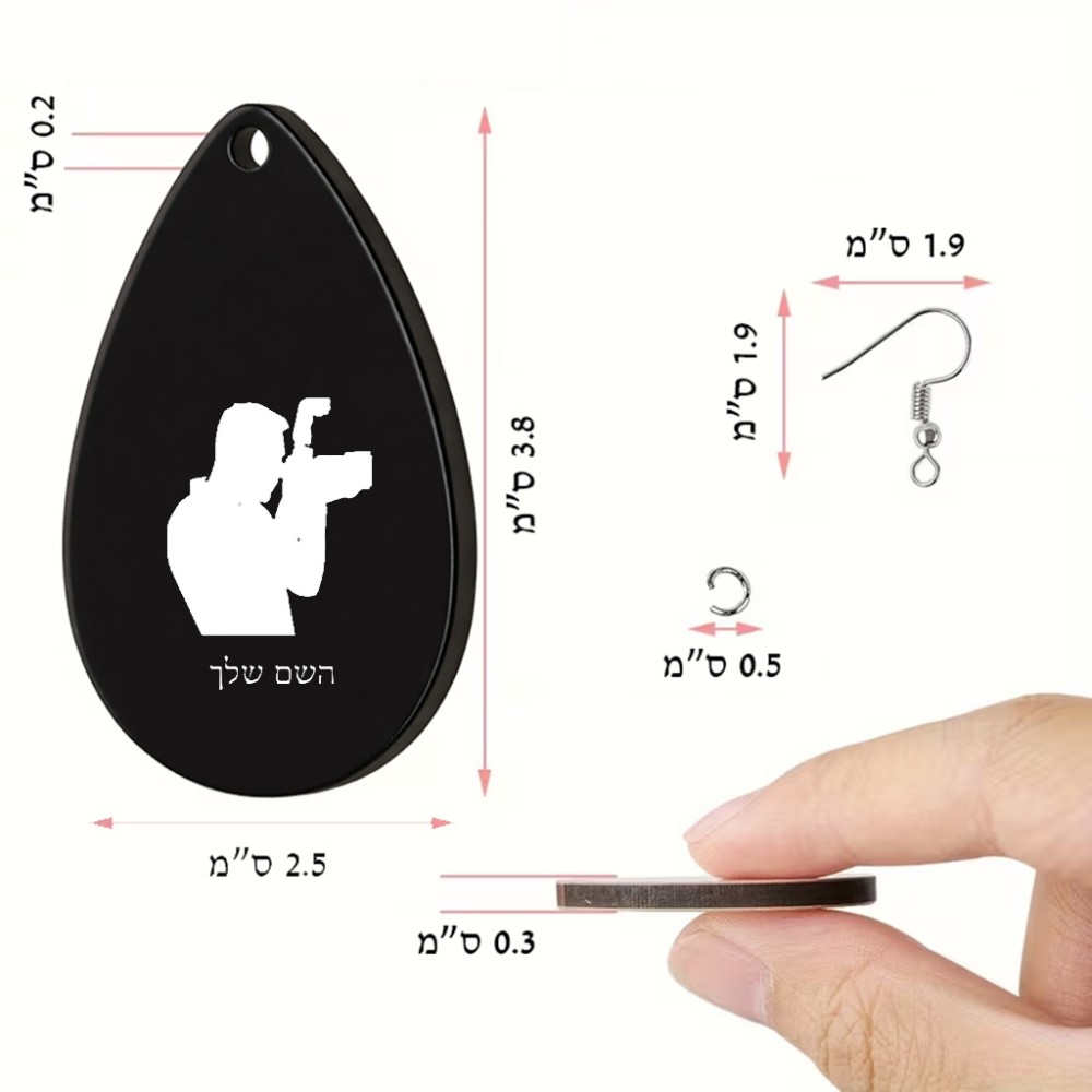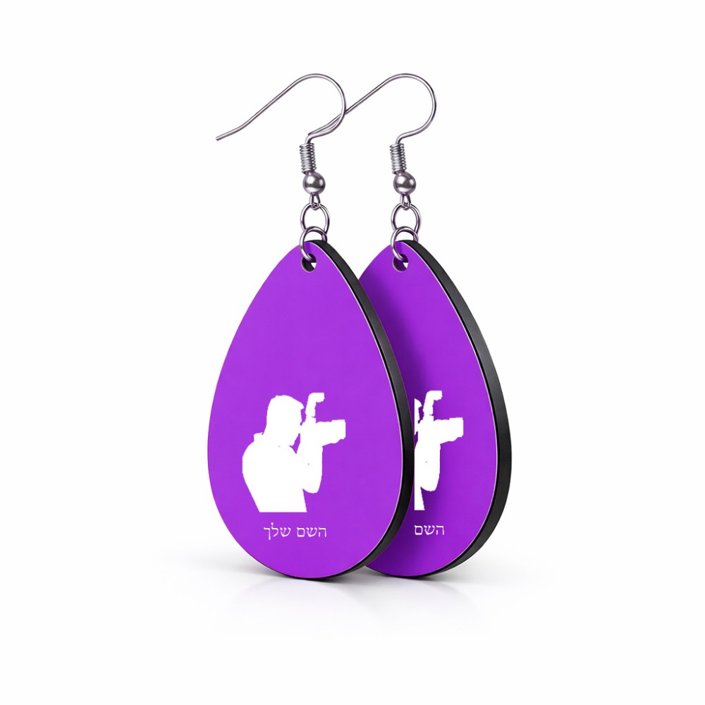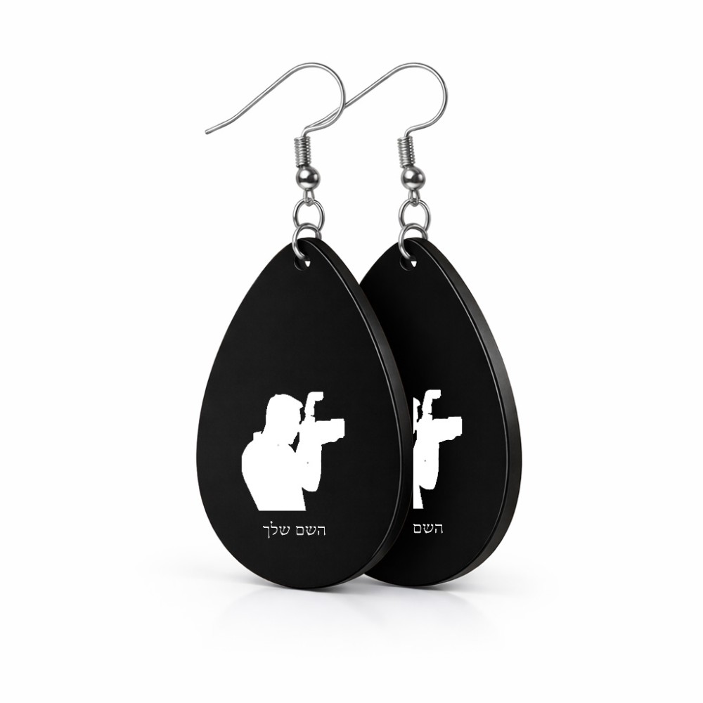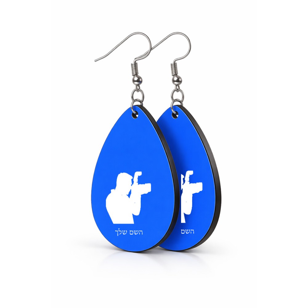 זוג עגילים בצורת טיפה בעיצוב אישי עם השם שלך בעיצוב צלם - גברים גודל העגילים 2.5 × 3.8 ס"מ. את השם המבוקש ניתן לציין בהזמנה, אם לא צויין אנחנו ניצור קשר לבירור.