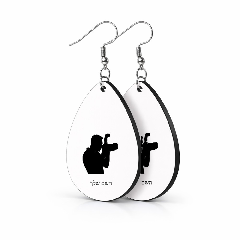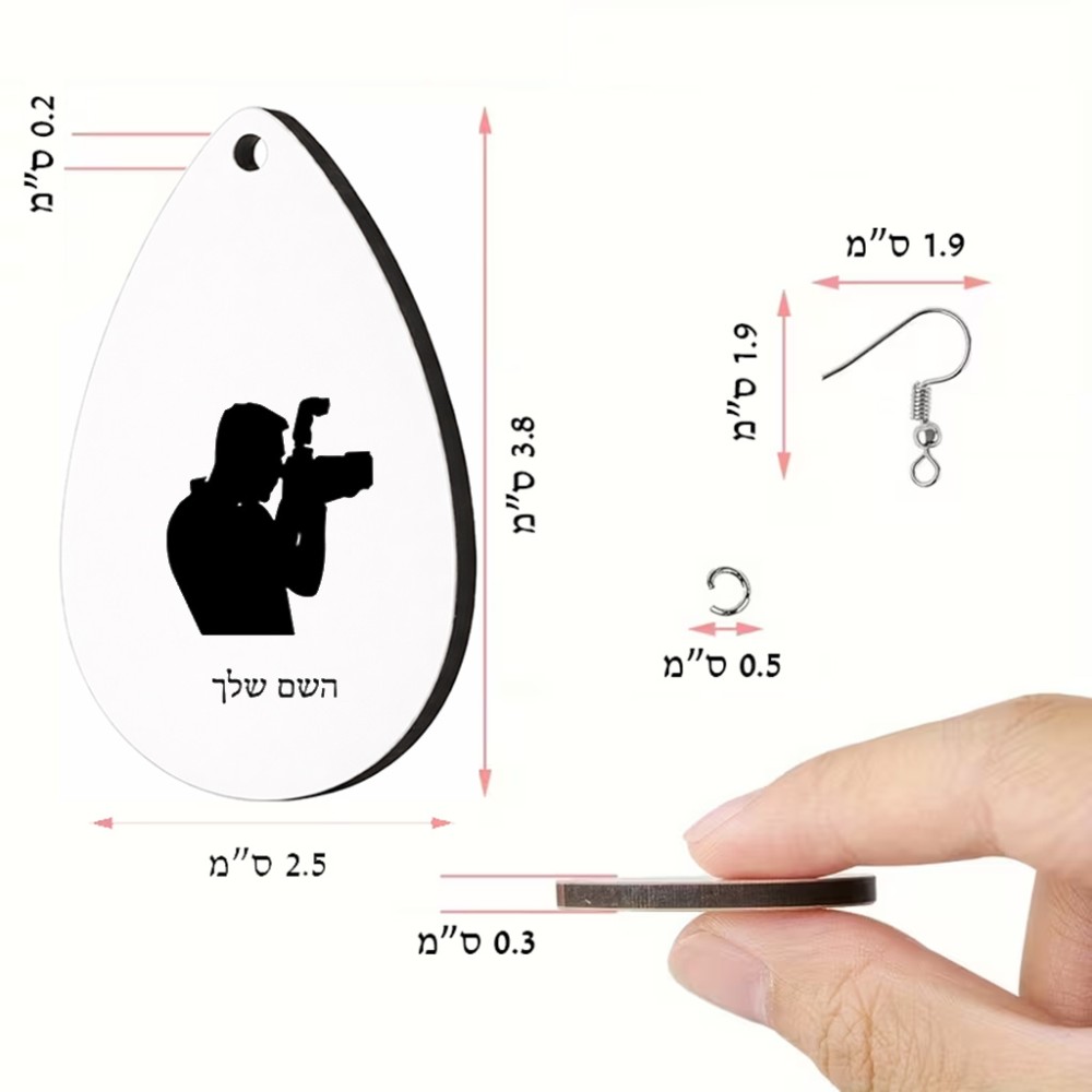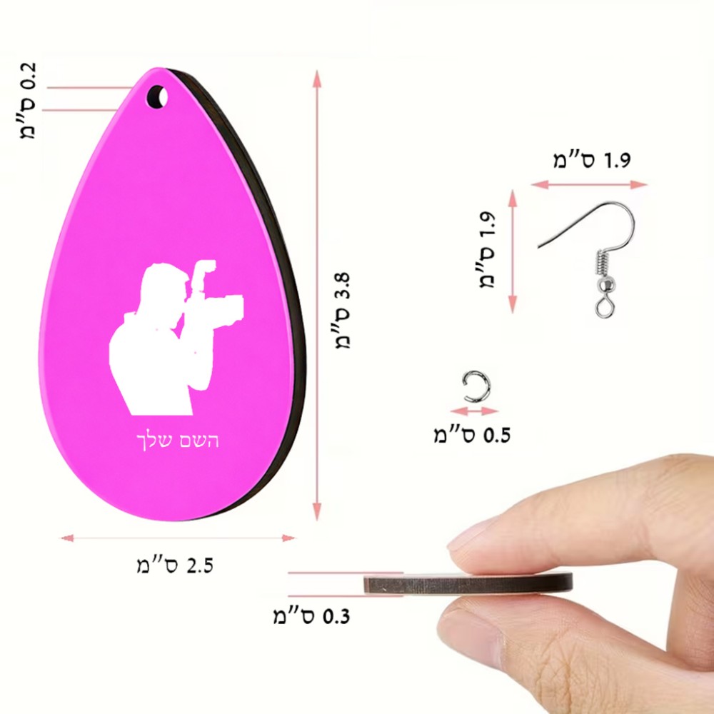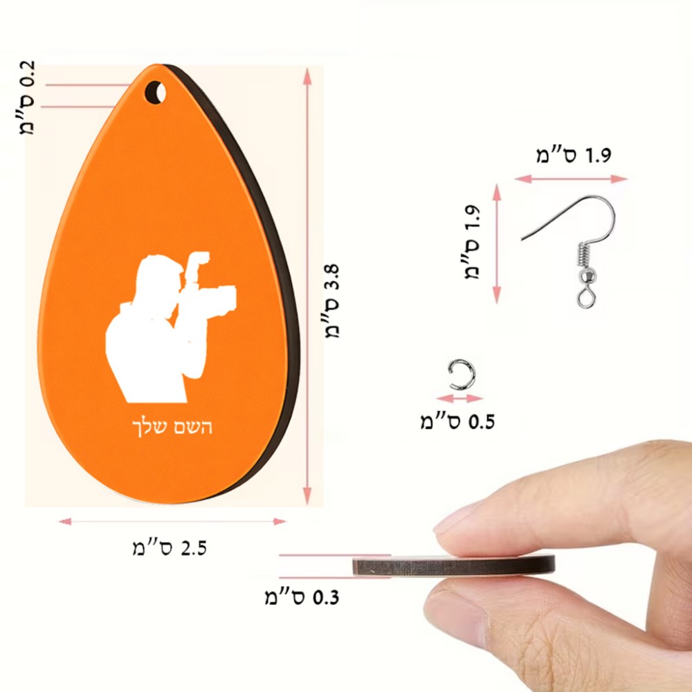 זוג עגילים בצורת טיפה בעיצוב אישי עם השם שלך בעיצוב צלם - גברים גודל העגילים 2.5 × 3.8 ס"מ. את השם המבוקש ניתן לציין בהזמנה, אם לא צויין אנחנו ניצור קשר לבירור.